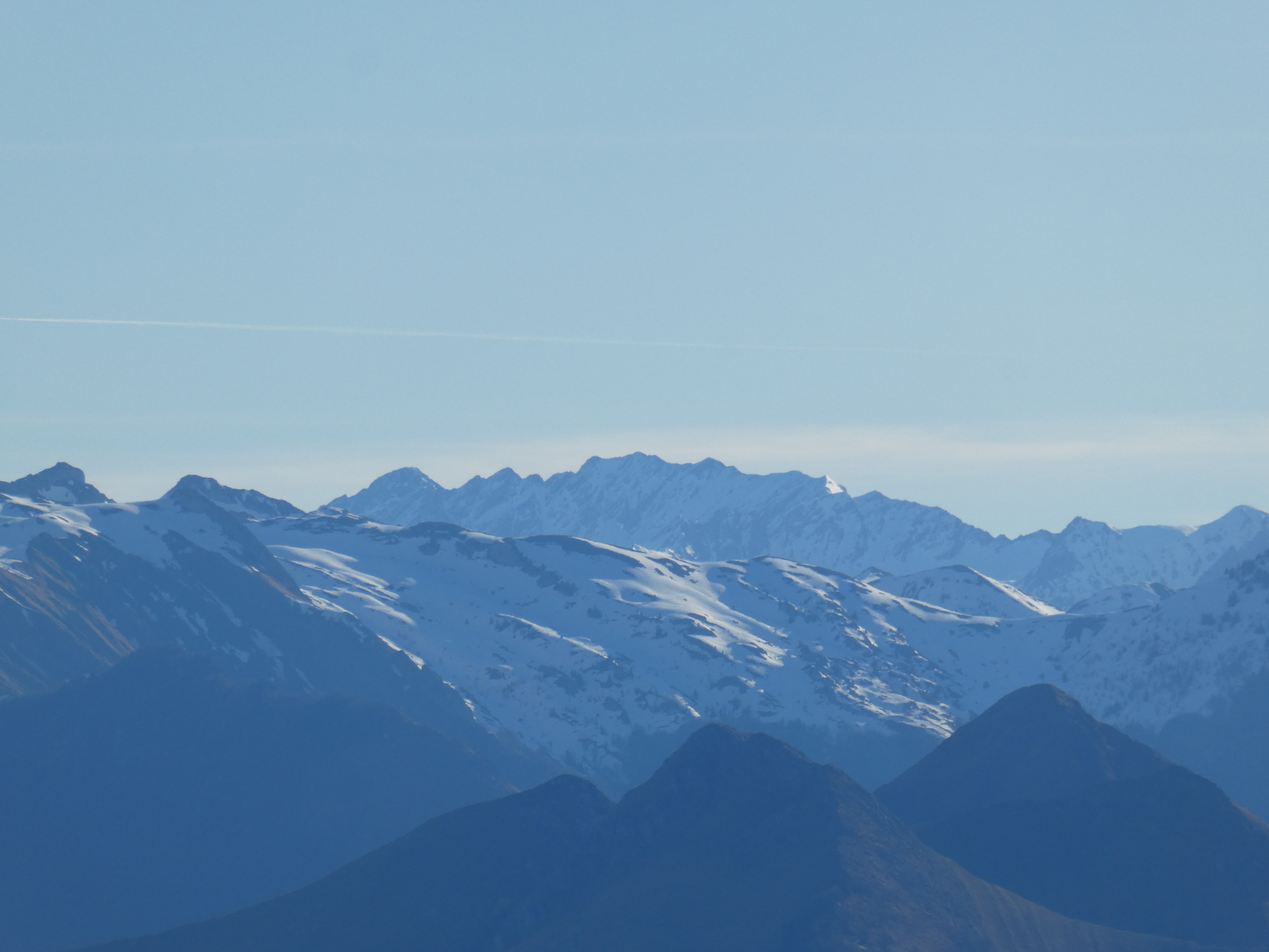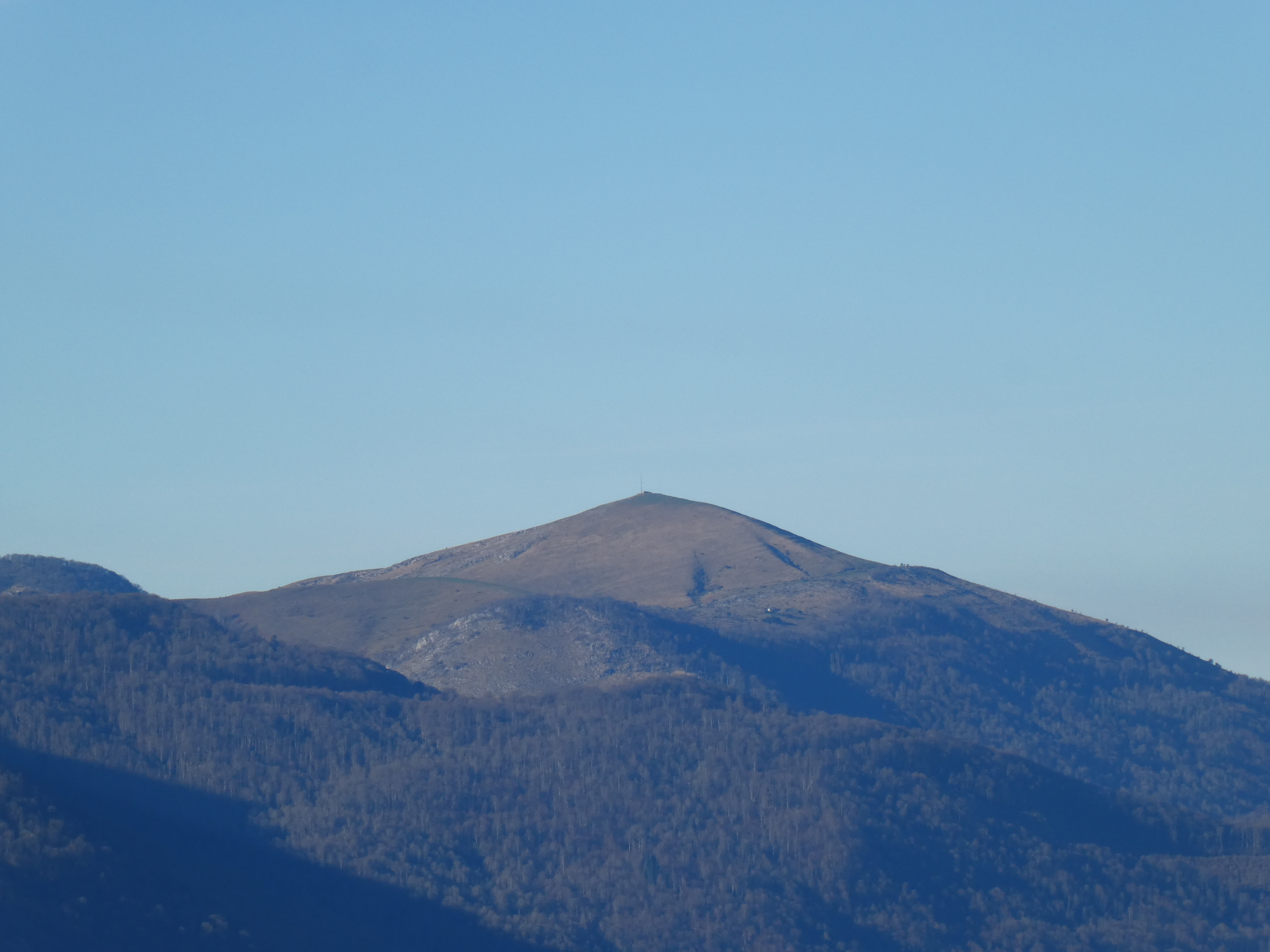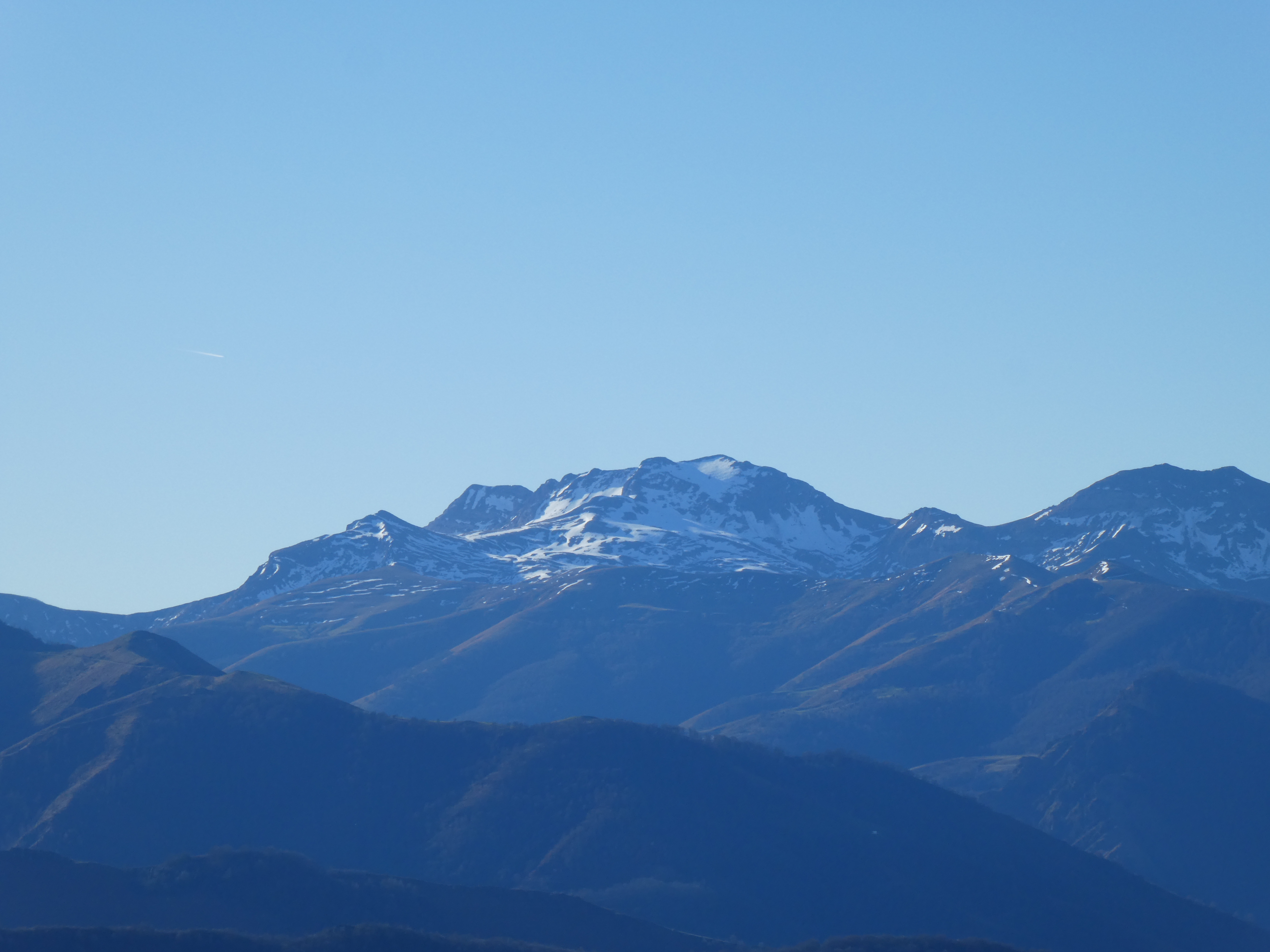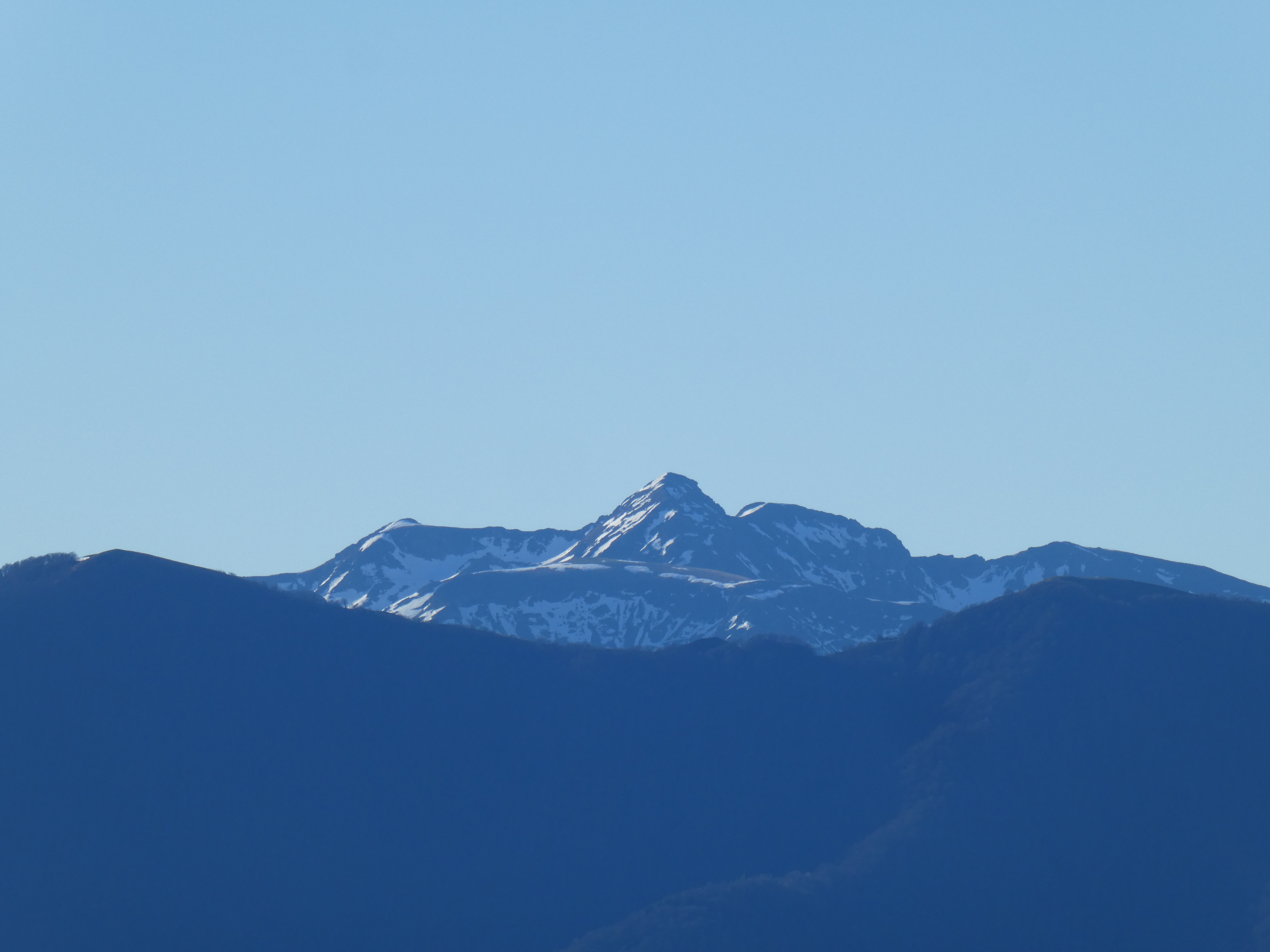 Zoom sur le Pic d'Escurets (1440 m) dominant le Piémont Oloronais ... on aperçoit également le Pic du Midi de Bigorre (2877 m) à droite situé à 83 kilomètres