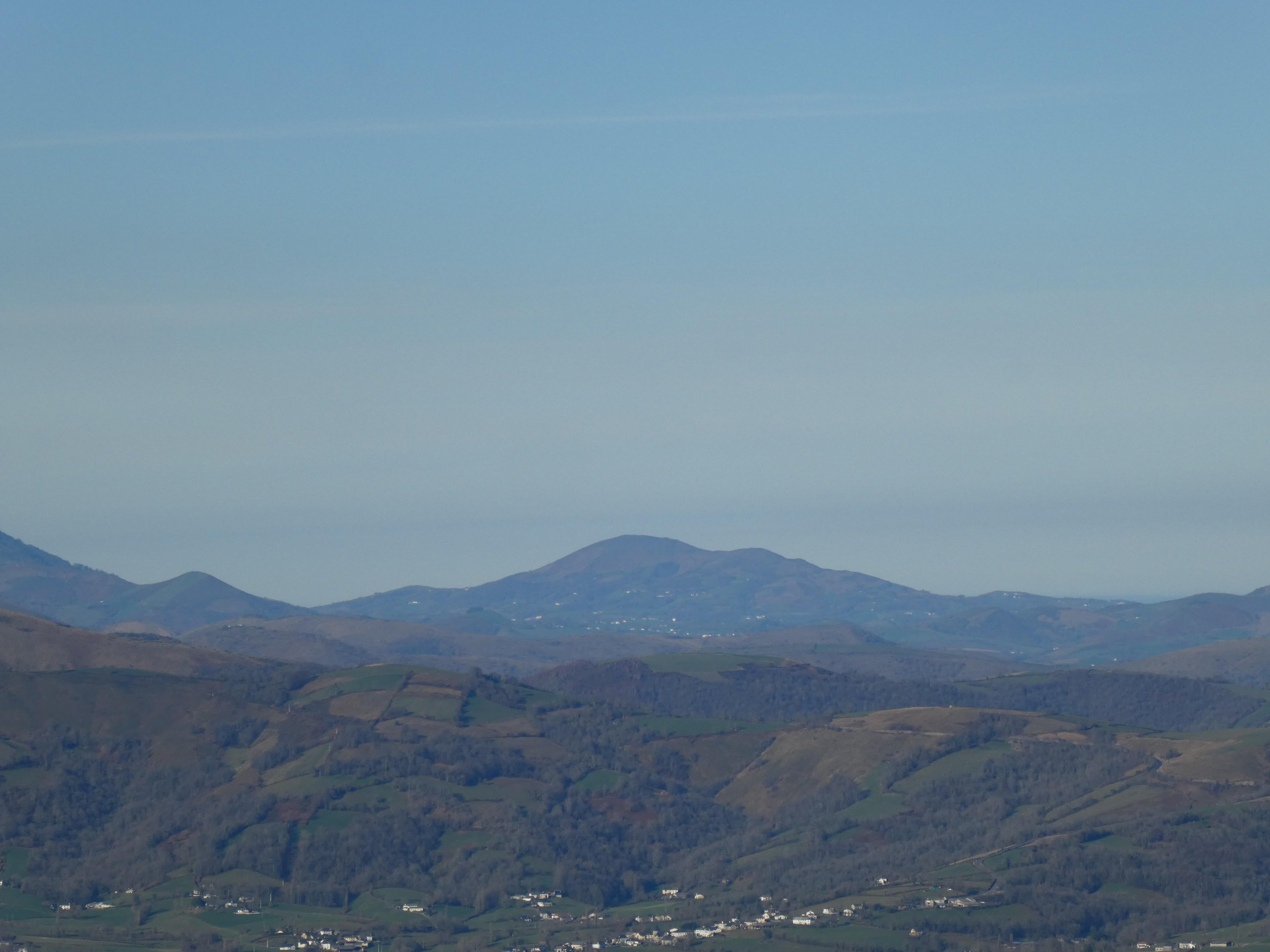 Zoom sur le Buztanzelhai (1030 m) à gauche, la crête du Gorramendi (1071 m) au centre-gauche, le Pic d'Iparla (1049 m) au centre et la Rhune (900 m) à droite