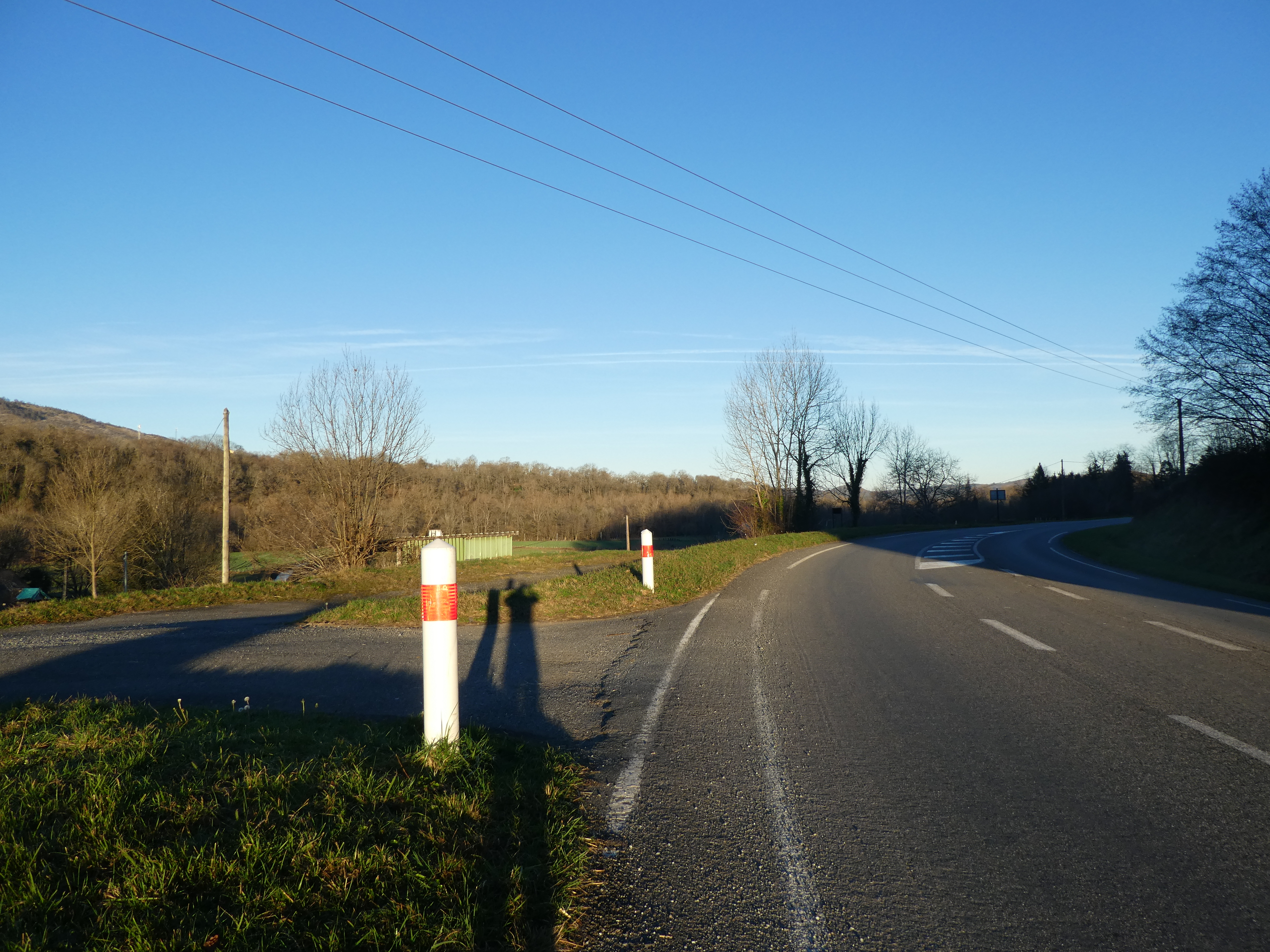 A cette intersection (800 mètres après le départ) (222 m), quitter la D918 pour suivre la petite route descendant sur la gauche et longeant la D918 en contrebas direction Trois-Villes (on évite ainsi de marcher au bord de la D918 jusqu'à Trois-Villes)