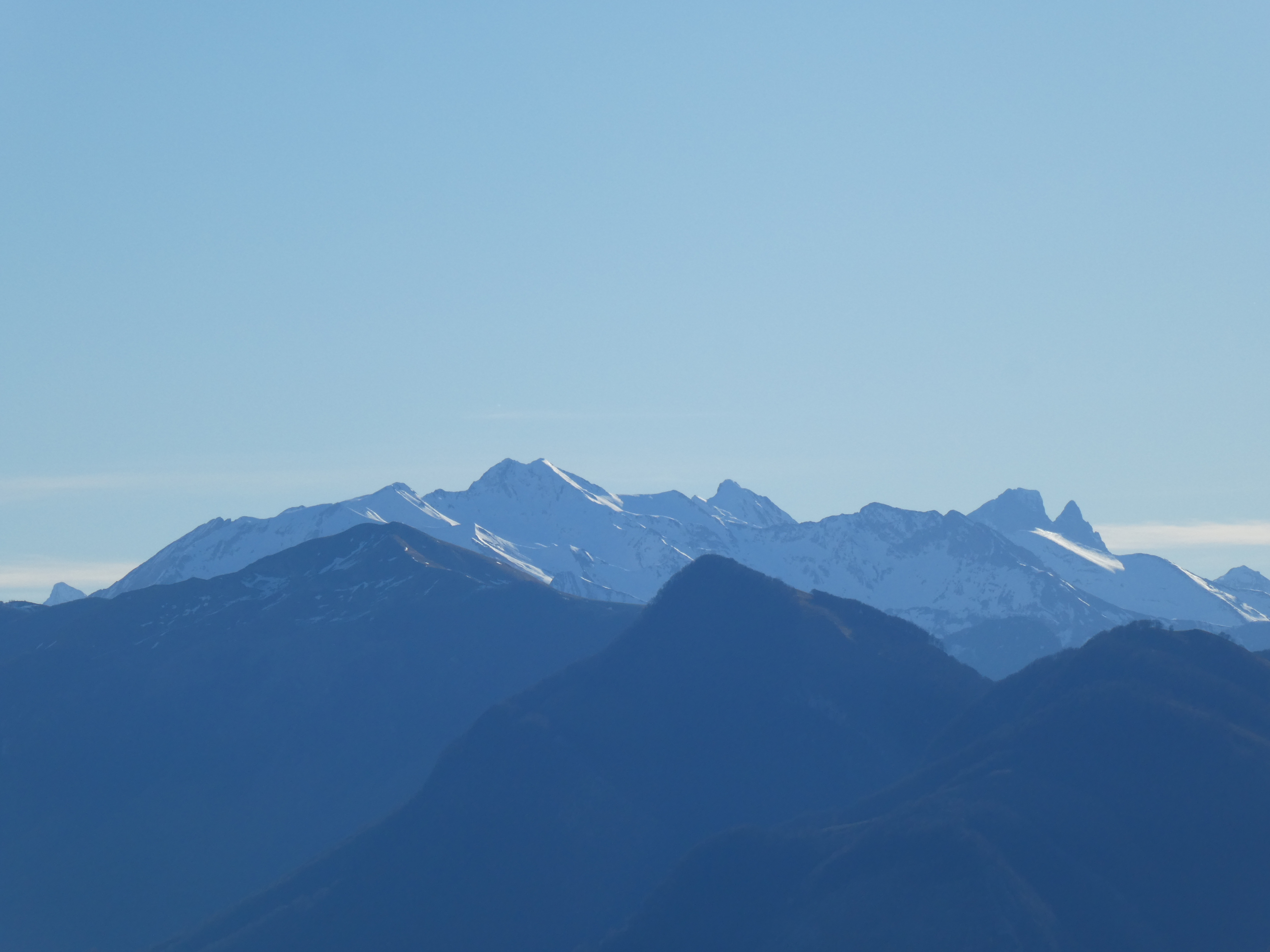 Zoom sur le Pic d'Isabe (2463 m) et le Pic de Sesques (2606 m) au centre-gauche, le Soum de Moundaut (2526 m) au centre et le Pic du Midi d'Ossau (2884 m) à droite