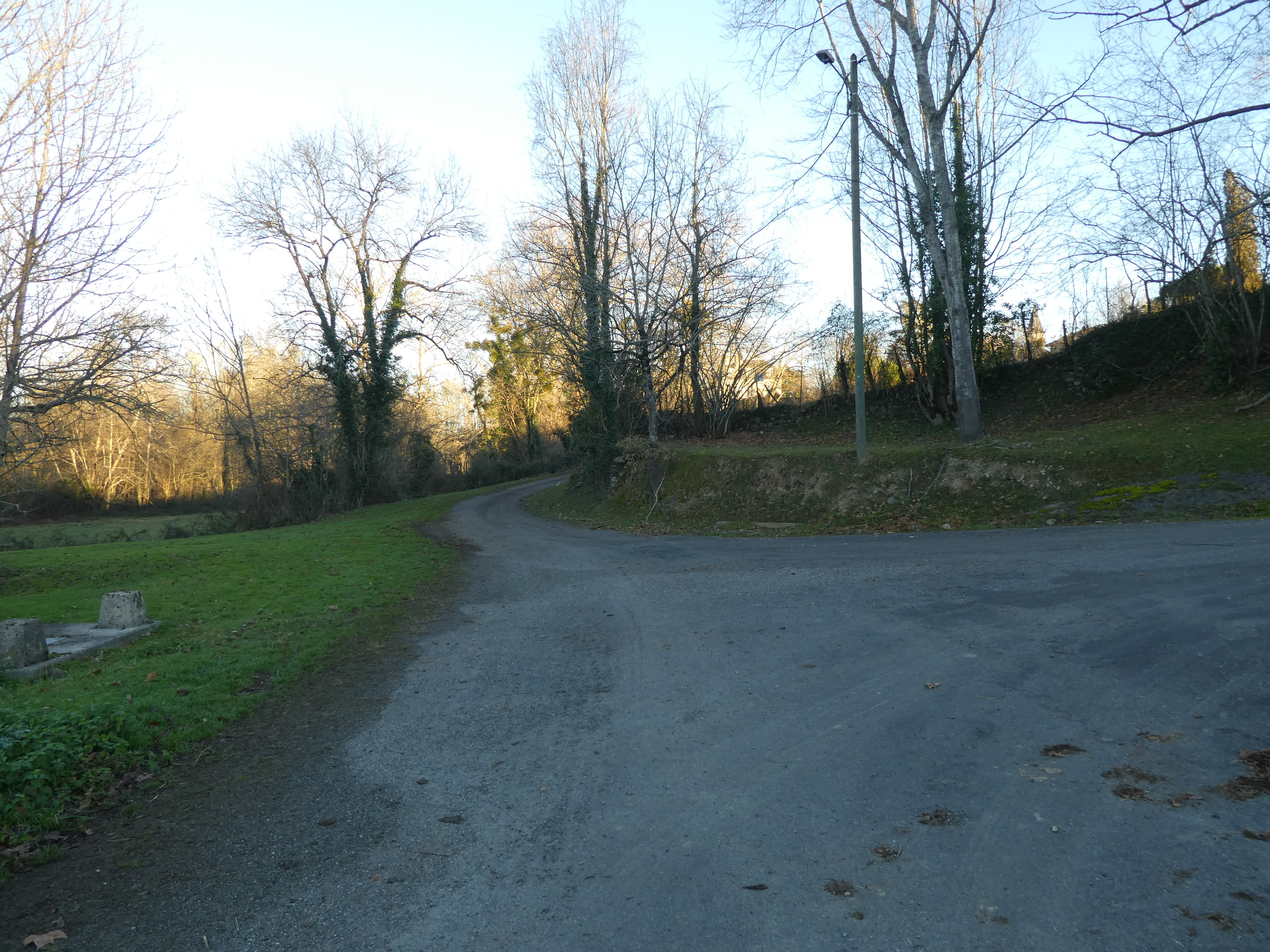 A cette intersection (700 mètres après avoir quitté la D918), suivre la route partant tout droit vers le fronton de Trois-Villes direction Trois-Villes