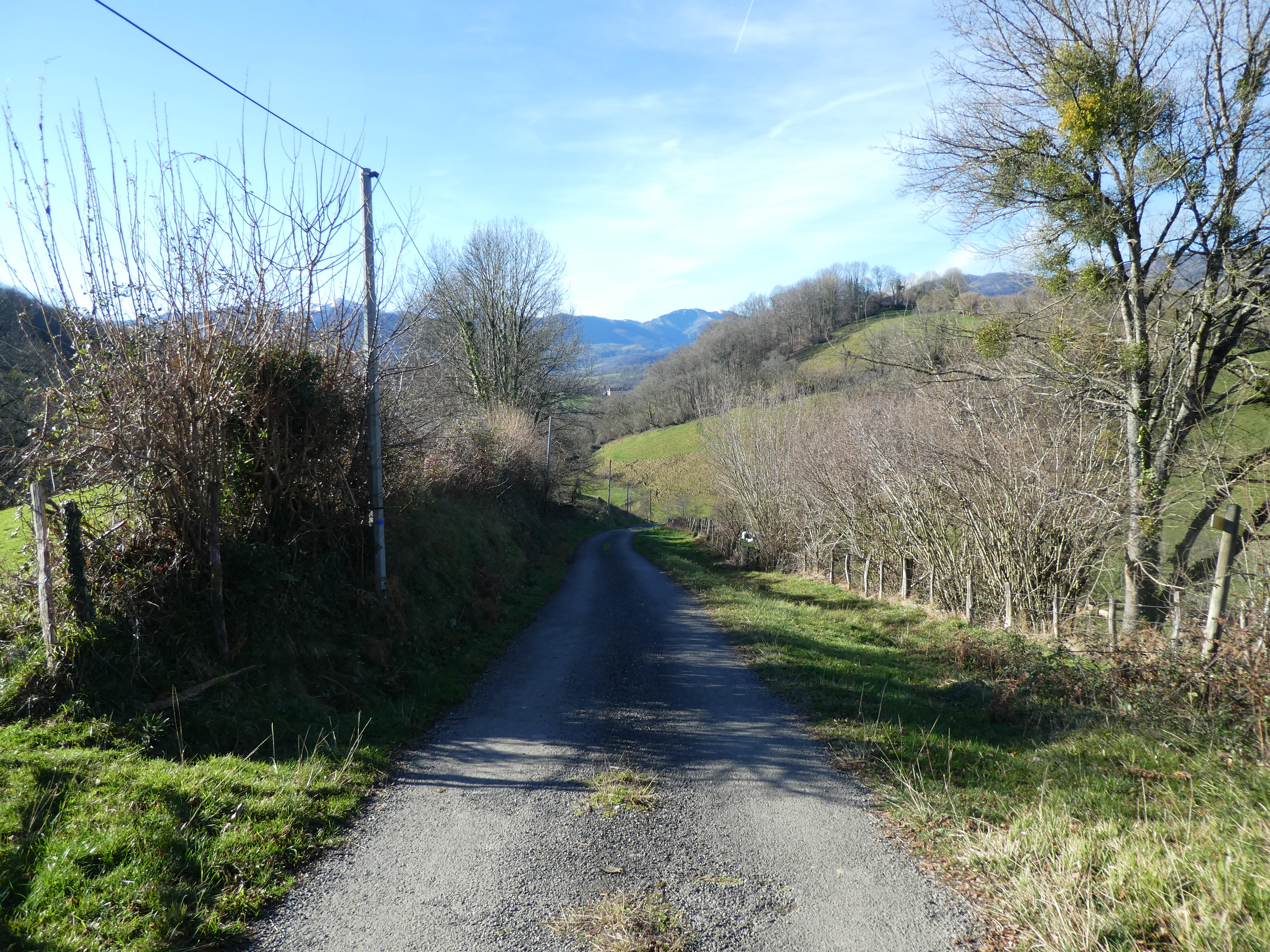 A ce croisement marqué par la présence d'un piquet en bois balisé en jaune (1300 mètres après le précédent) (322 m), suivre le chemin partant tout droit direction Tardets-Sorholus, balisé sporadiquement en jaune