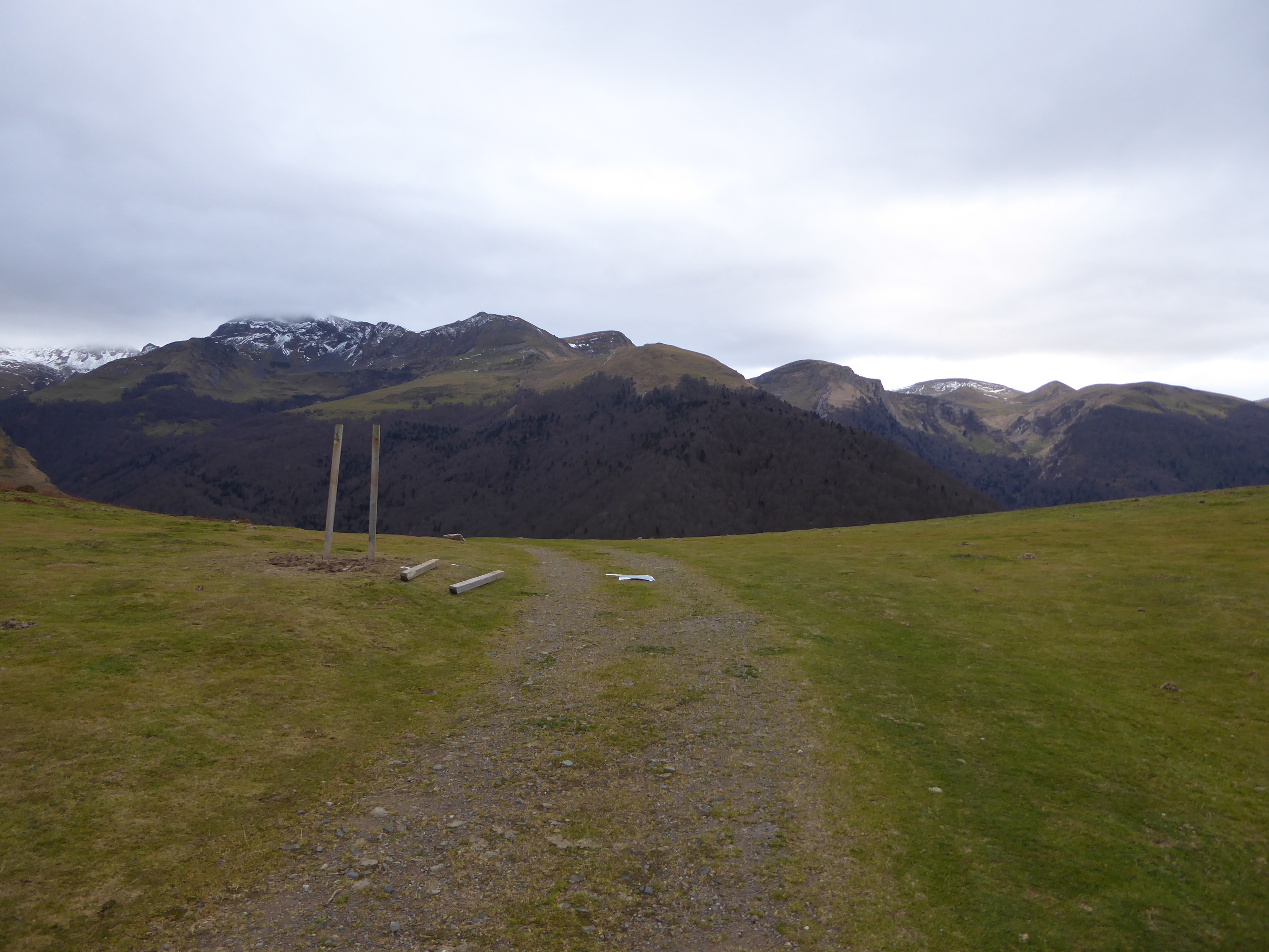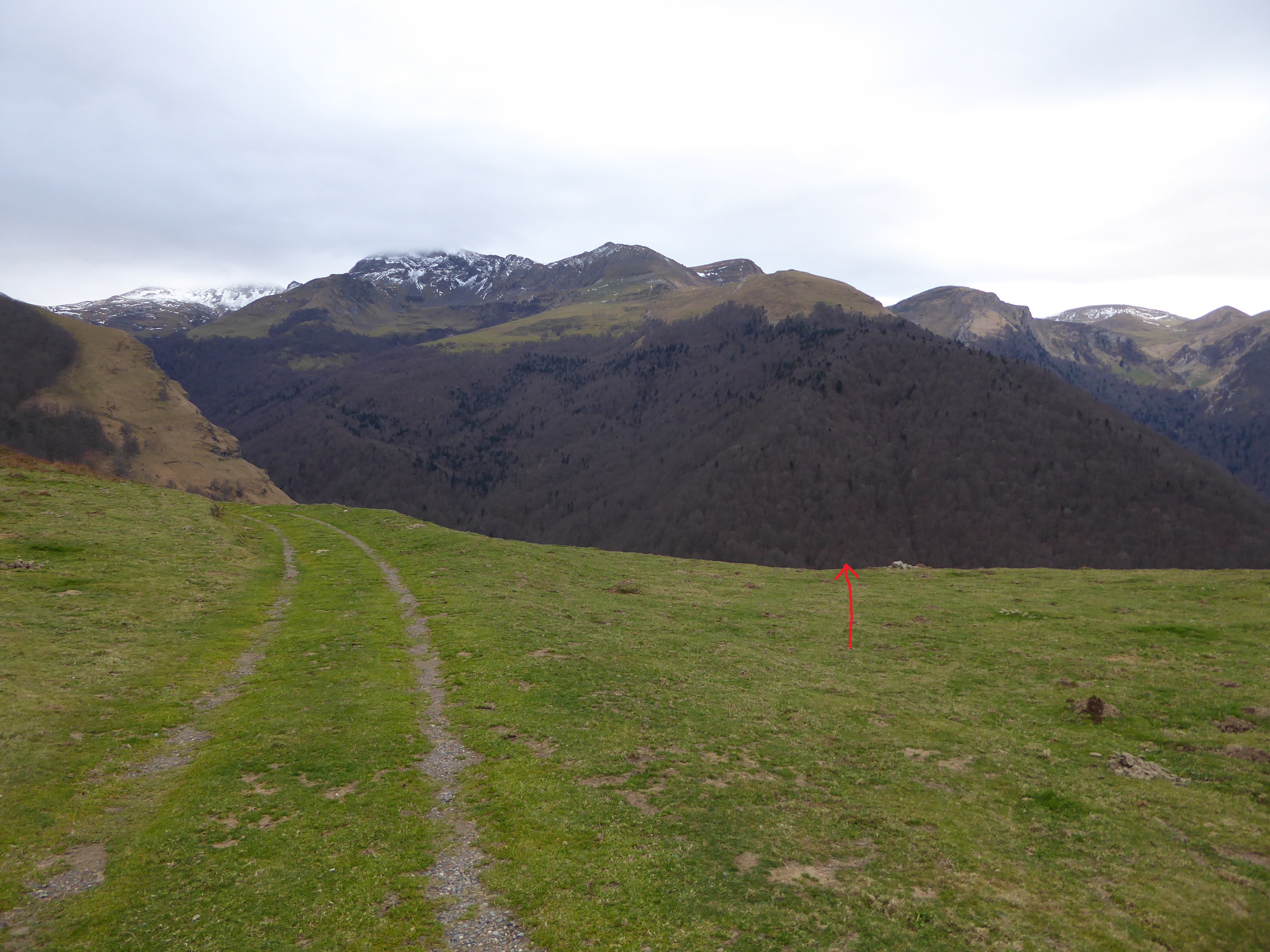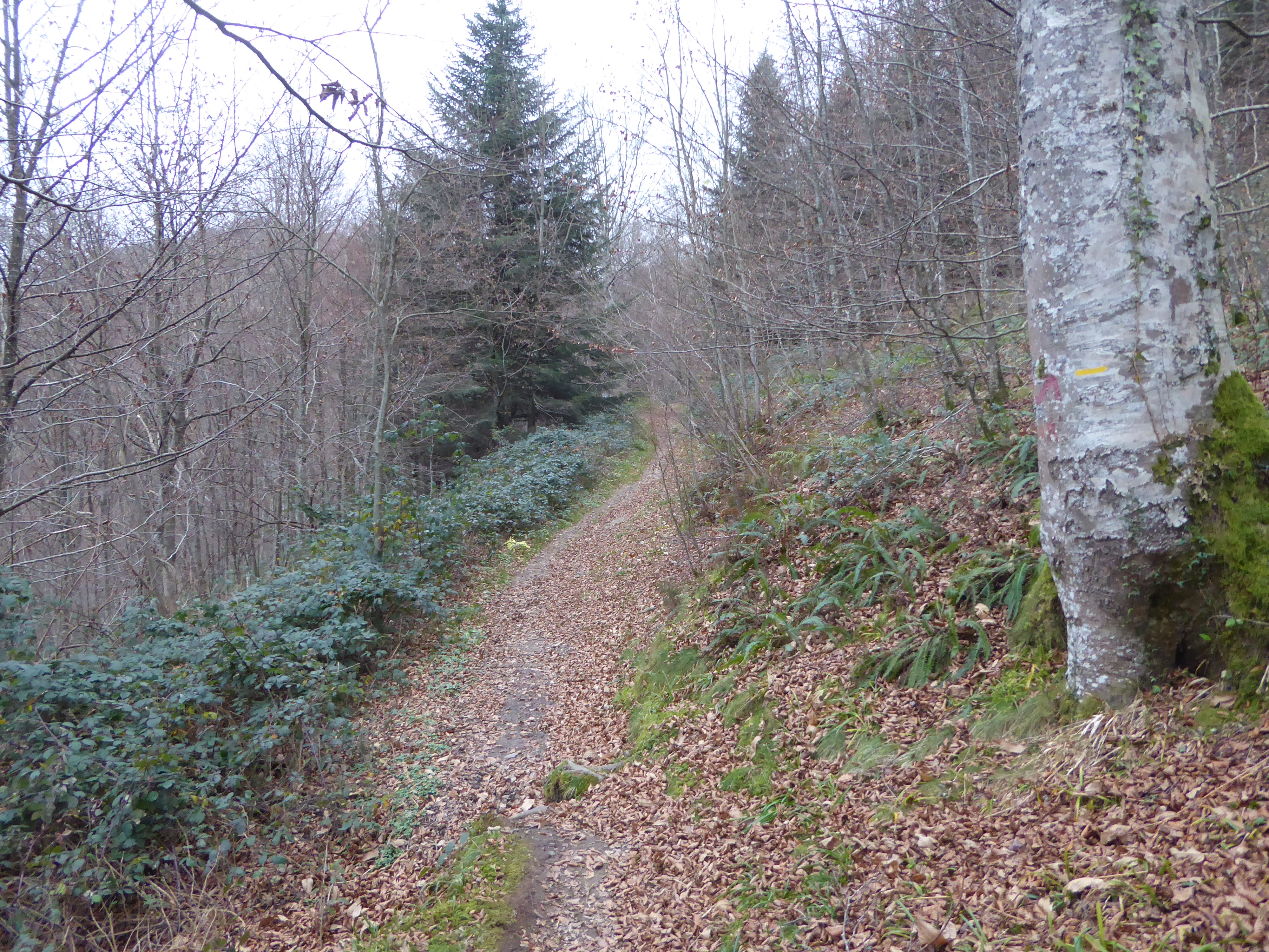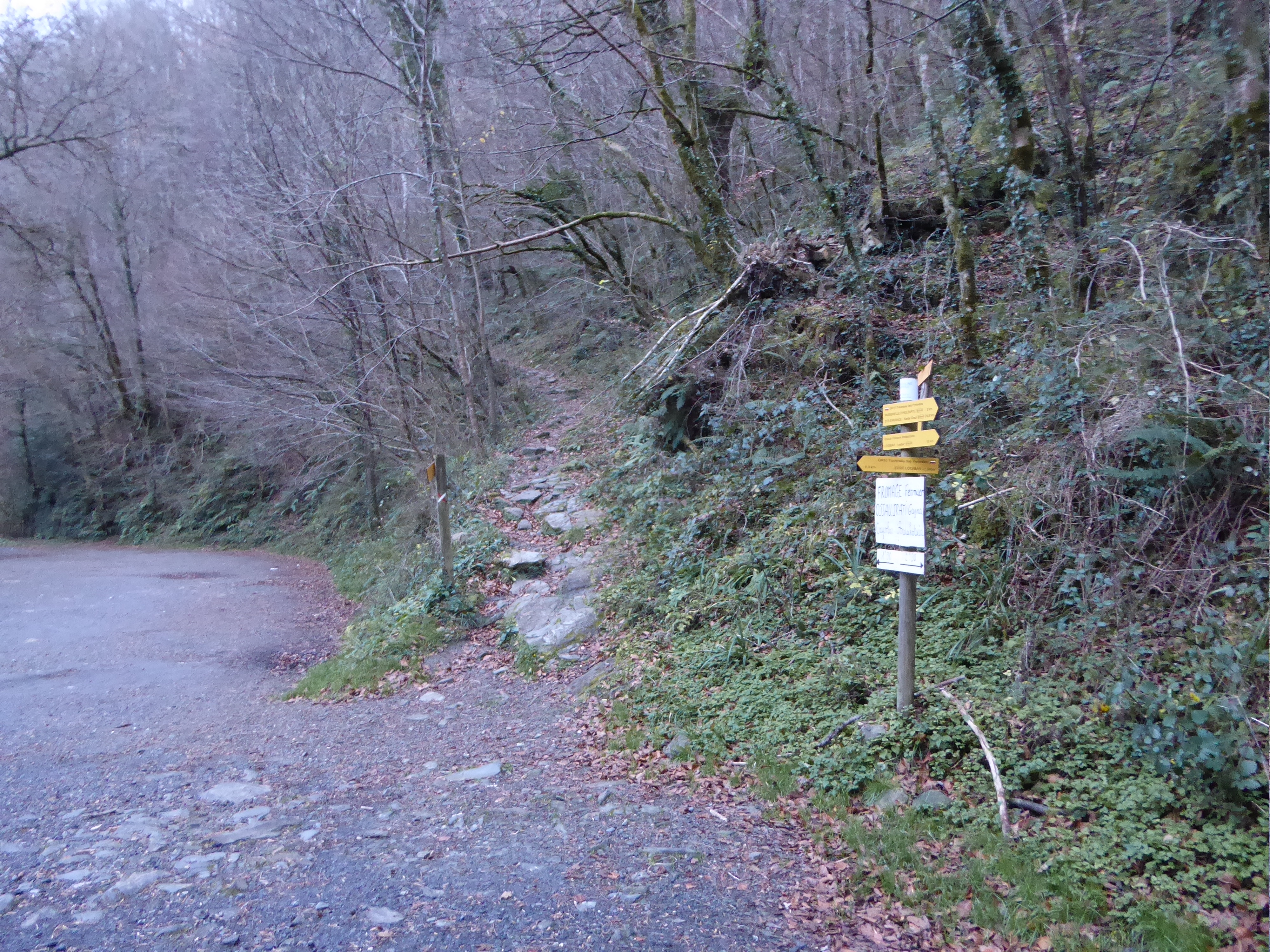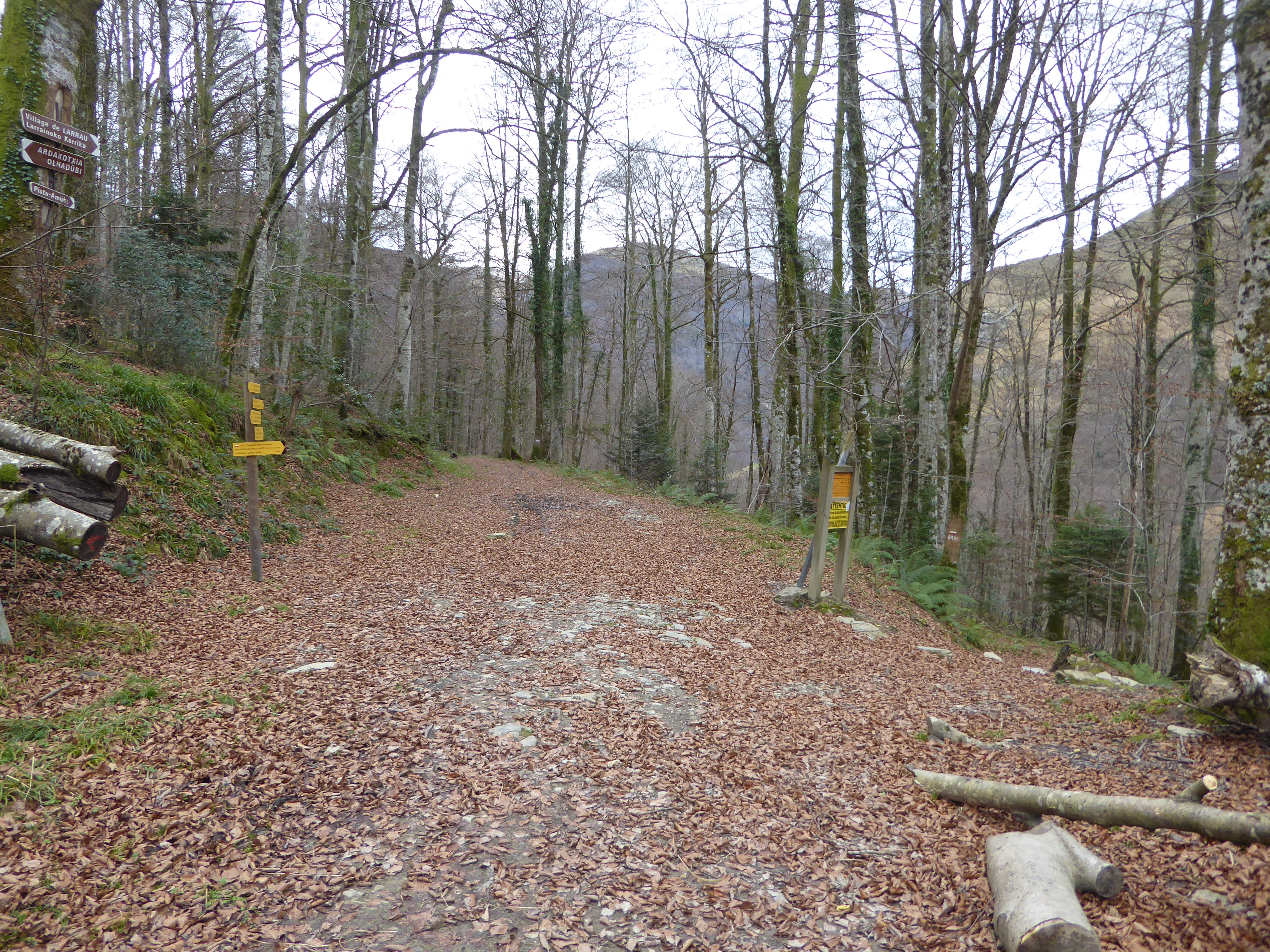 Au niveau de la cote 746 m sur la carte IGN (746 m), suivre le chemin partant tout droit (le chemin balisé en rose sur la carte IGN ne doit plus exister) et qui monte beaucoup moins raidement direction Passerelle d'Holzarté, balisé sporadiquement en jaune dorénavant