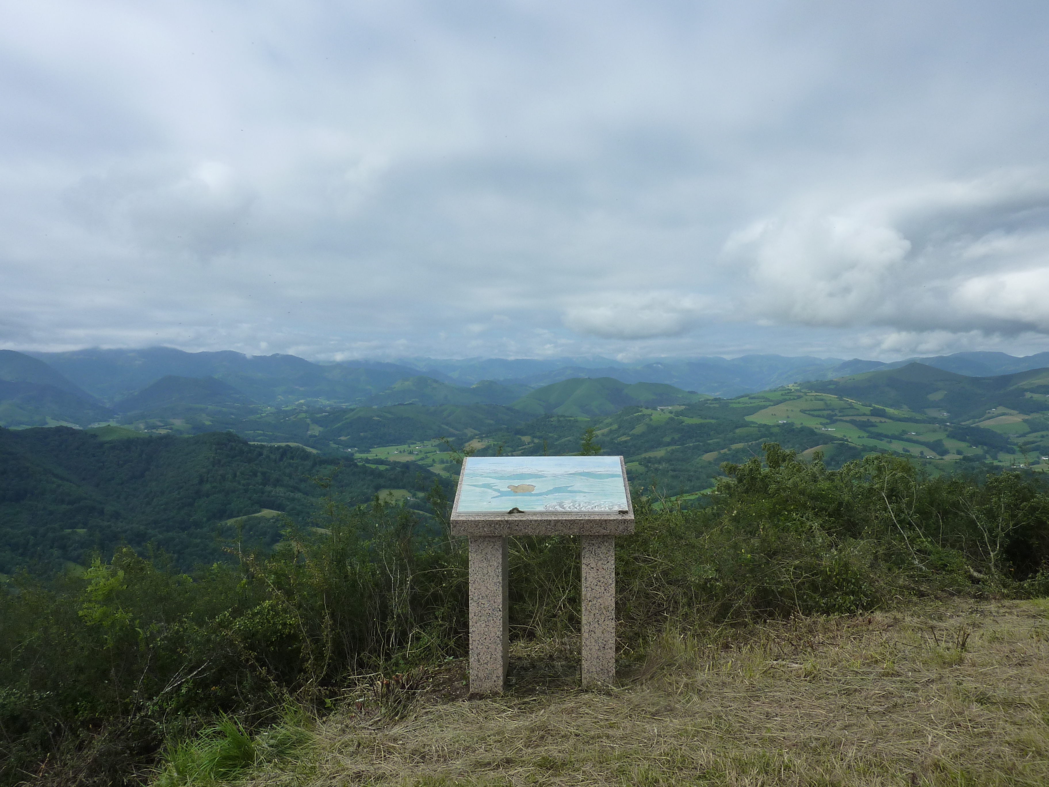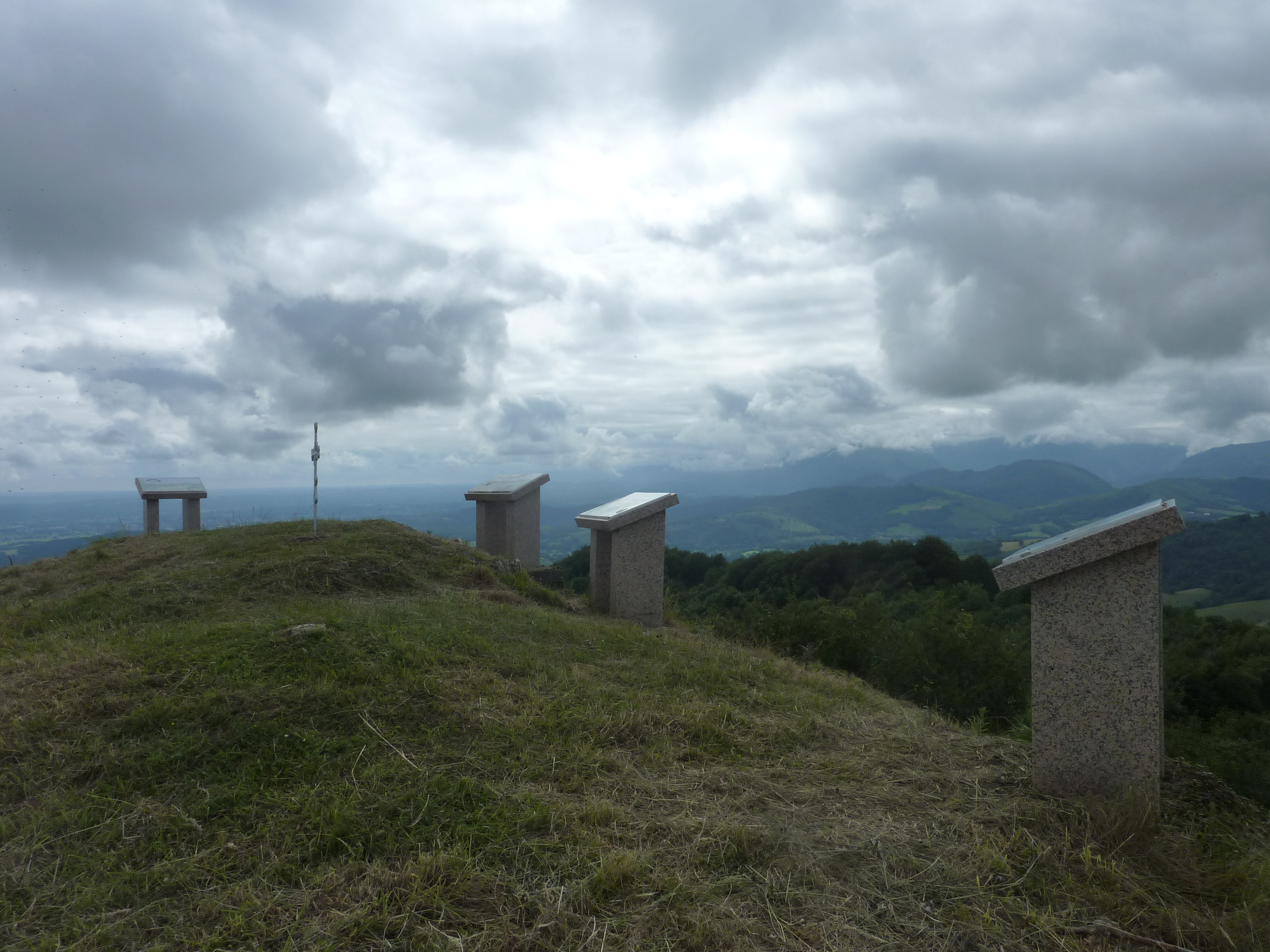 Arrivée au Sommet de Cambillou (661 m) : beau panorama aujourd'hui sur les sommets du Pays Basque, du Pic d'Orhy jusqu'au Mont Baïgura mais la vue vers les hauts sommets béarnais ainsi que sur le massif karstique du Pic d'Anie est masquée par les nuages bas !
