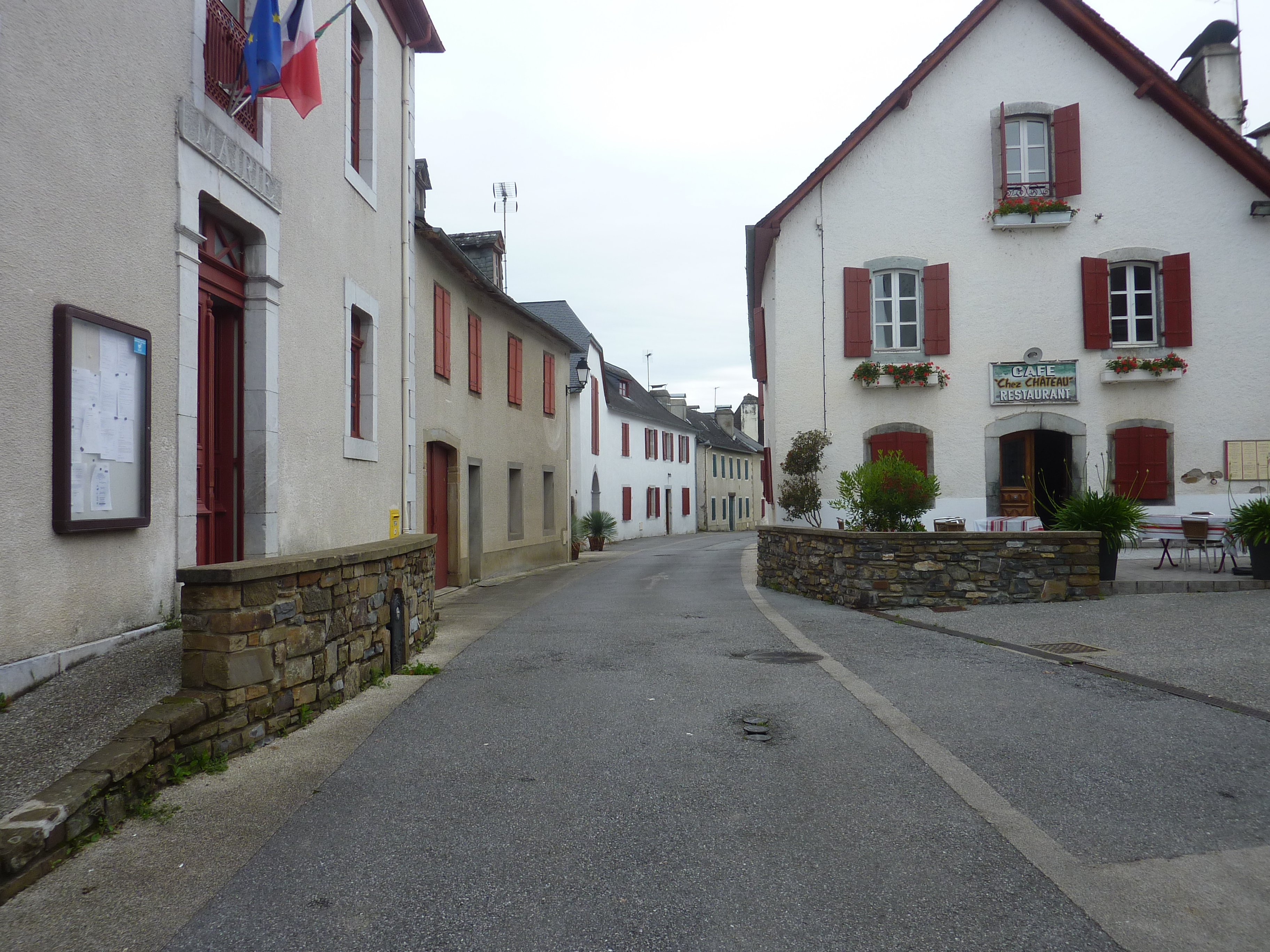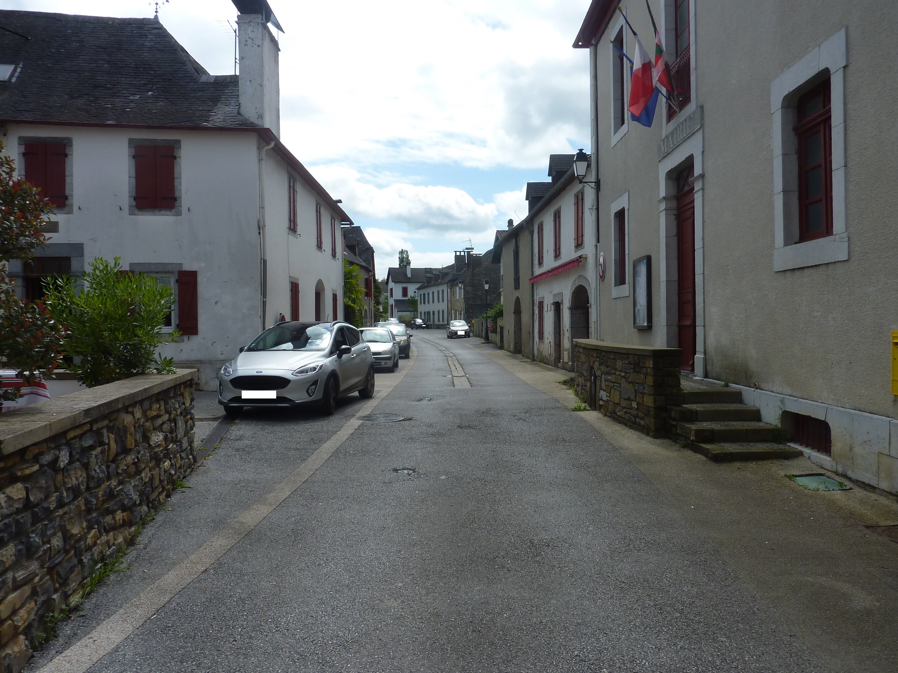 A ce croisement (25 mètres après la précédente intersection), suivre les escaliers montant sur la droite puis suivre la route partant encore sur la droite au sommet des escaliers direction Esquiule - Mairie