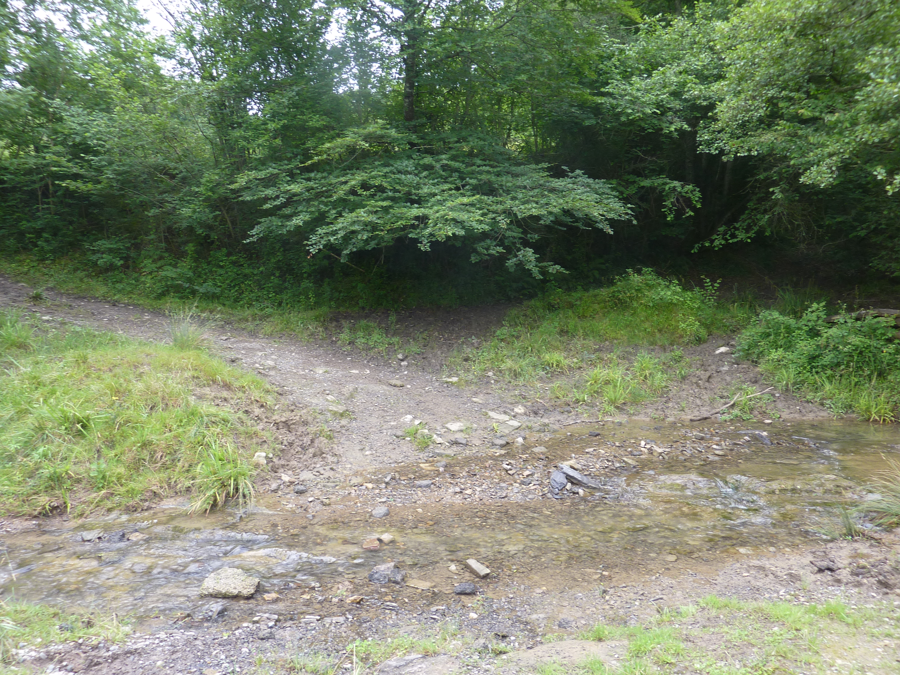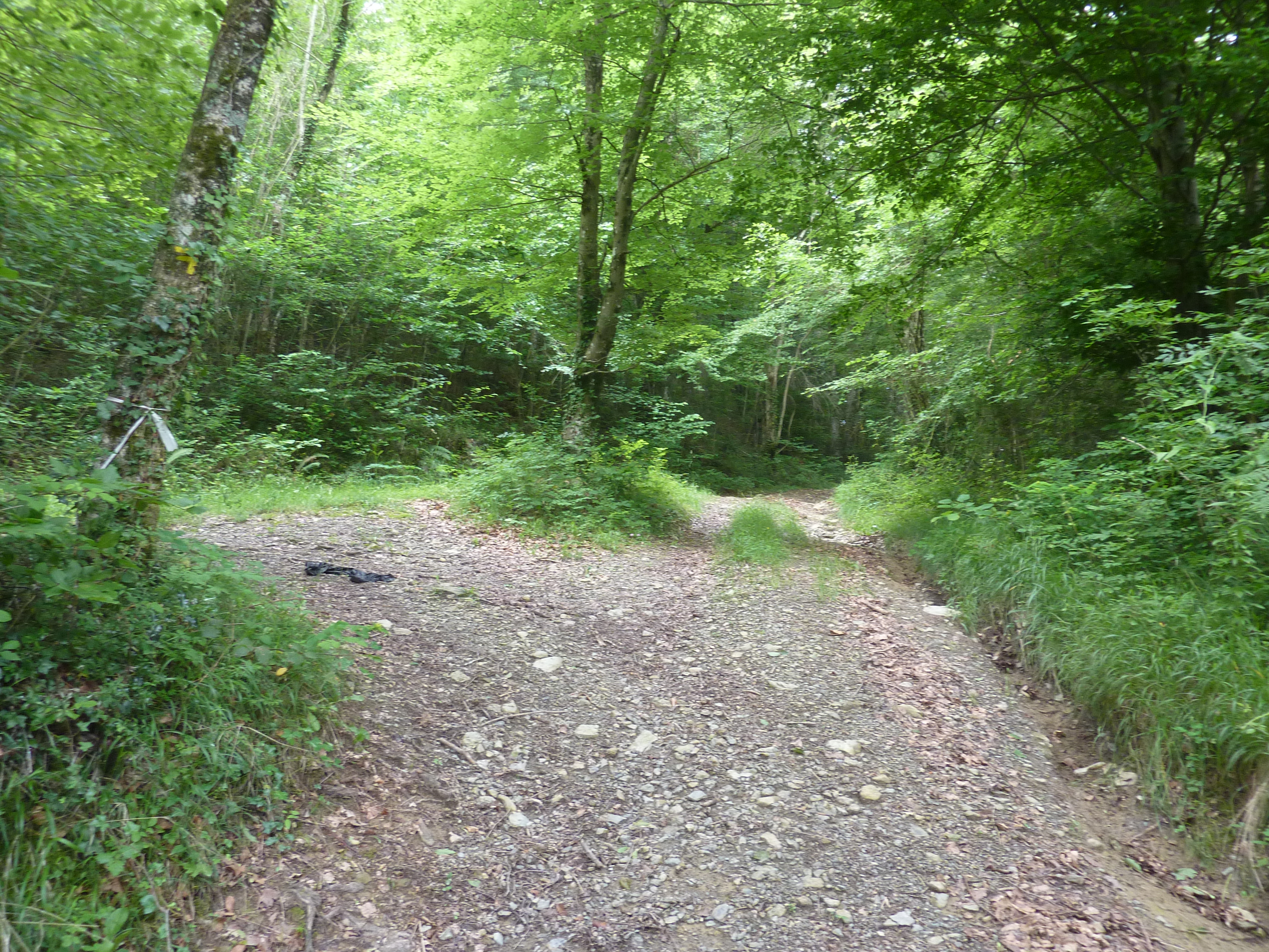 A ce croisement (800 mètres après le précédent), descendre sur la gauche pour reprendre le chemin qui passe le Gorria à gué direction Esquiule, balisé en jaune désuet