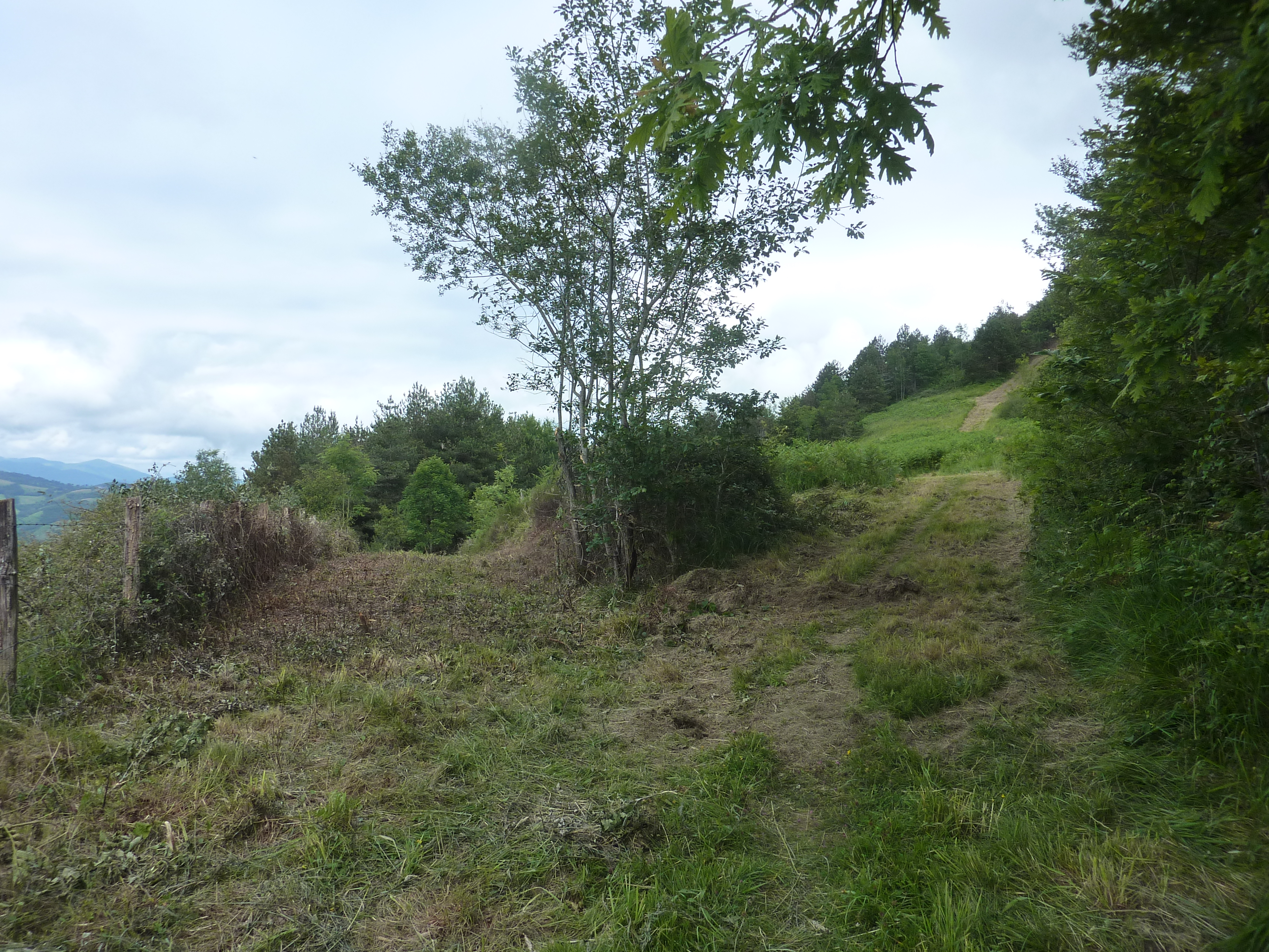 A ce croisement au niveau du lieu-dit "Larrandaburu" (500 mètres après avoir rejoint la route), suivre le chemin mal tracé descendant sur la droite direction Esquiule, balisé en jaune désuet (pour rappel, il y a quatre clôtures à passer jusqu'au lieu-dit "Argain")