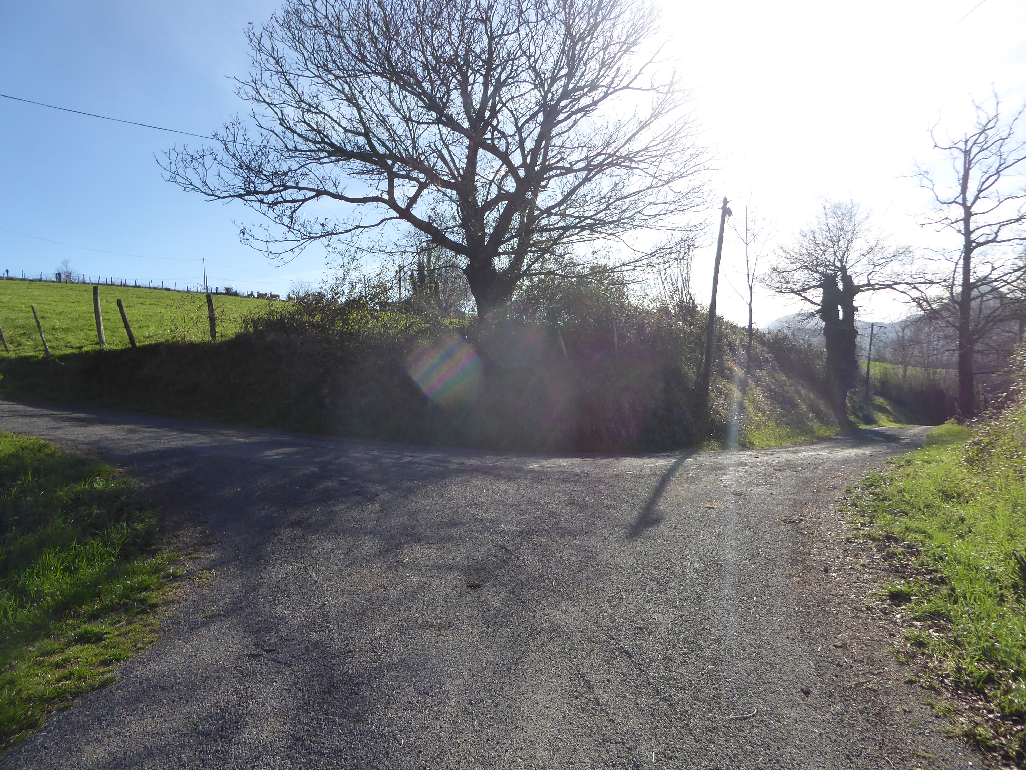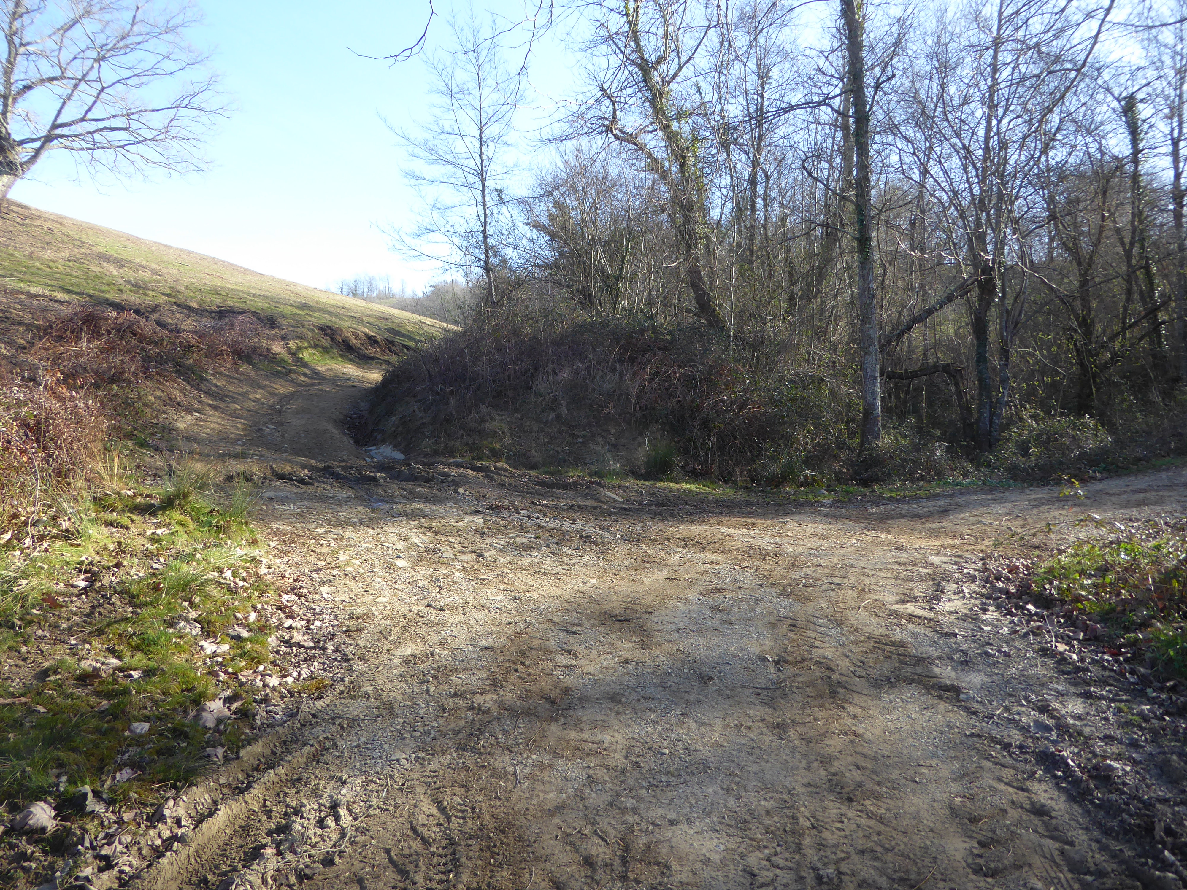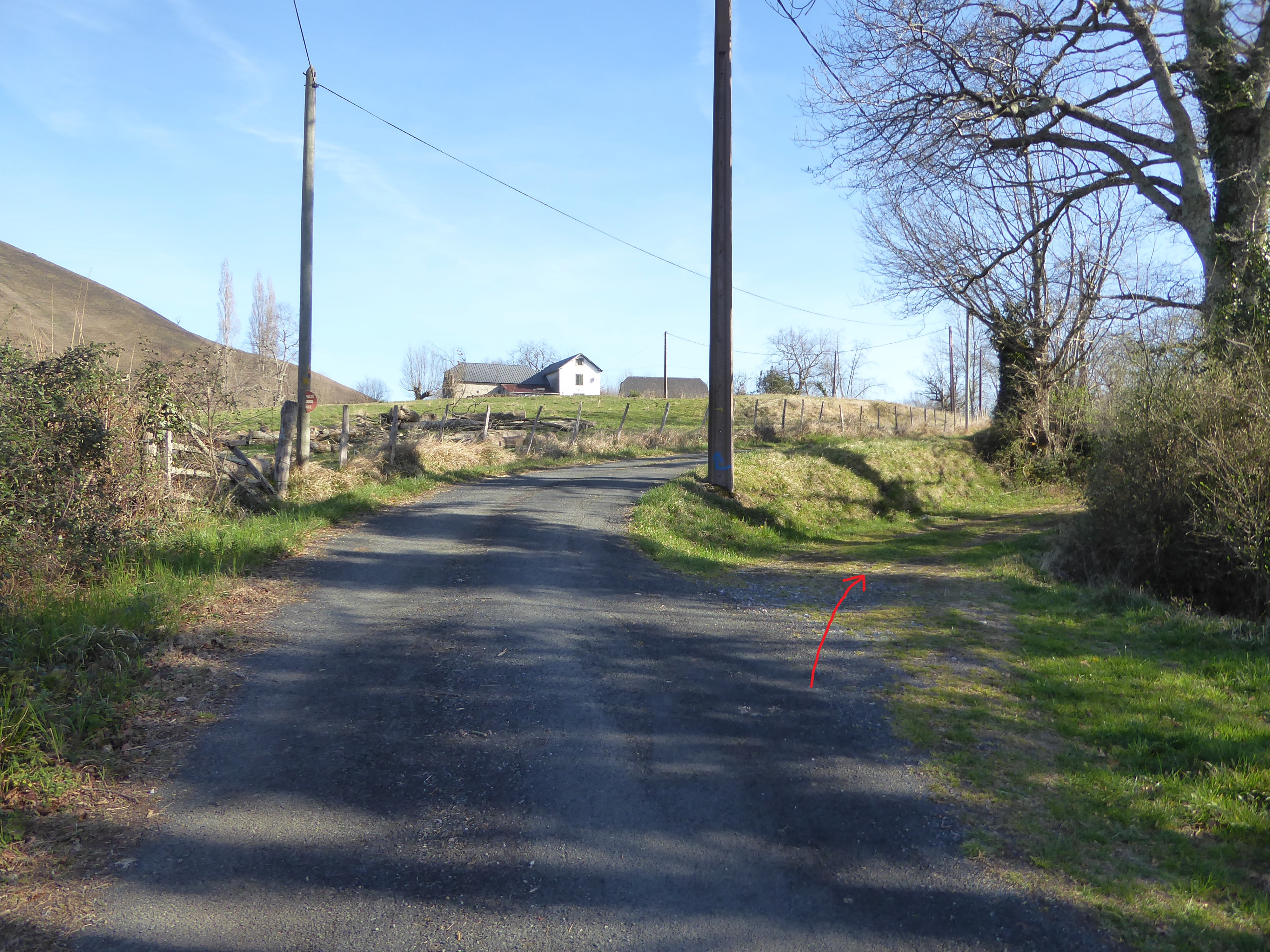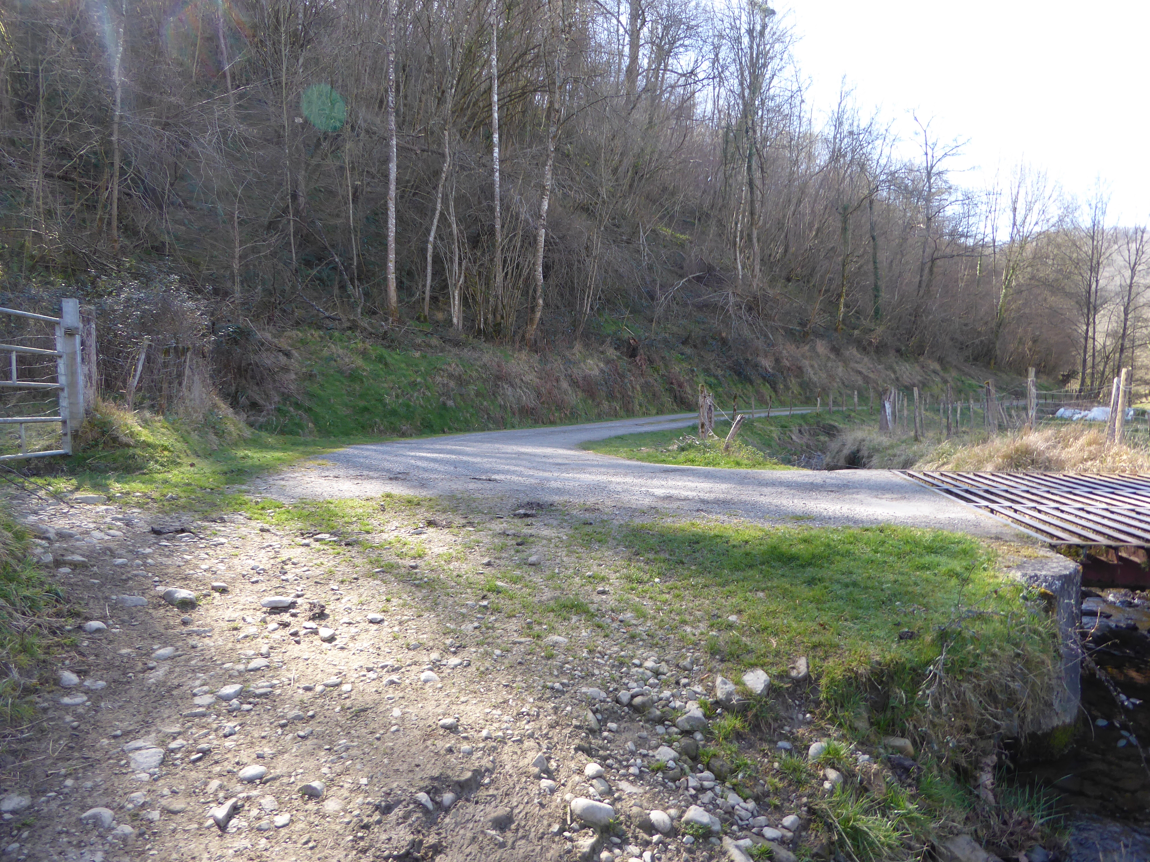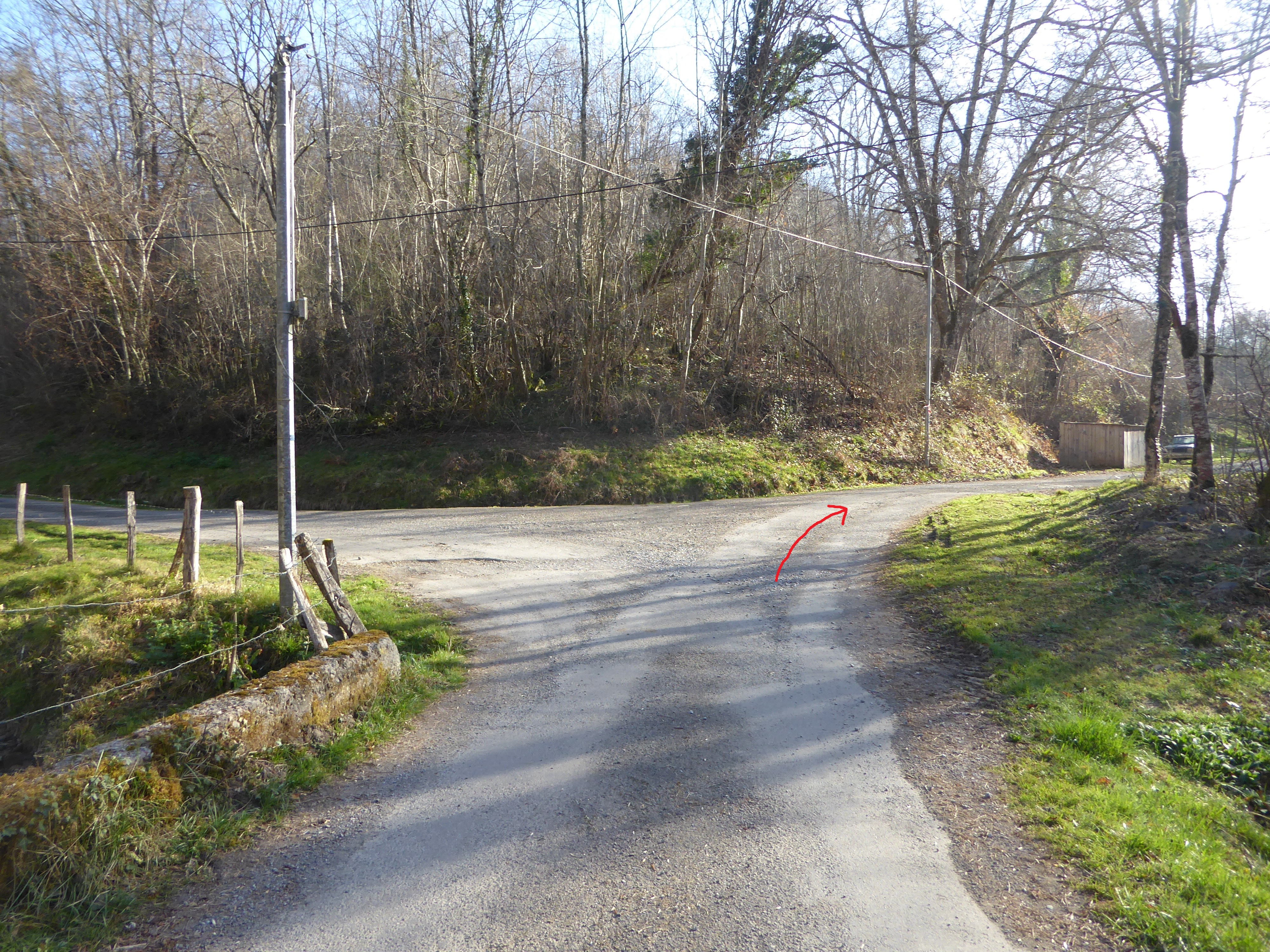 Au niveau de ce virage avant que le chemin partant sur la droite ne rentre dans un sous-bois (800 mètres après le croisement précédent), suivre le chemin dérobé descendant légèrement sur la gauche et traversant le Ruisseau d'Erretzü direction Tardets-Sorholus (attention, le chemin de droite traverse aussi ce même ruisseau ...)