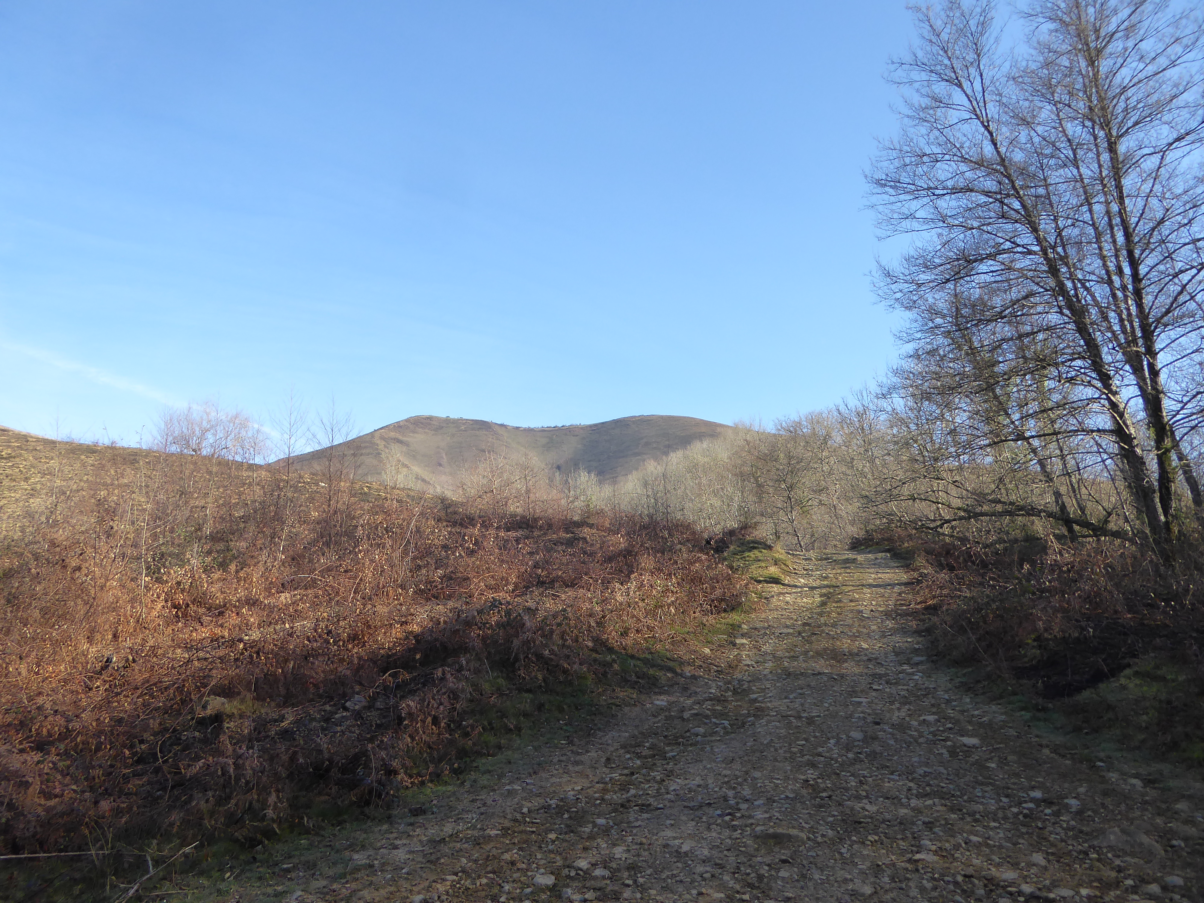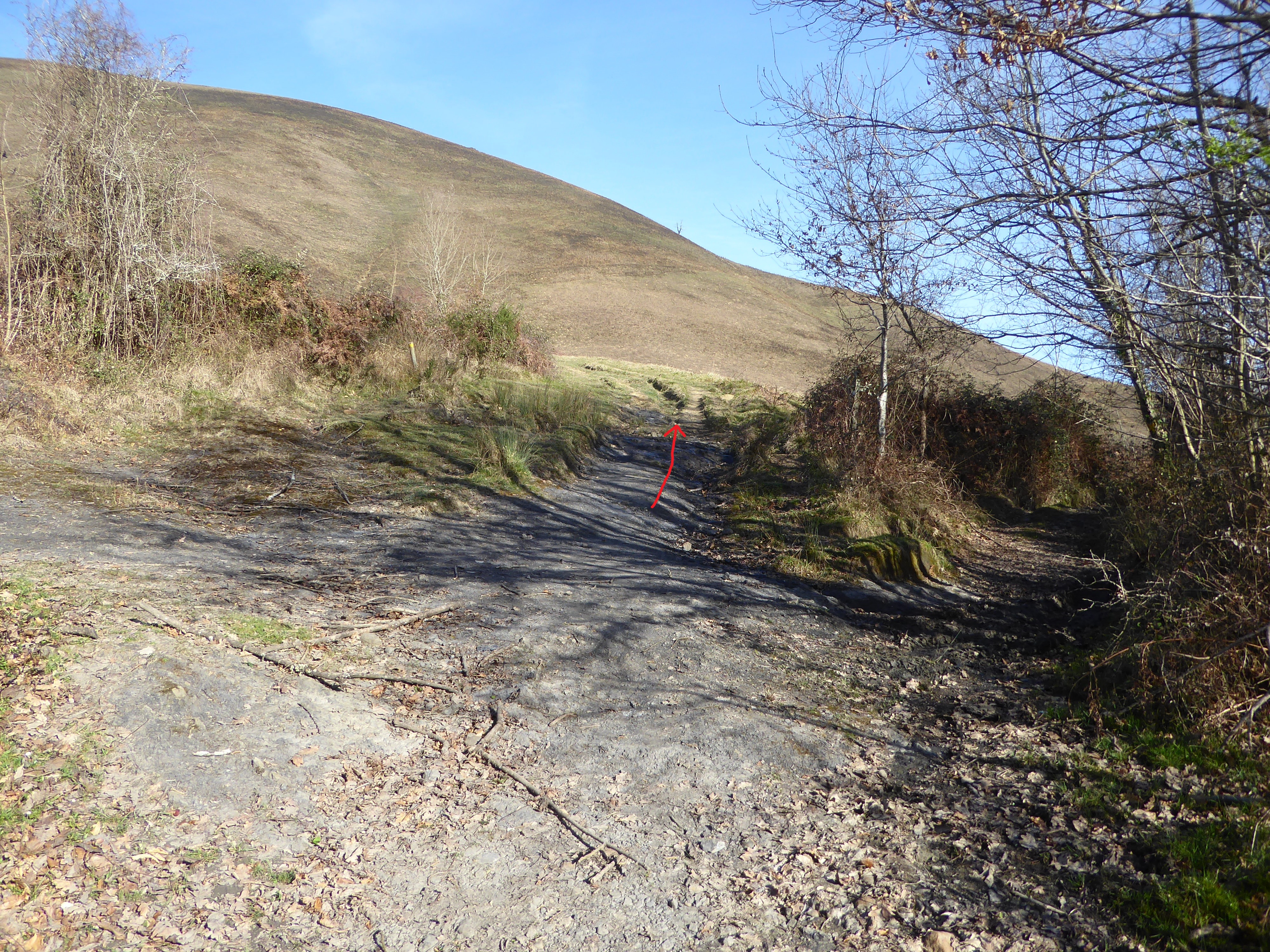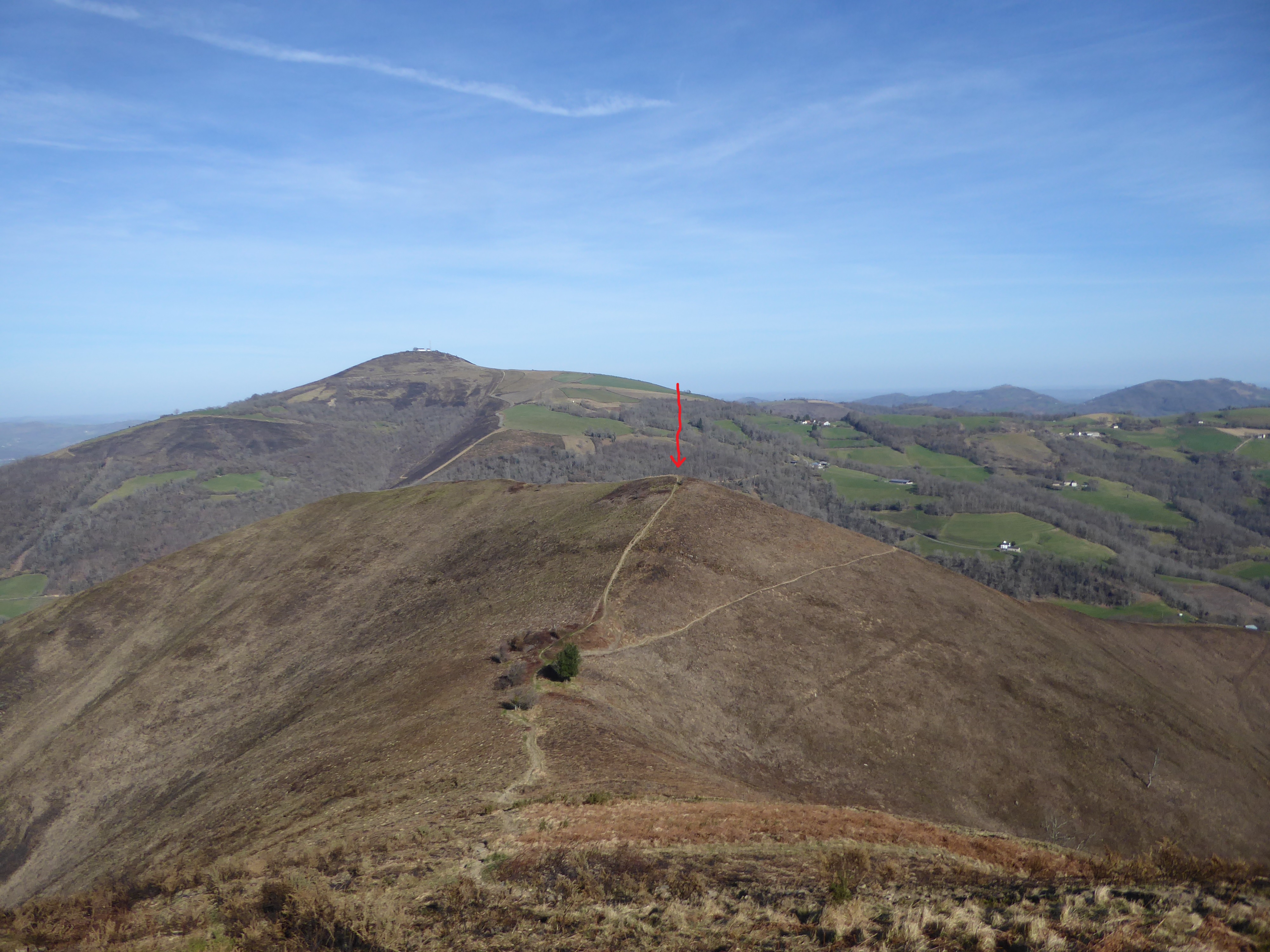 A ce croisement (50 mètres après avoir quitté le sommet), deux possibiltés : soit continuer à suivre le chemin descendant tout droit et balisé en jaune pour ceux qui ne veulent pas monter à l'Oholegitako Hegia ou soit suivre le chemin descendant sur la droite non balisé menant à l'Oholegitako Hegia ; deuxième option choisie direction Oholegitako Hegia, aucun balisage dorénavant