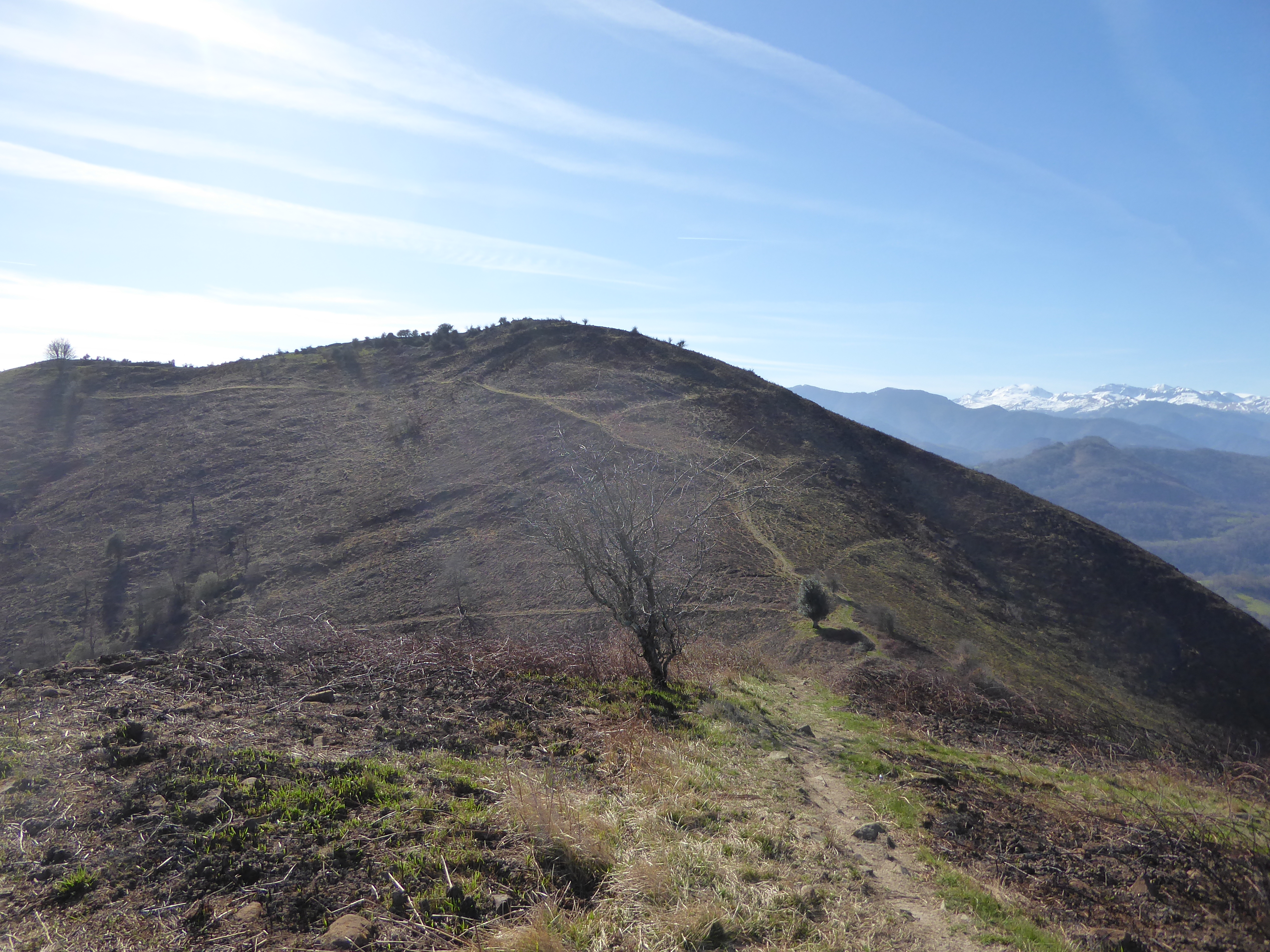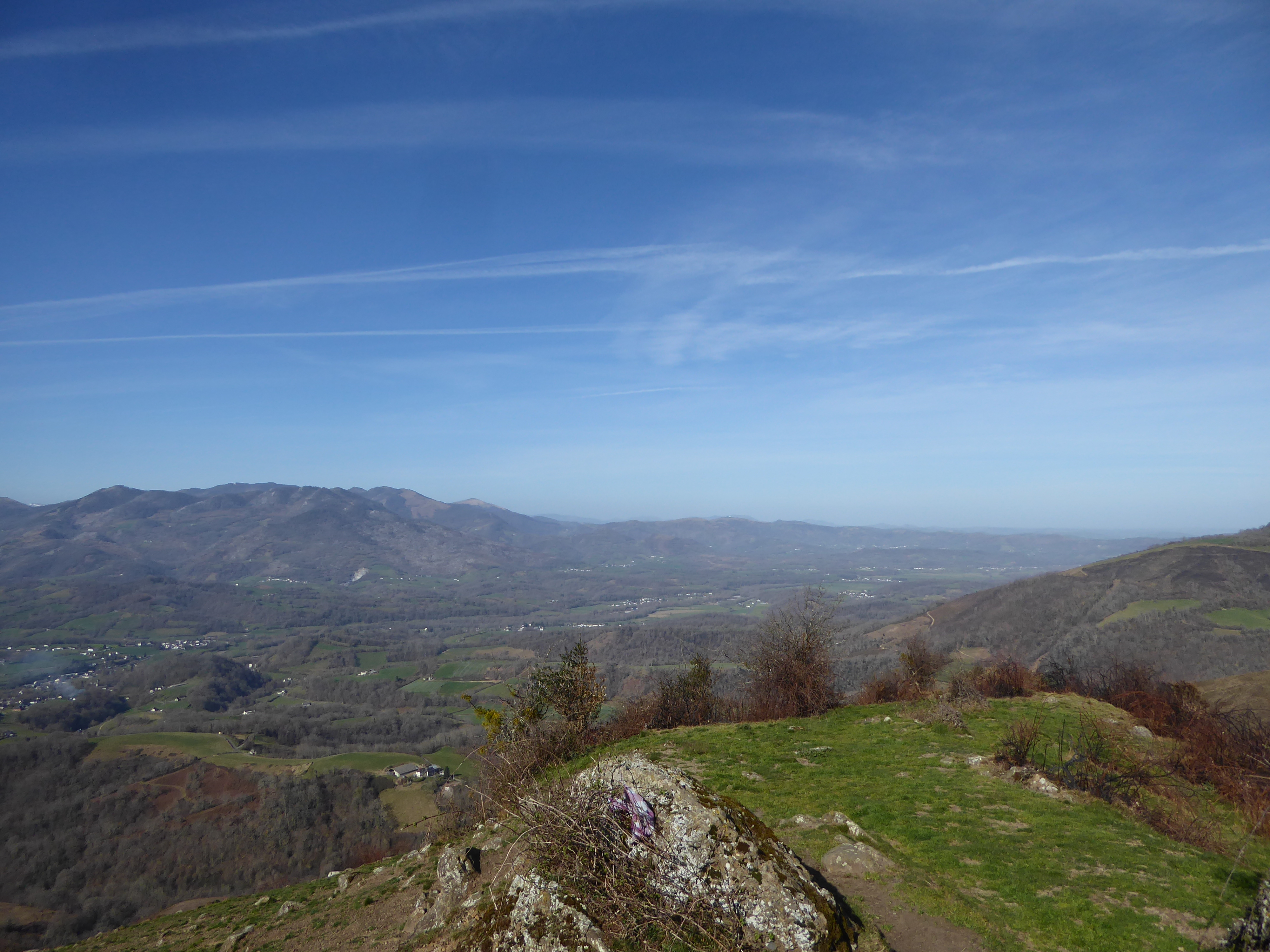 Arrivée au Sommet d'Erretzü (700 m) : magnifique panorama aujourd'hui notamment sur les sommets de la Vallée d'Ossau, de la Vallée d'Aspe, du secteur de la Pierre Saint-Martin, de la Haute Soule et de la Basse Navarre ... les différentes vallées du Pays Basque oriental se dévoilent également !