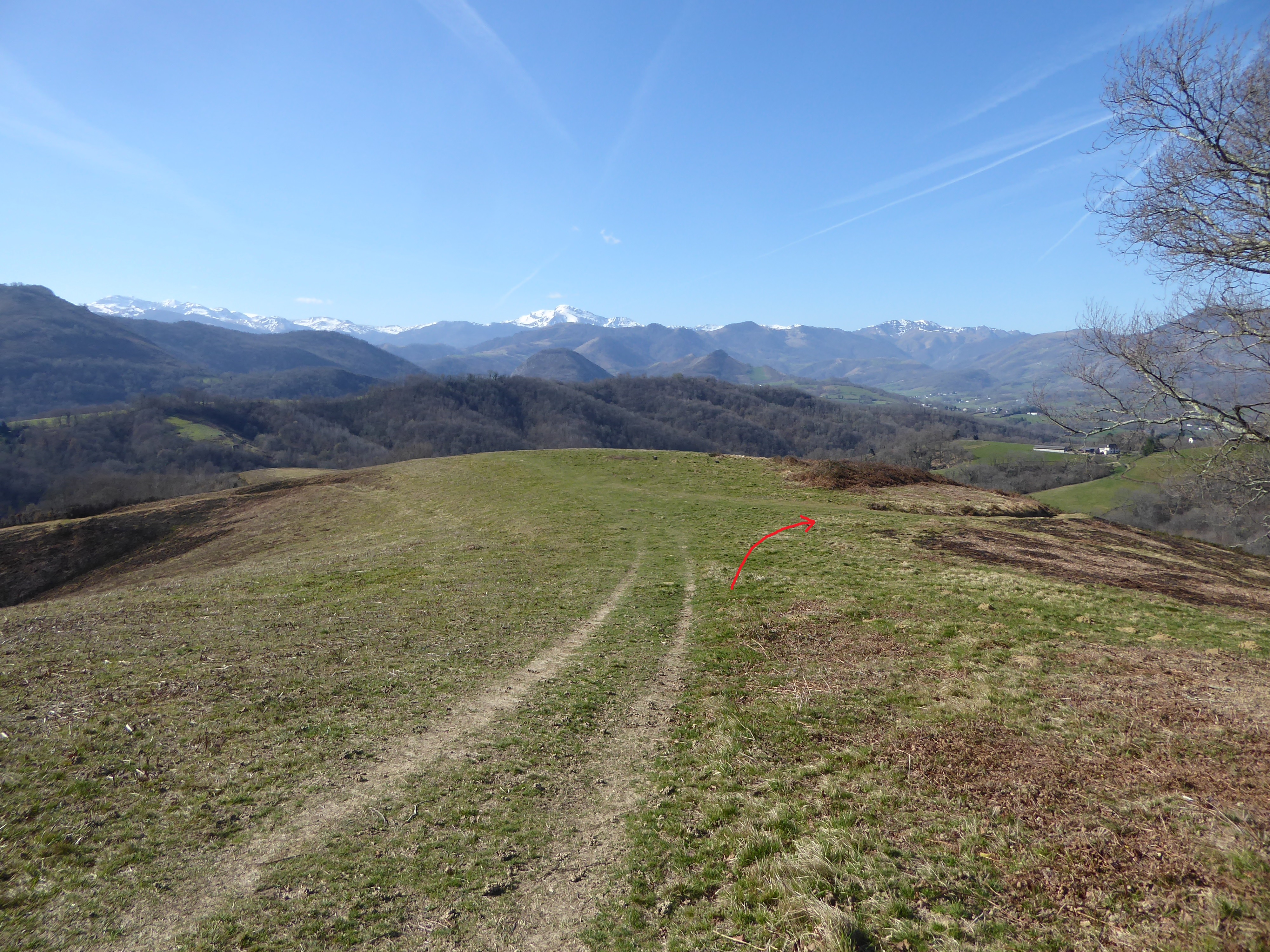 Dès que le chemin de descente du Sommet d'Erretzü est atteint, suivre ce dernier dans le sens de la descente (à droite) direction Tardets-Sorholus, balisé en jaune dorénavant