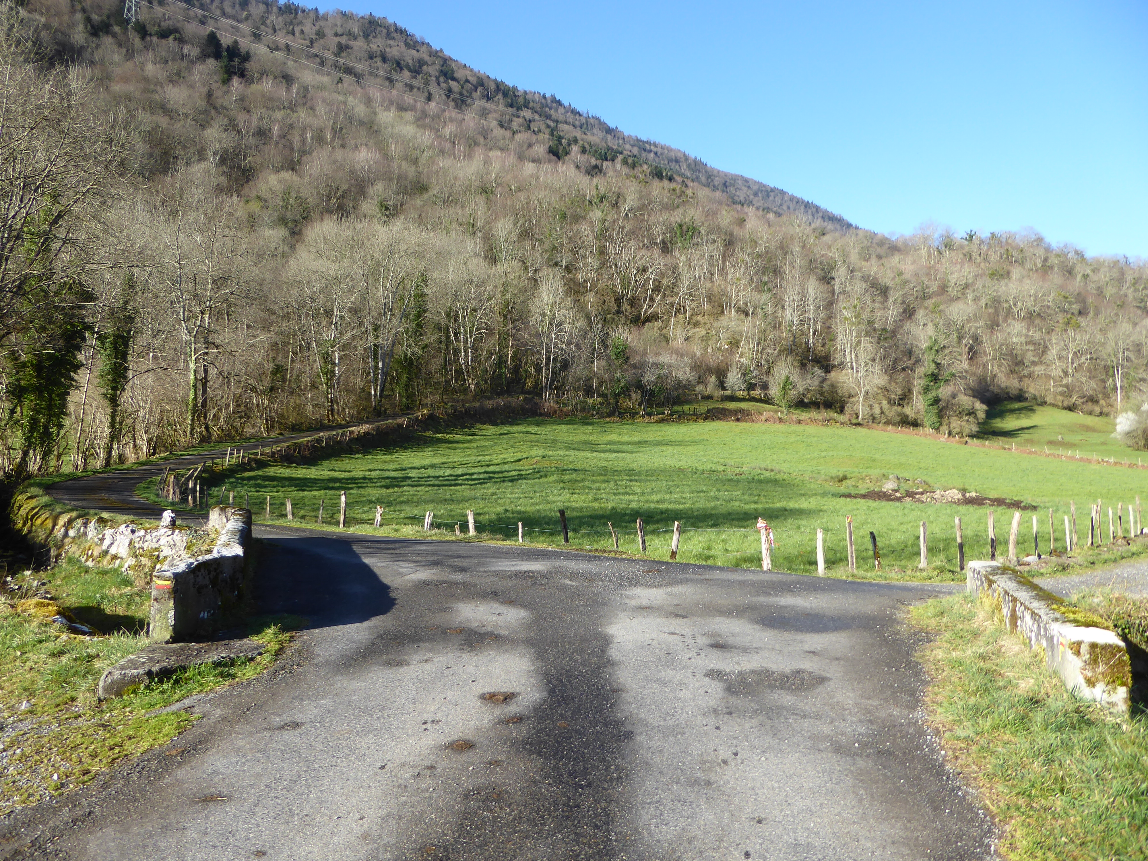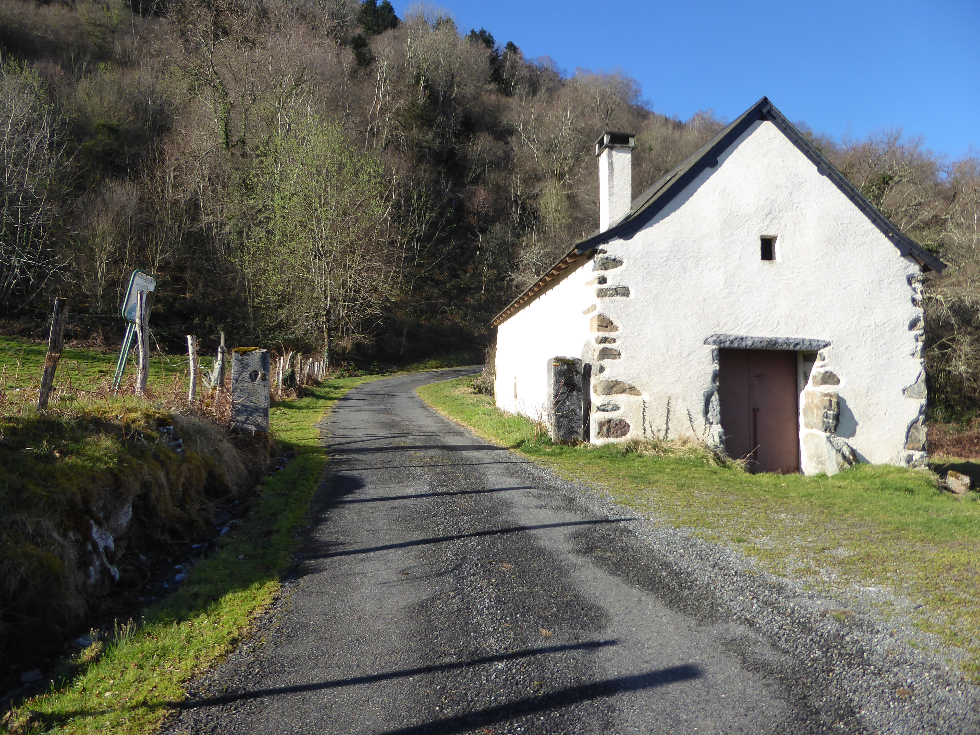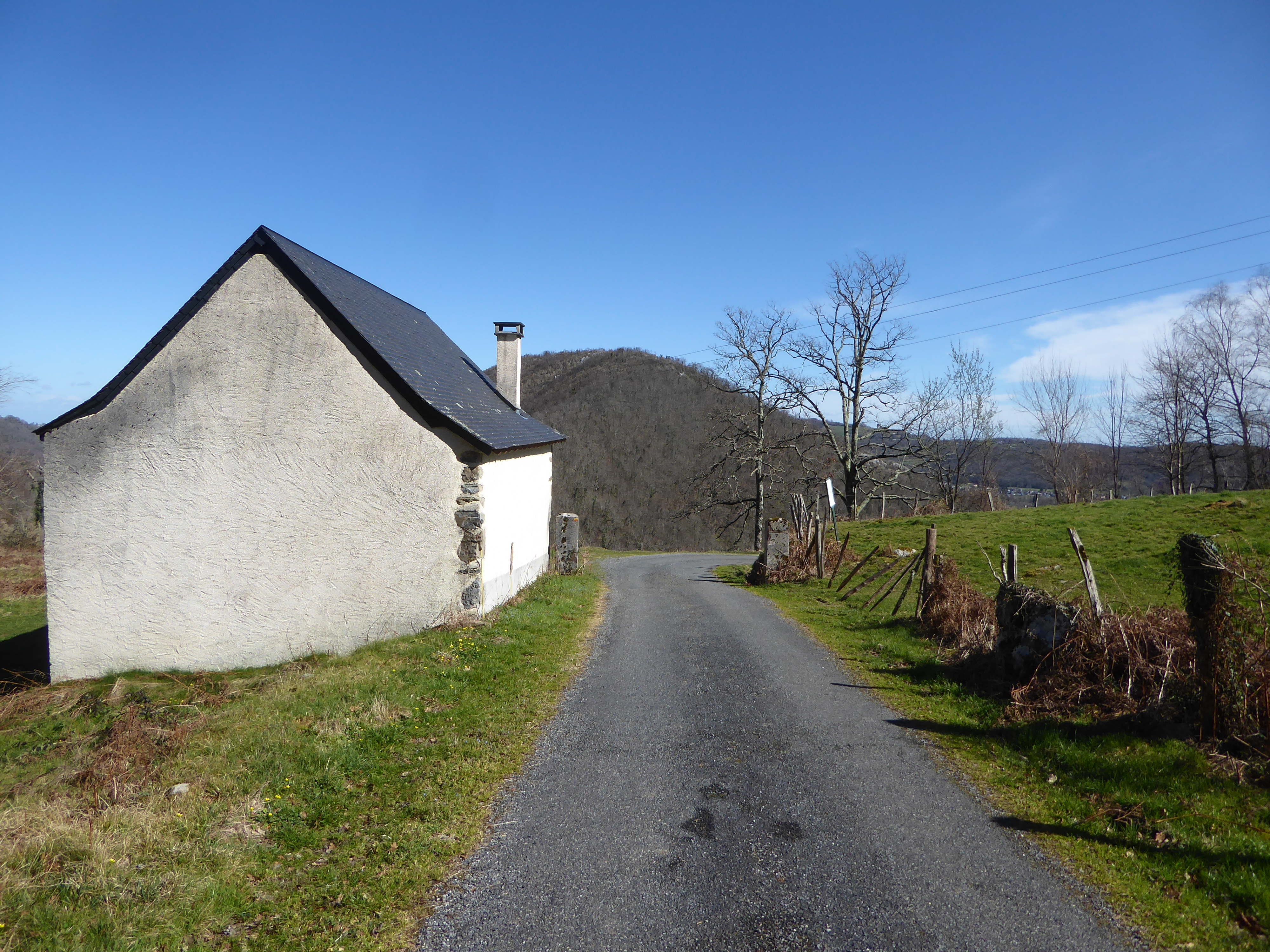 Grange Beigbéder (547 m) : continuer à suivre la route goudronnée partant tout droit direction Bois d'Izeste, balisé en jaune et rouge