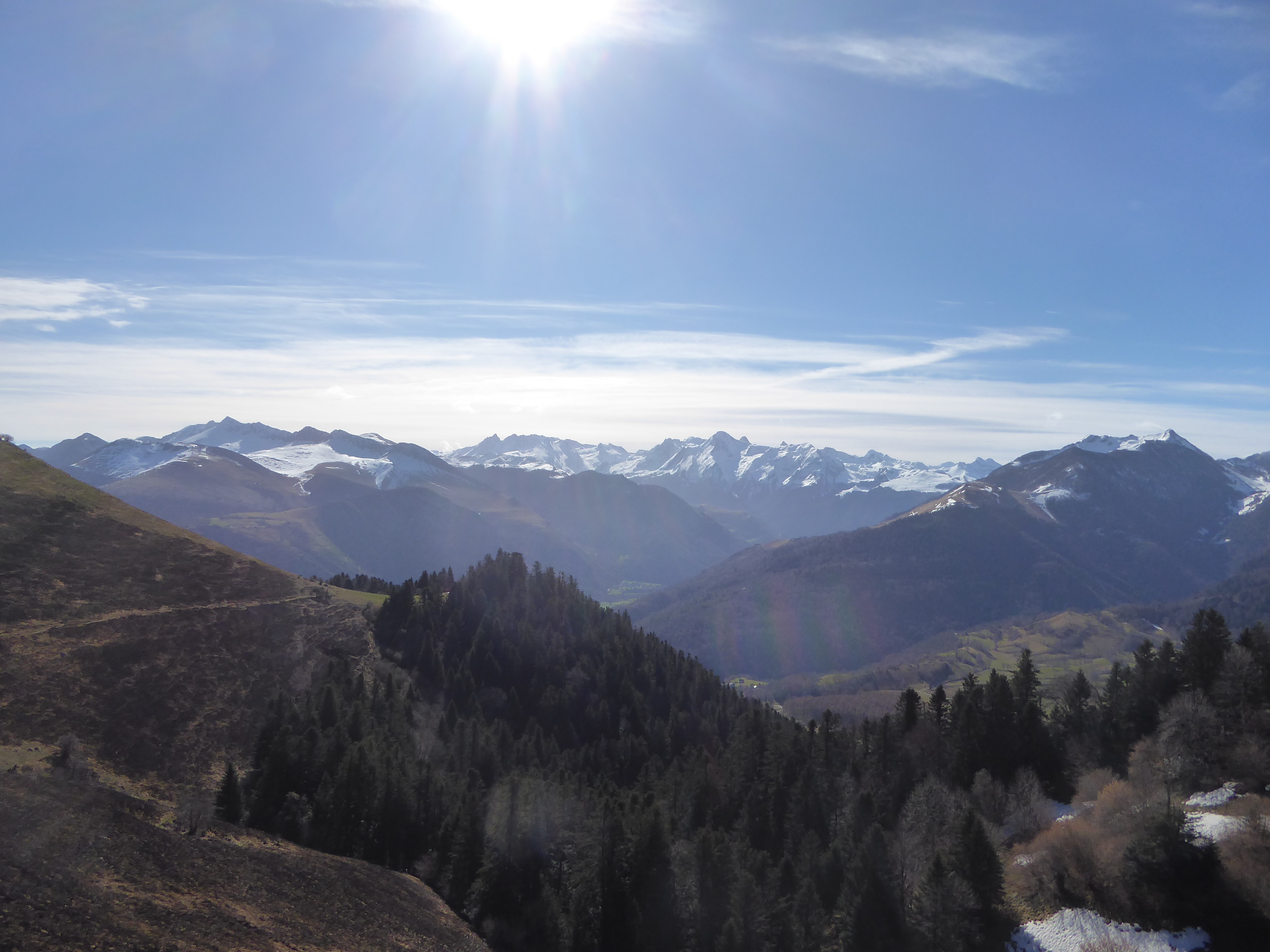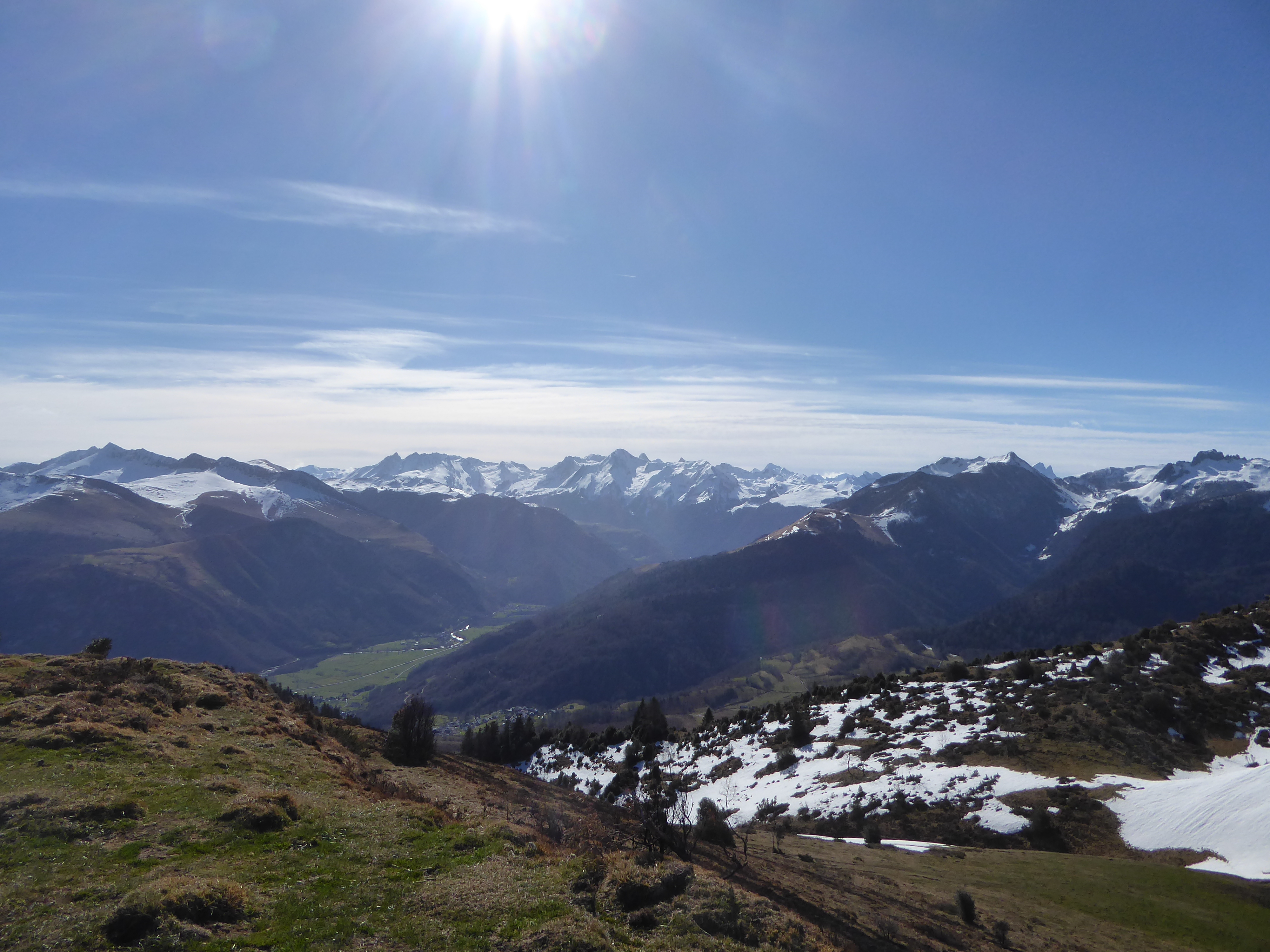 La vue se dégage enfin sur les Pyrénées béarnaises, ici, de la Moulle de Jaüt jusqu'au Pic de Gerbe en passant par les Gabizos et le Ger