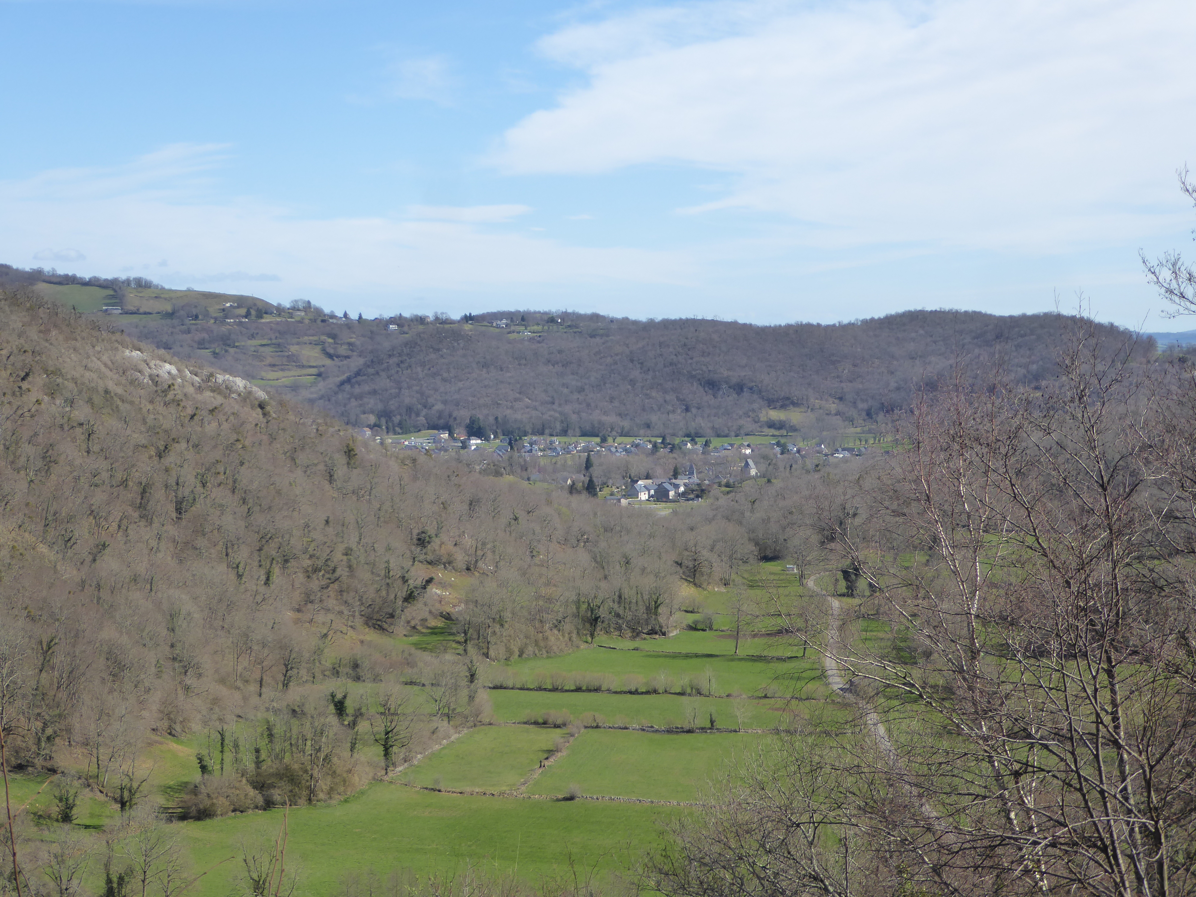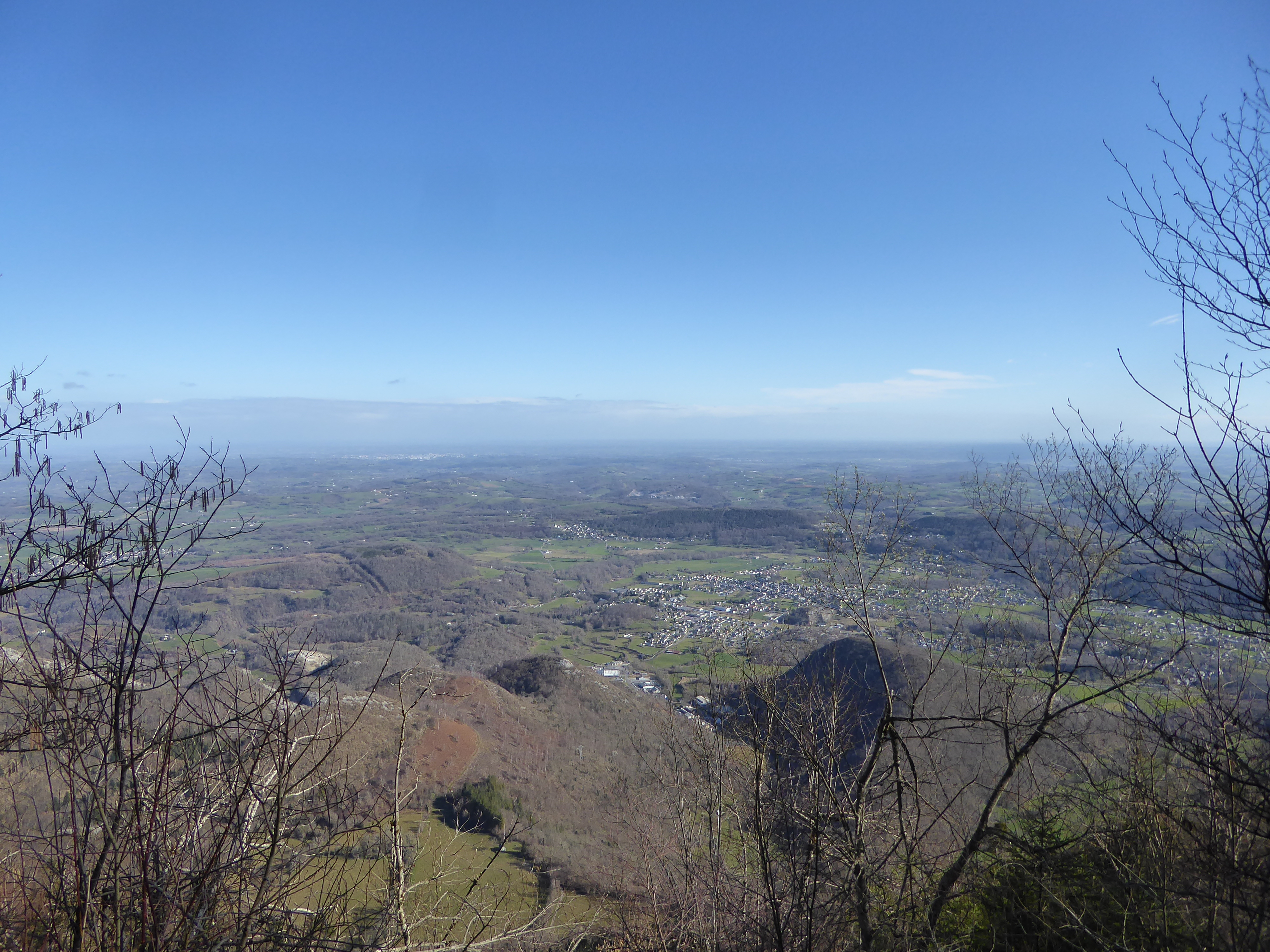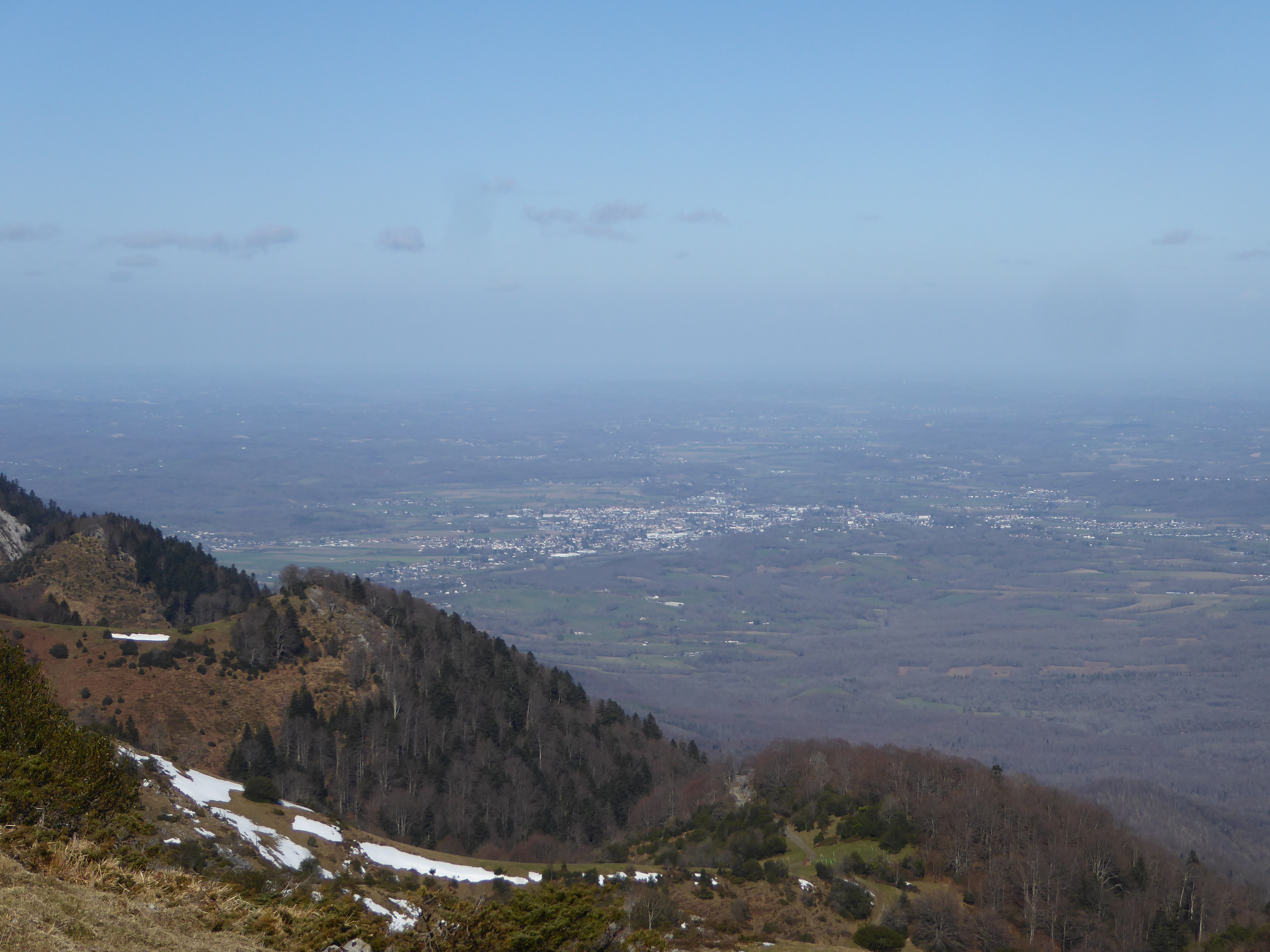 Belle vue sur la plaine béarnaise avec le village d'Arudy en bas et la ville de Pau au loin