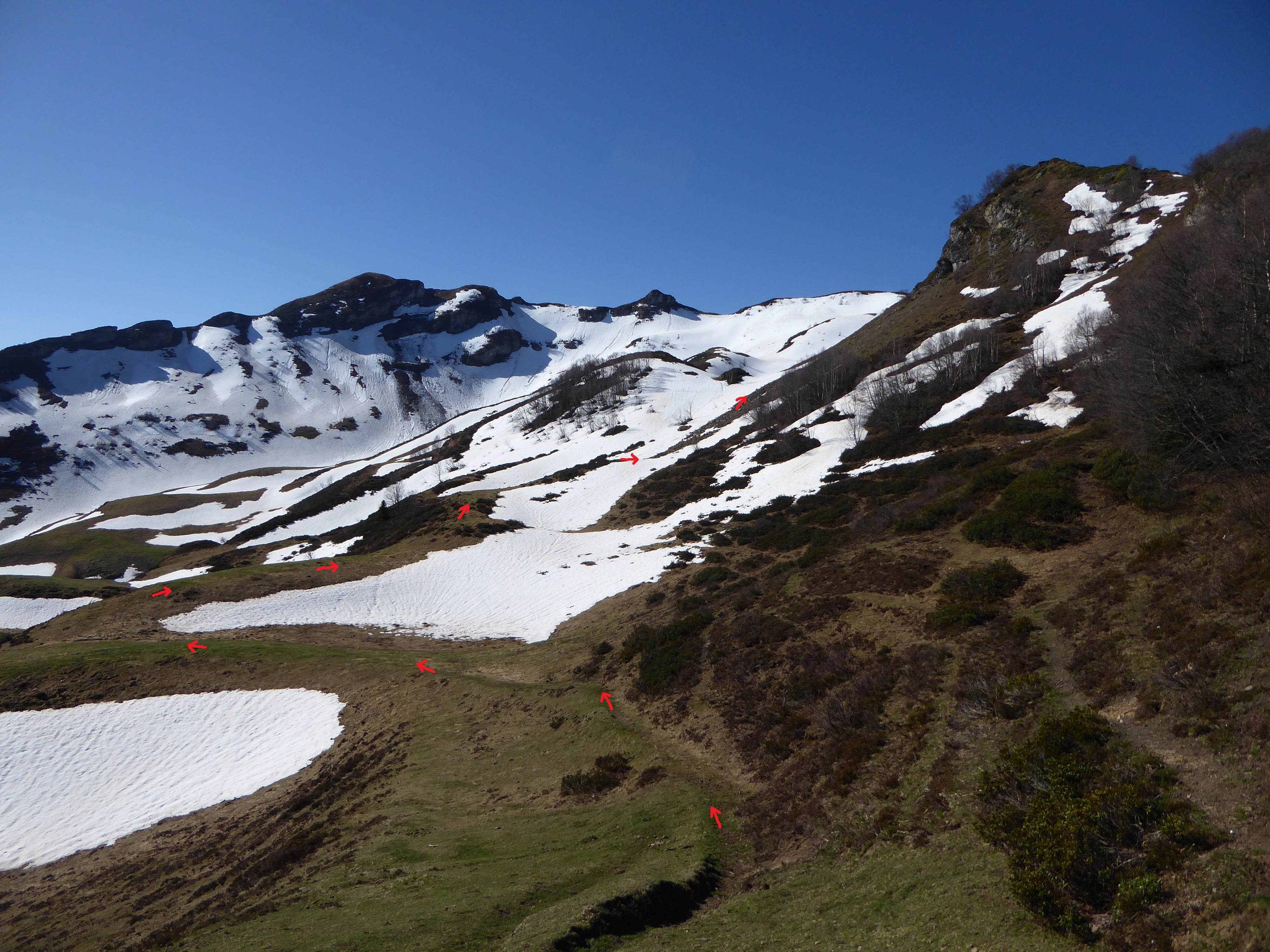 Continuer à contourner le sommet par l'Est puis quand cela est possible, se rapprocher de la crête sommitale direction Pic de Gerbe