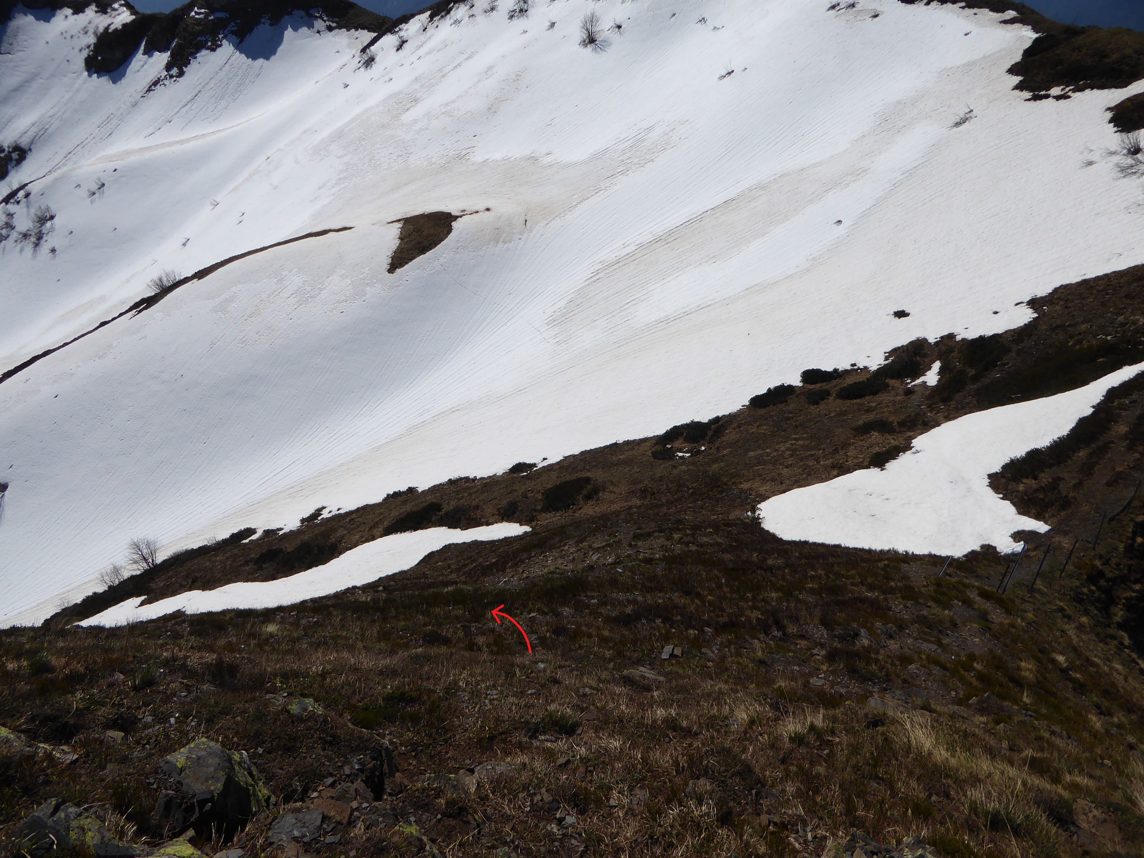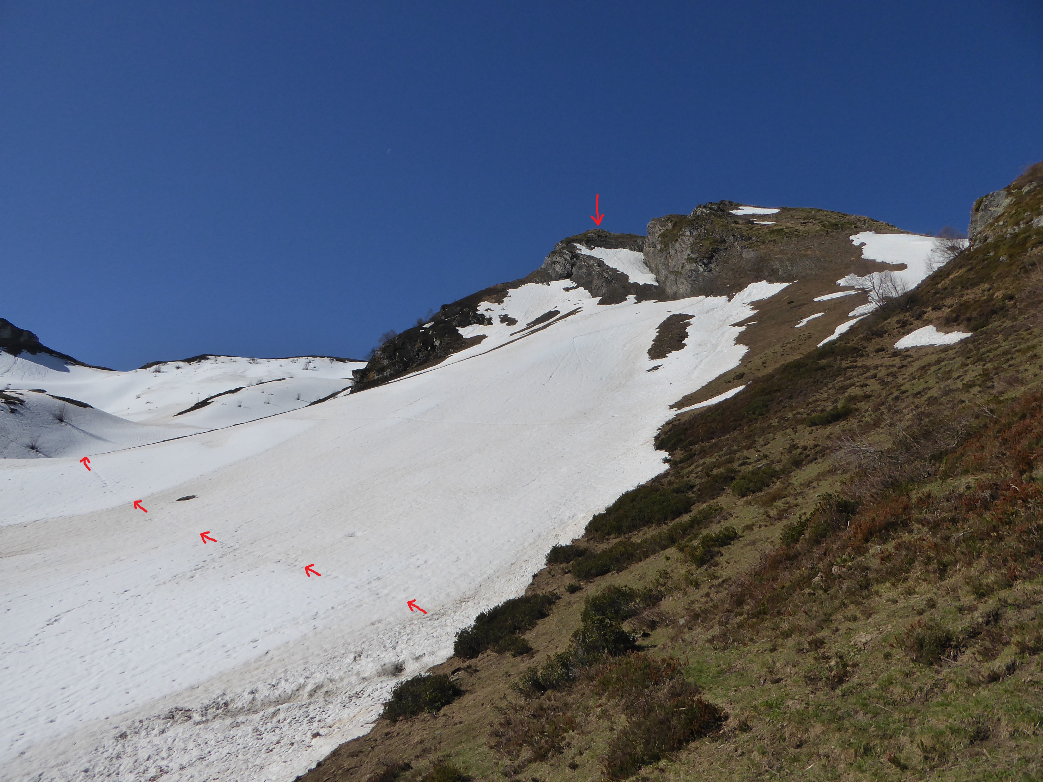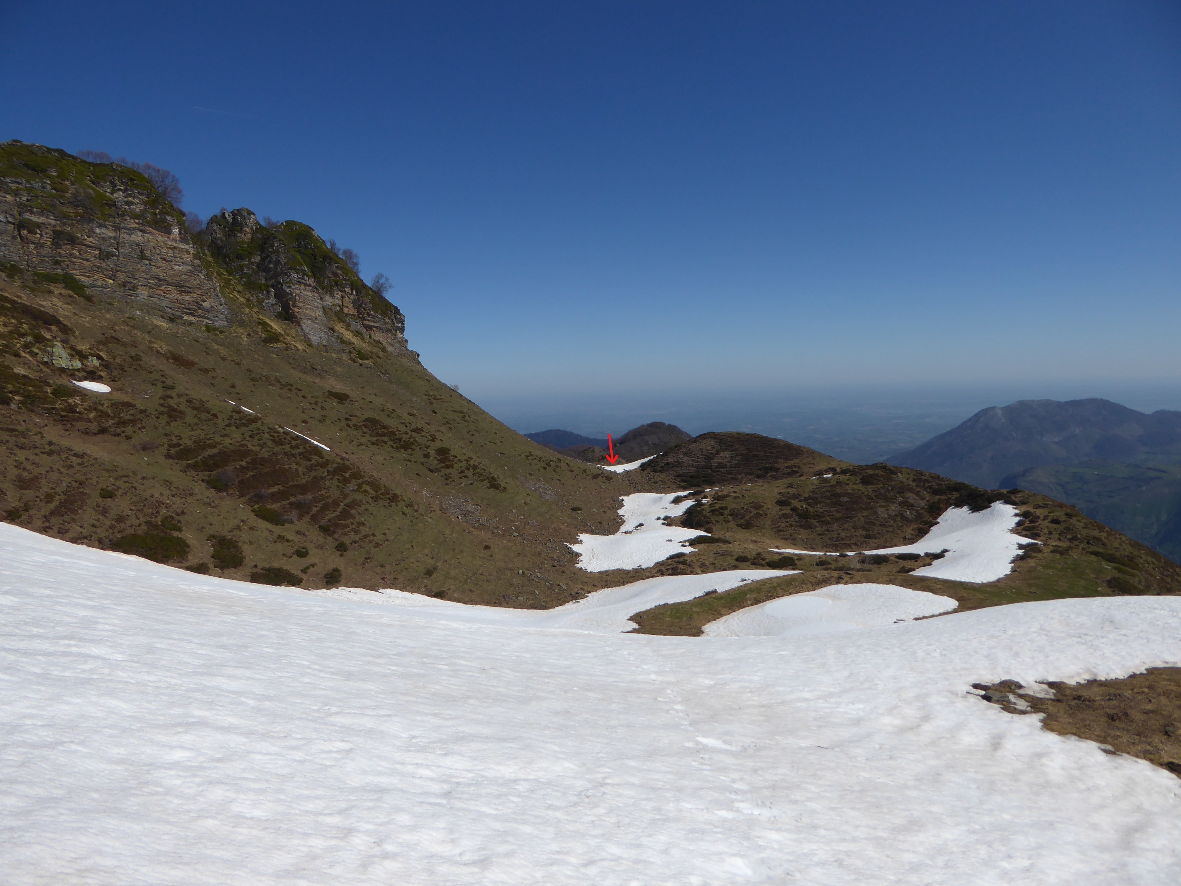En raison des névés, viser tant bien que mal le sommet que l'on aperçoit pas encore en suivant la ligne de crête de droite direction Pic de Gerbe