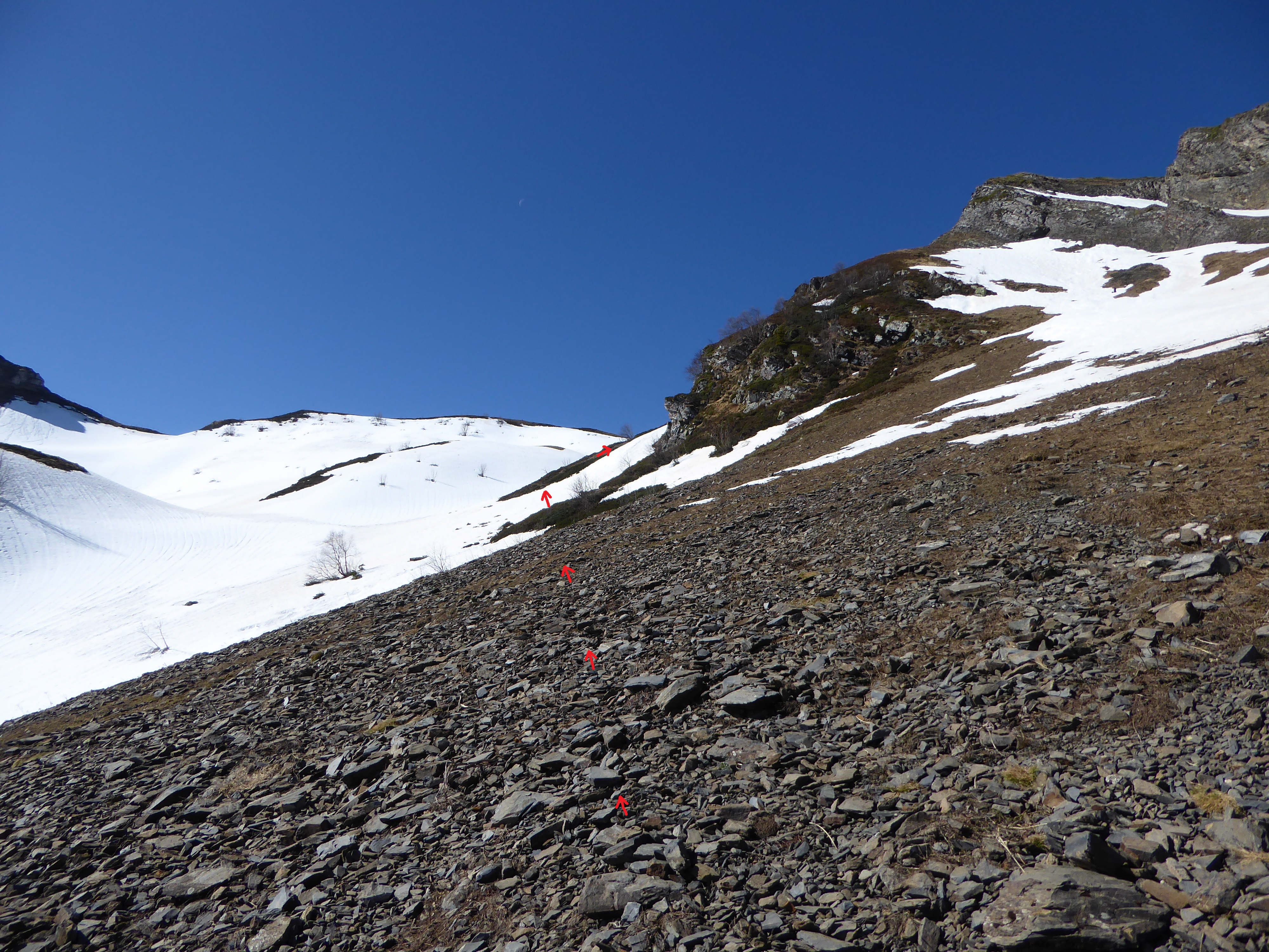 - Quelques névés dès 1500 mètres (névès avec neige glacée jusqu'au col, meuble après le col)