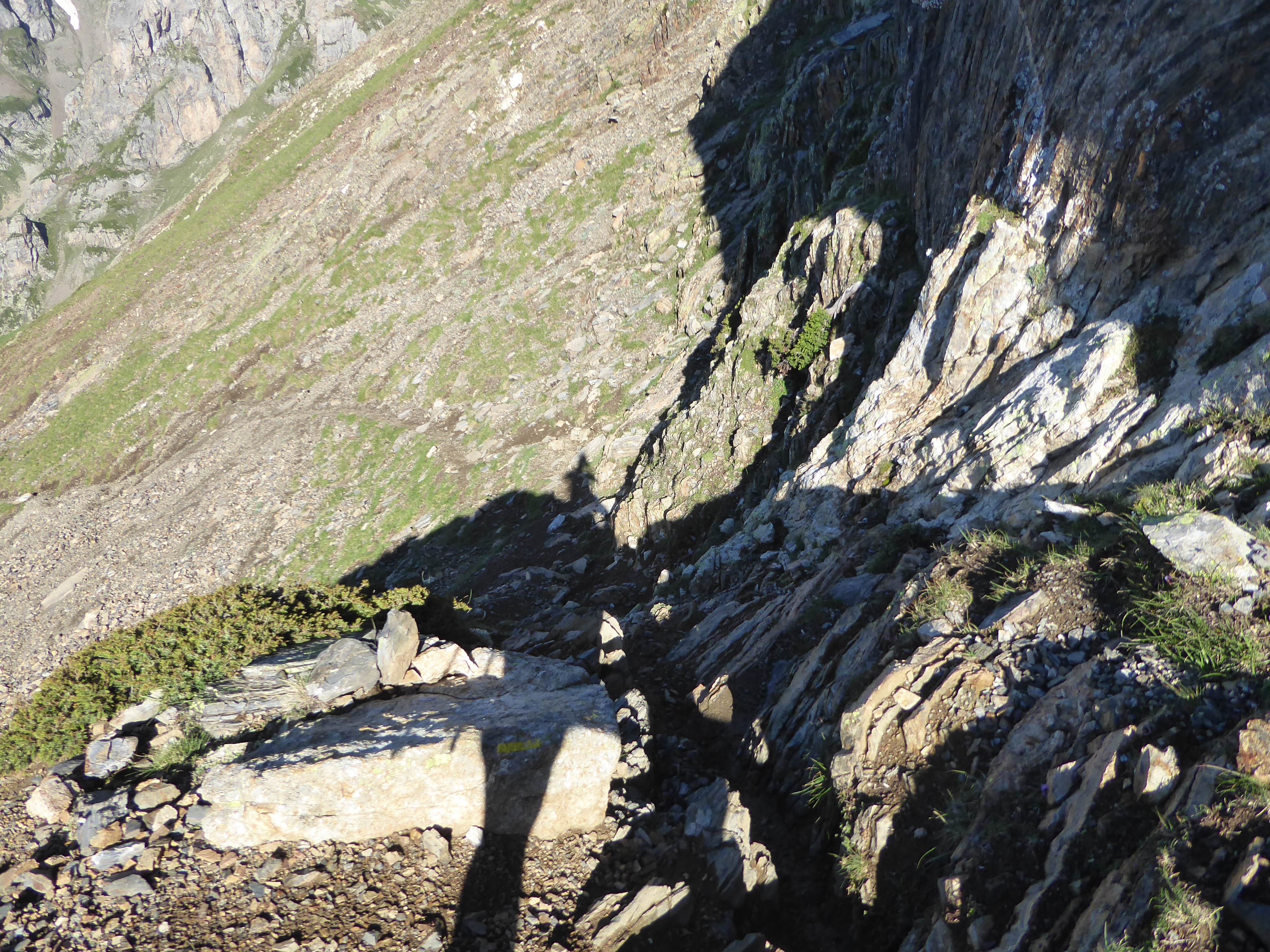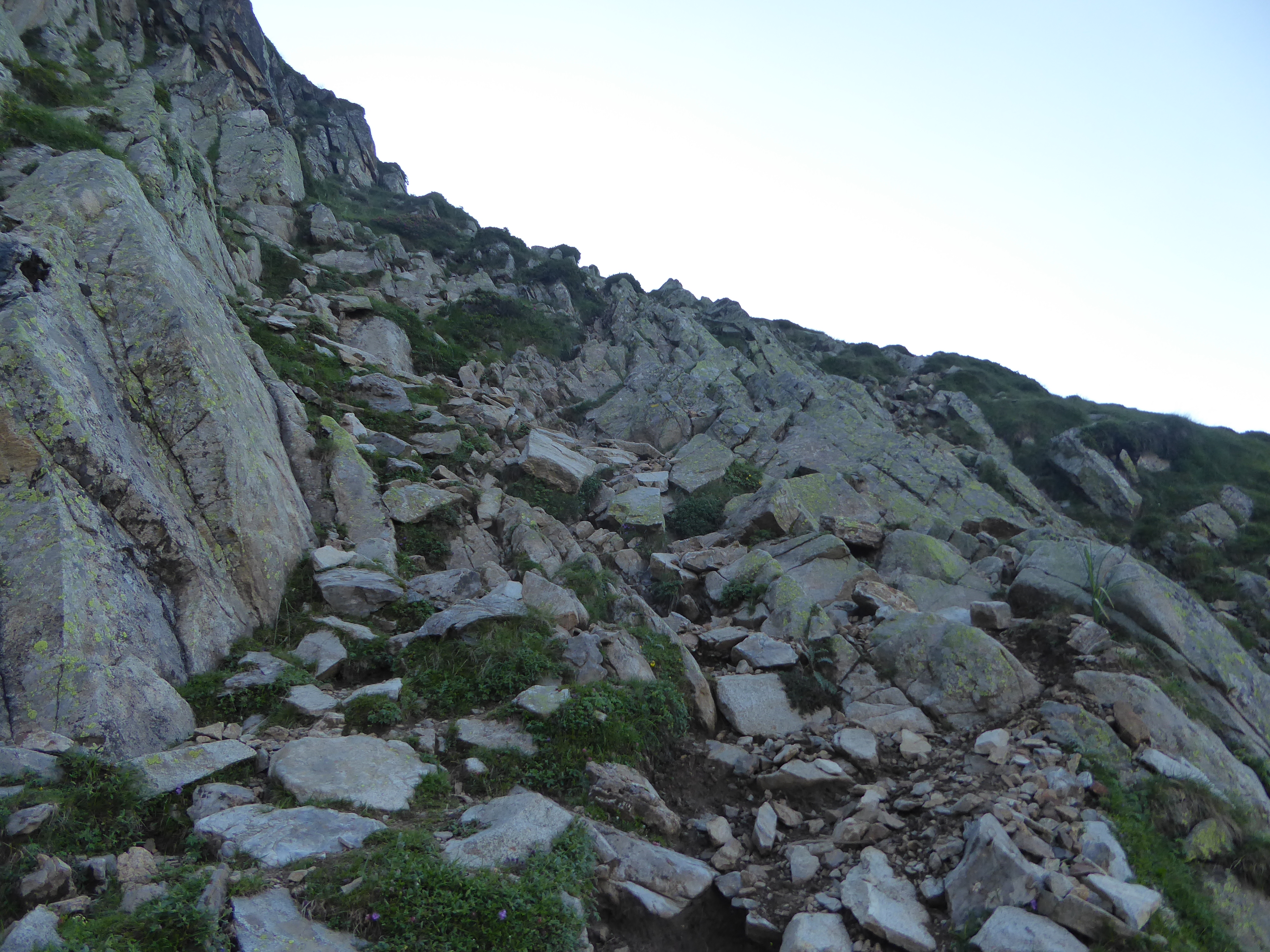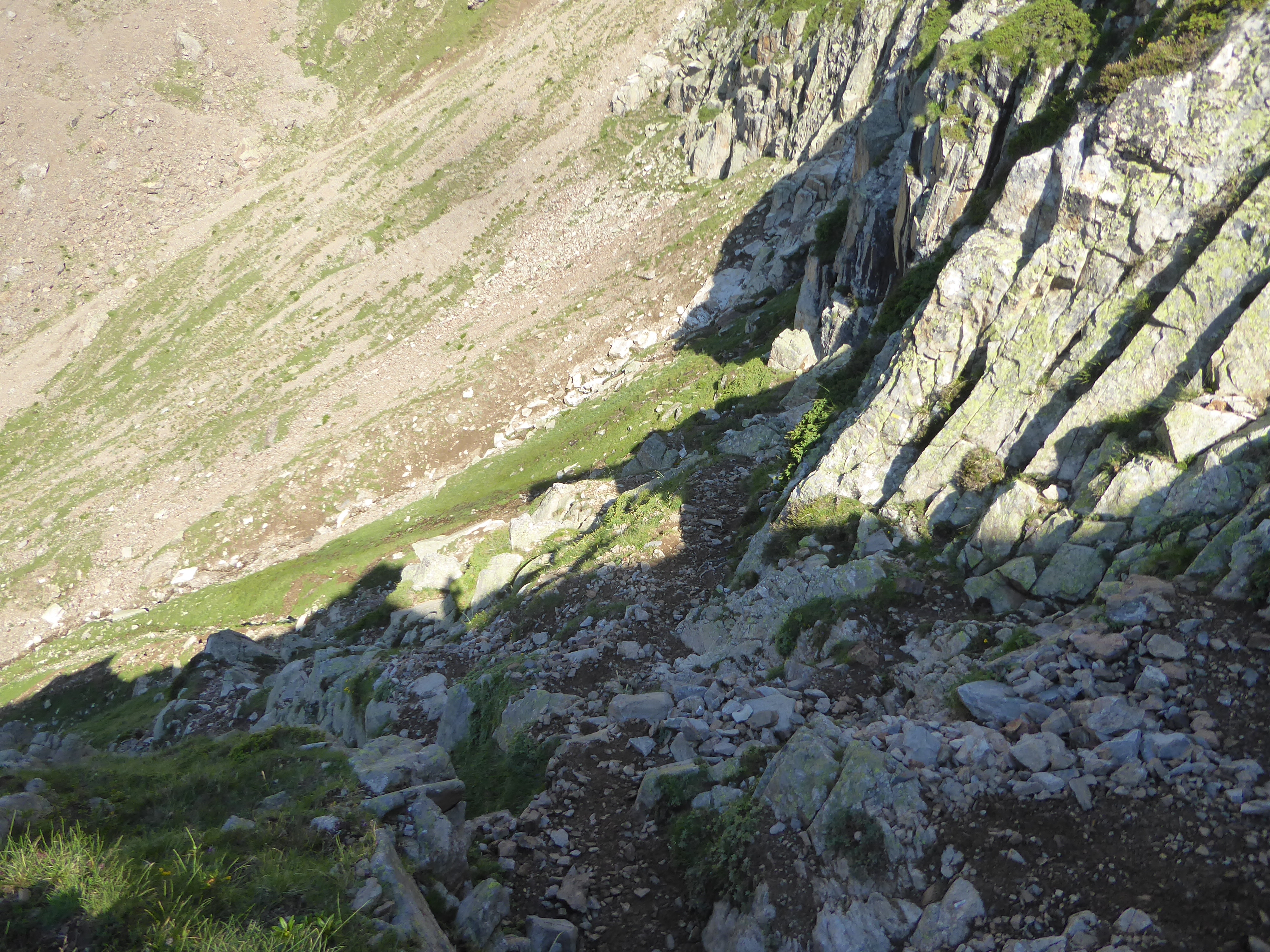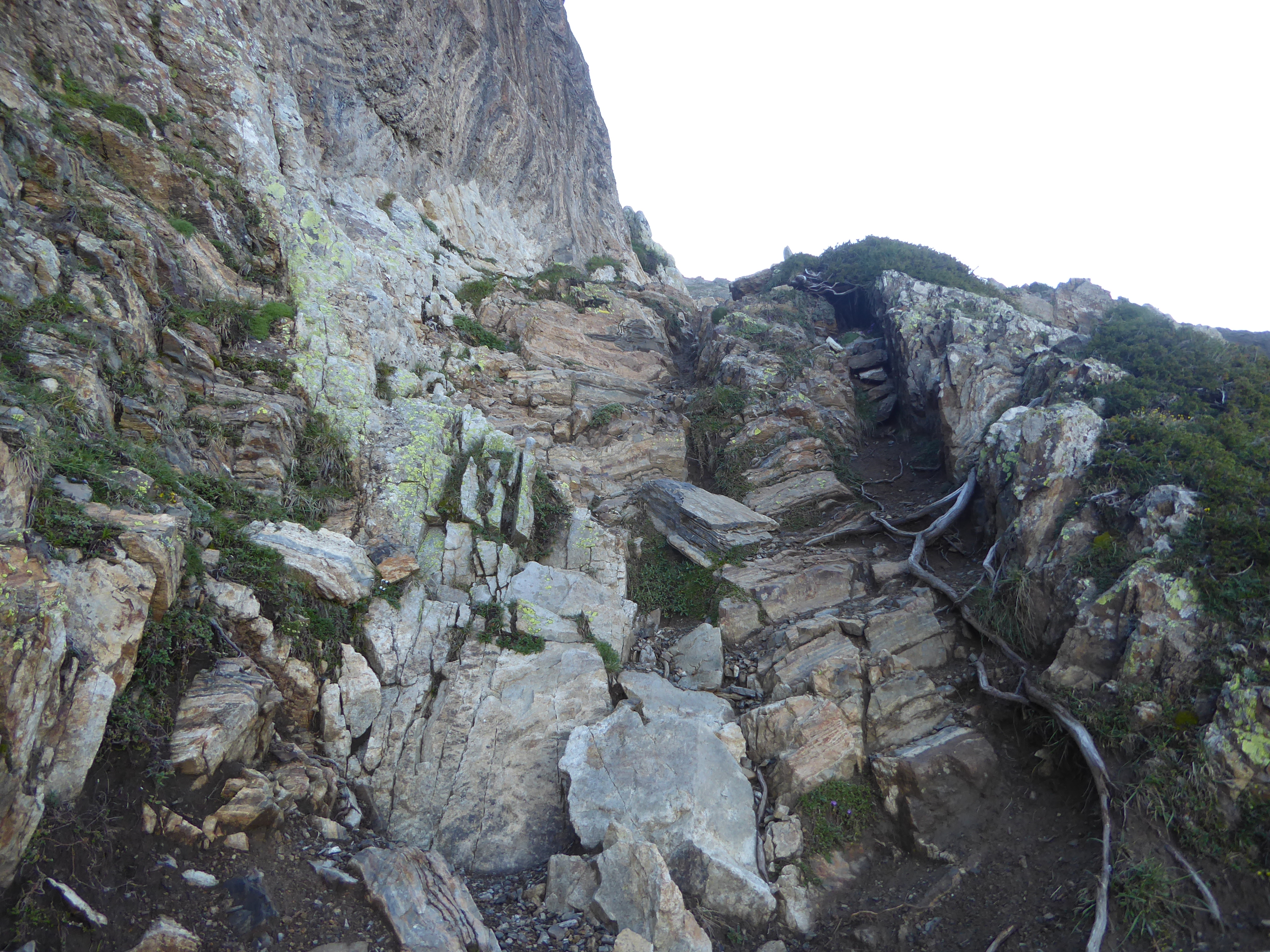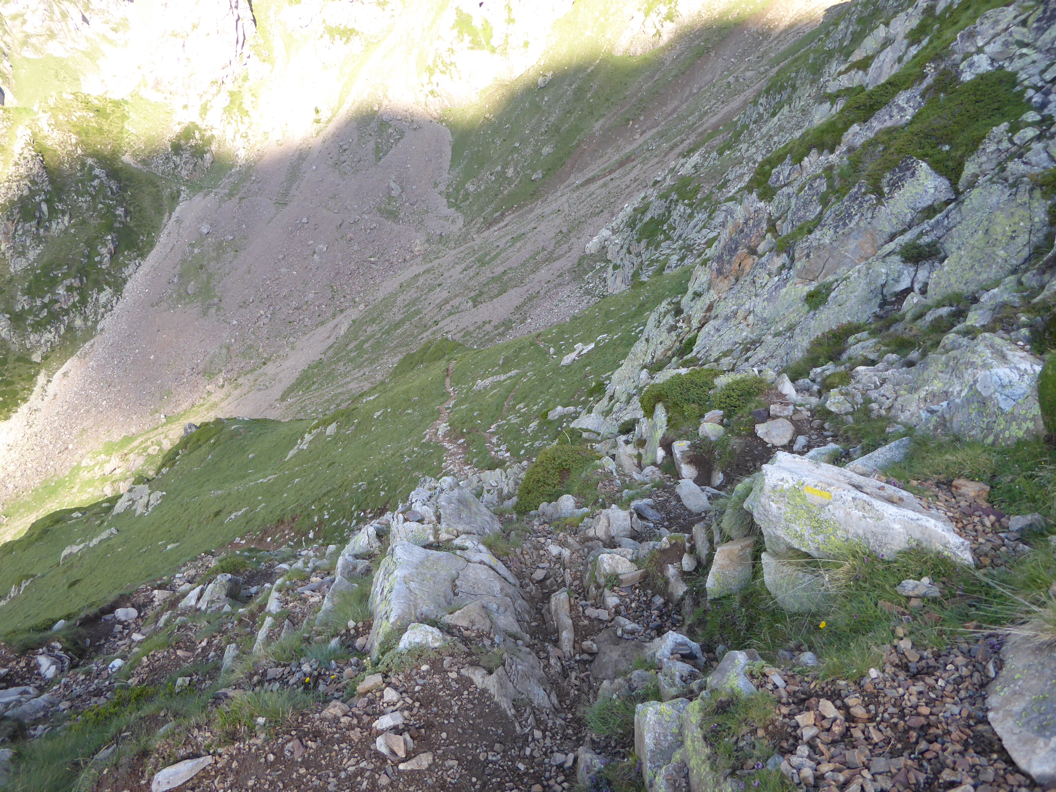 Barre rocheuse (2175 m) : descendre avec prudence cette barre rocheuse d'une trentaine de mètres sans difficulté technique direction Granges de Lurgues, balisé en jaune (les photos ont l'air d'être impressionnantes mais il n'y a aucune sensation de vide !!!)