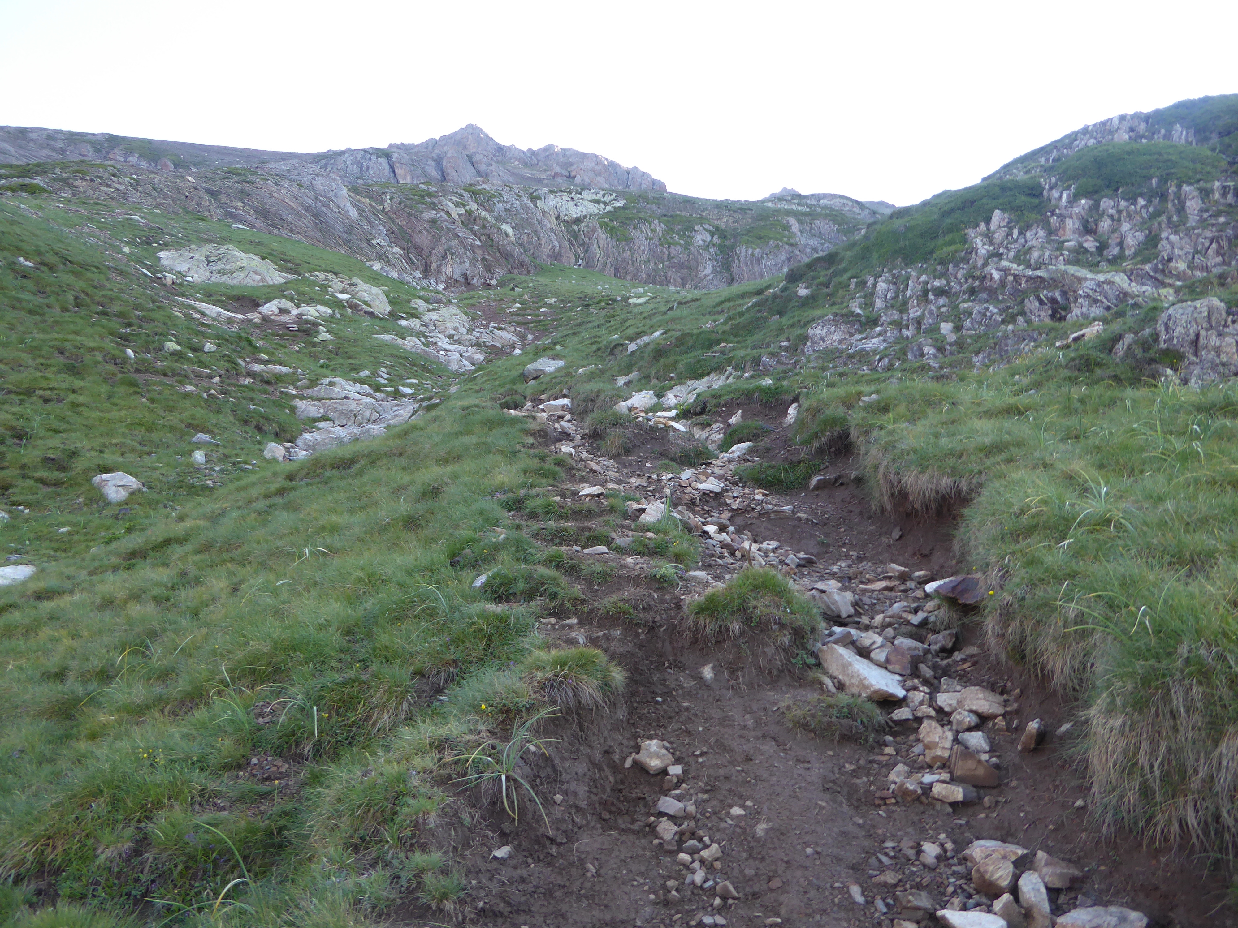 Barre rocheuse (2205 m) : descendre avec prudence cette barre rocheuse d'une vingtaine de mètres sans difficulté technique direction Granges de Lurgues, balisé en jaune