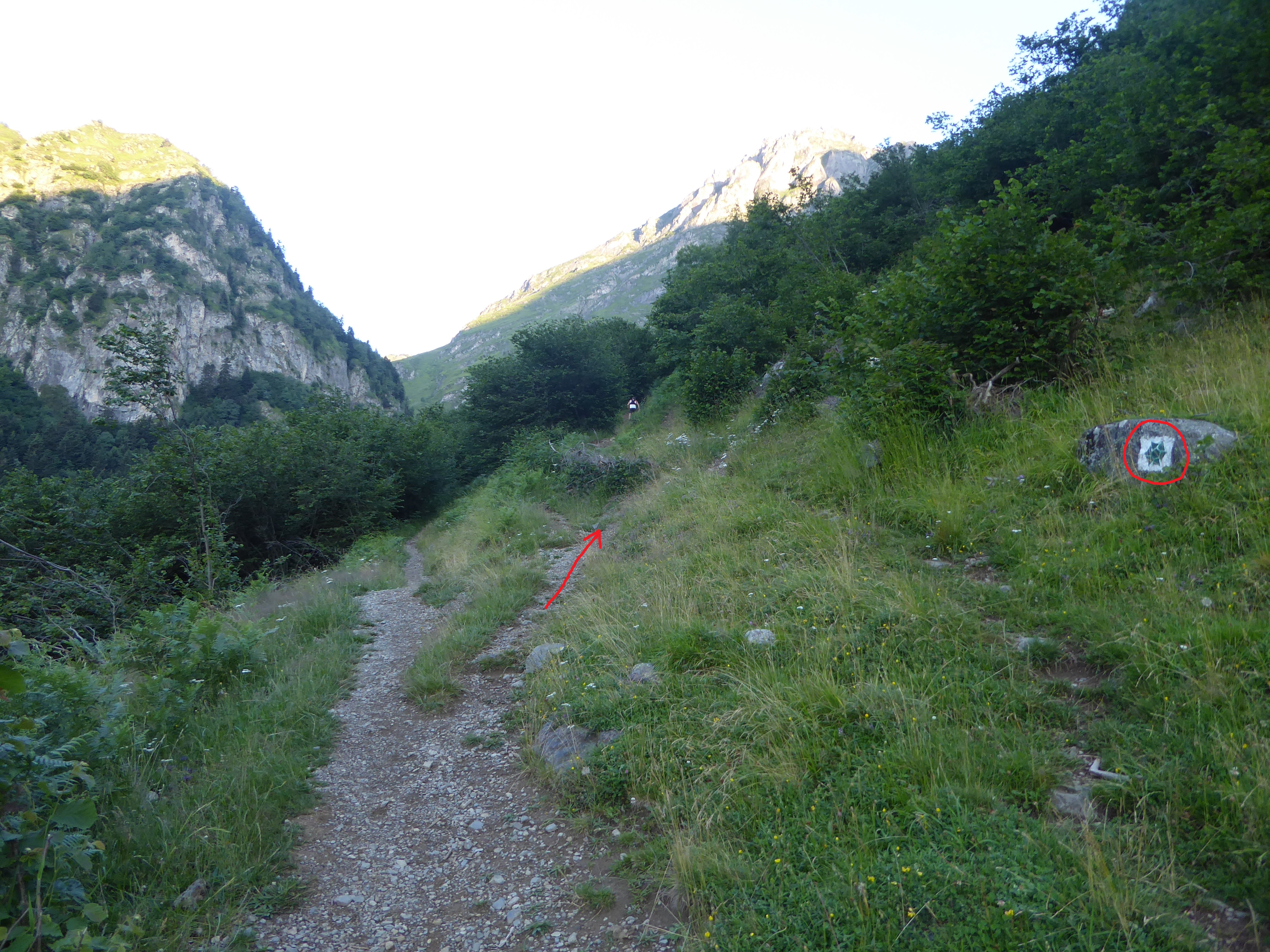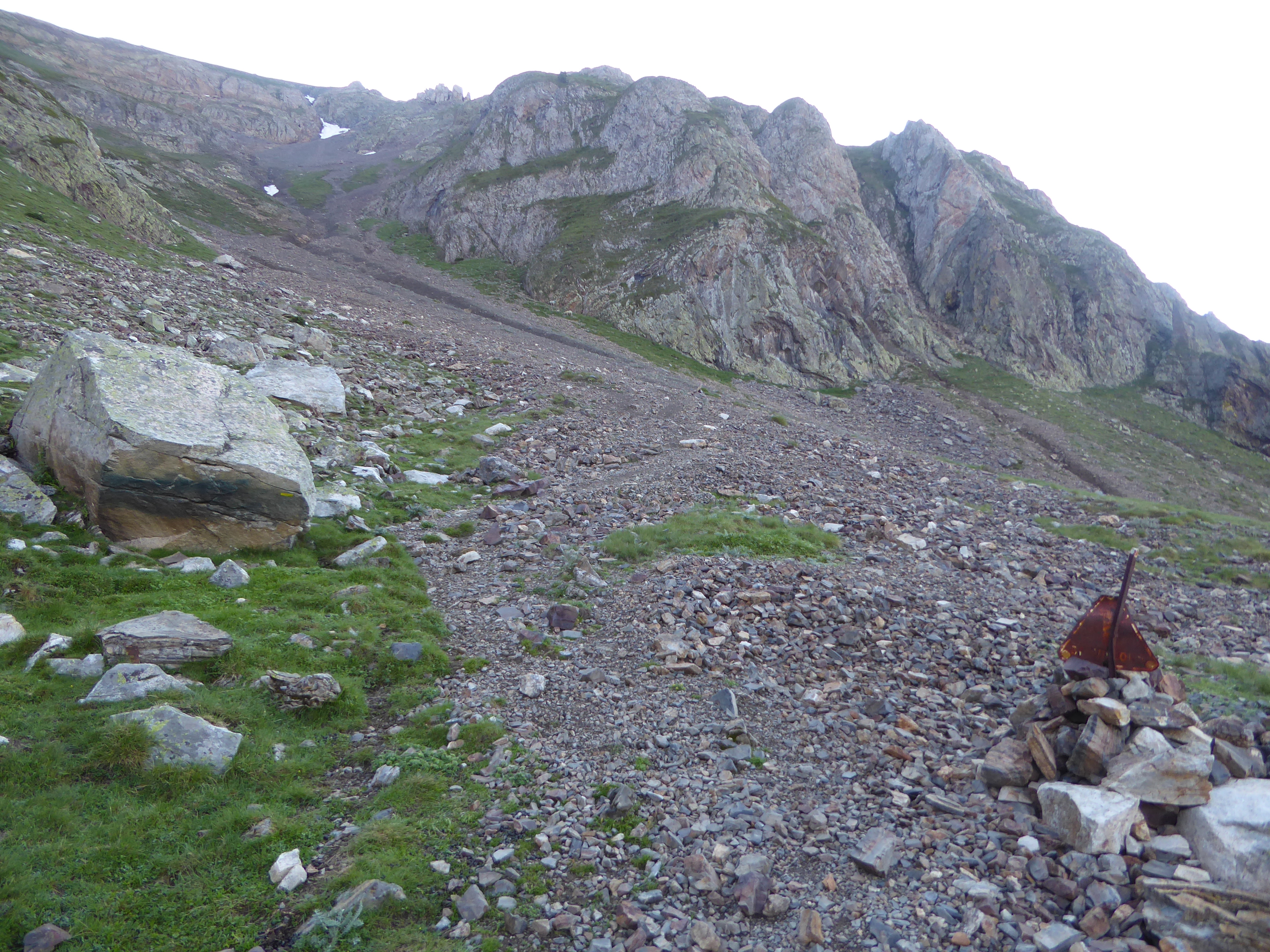 Au niveau de ce panneau désuet (2262 m), suivre les lacets serpentant dans la pierraille direction l'Arbizon, balisé en jaune (la pente devient encore plus raide !)