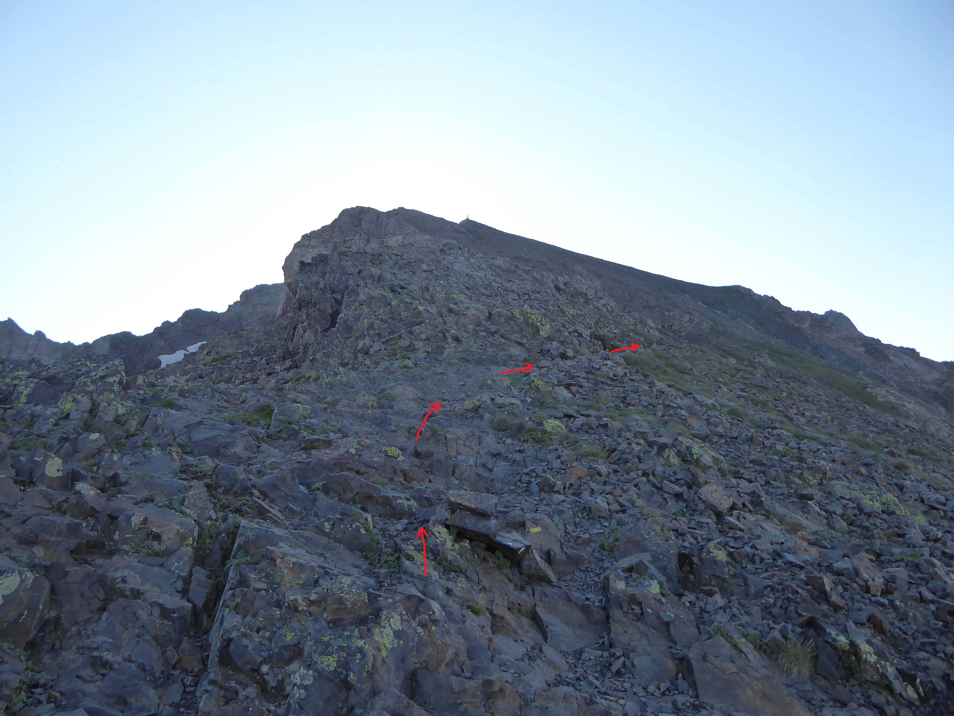 Au niveau de cette barre rocheuse à la base du sommet, suivre le chemin contournant cette difficulté par la droite direction l'Arbizon, balisé en jaune