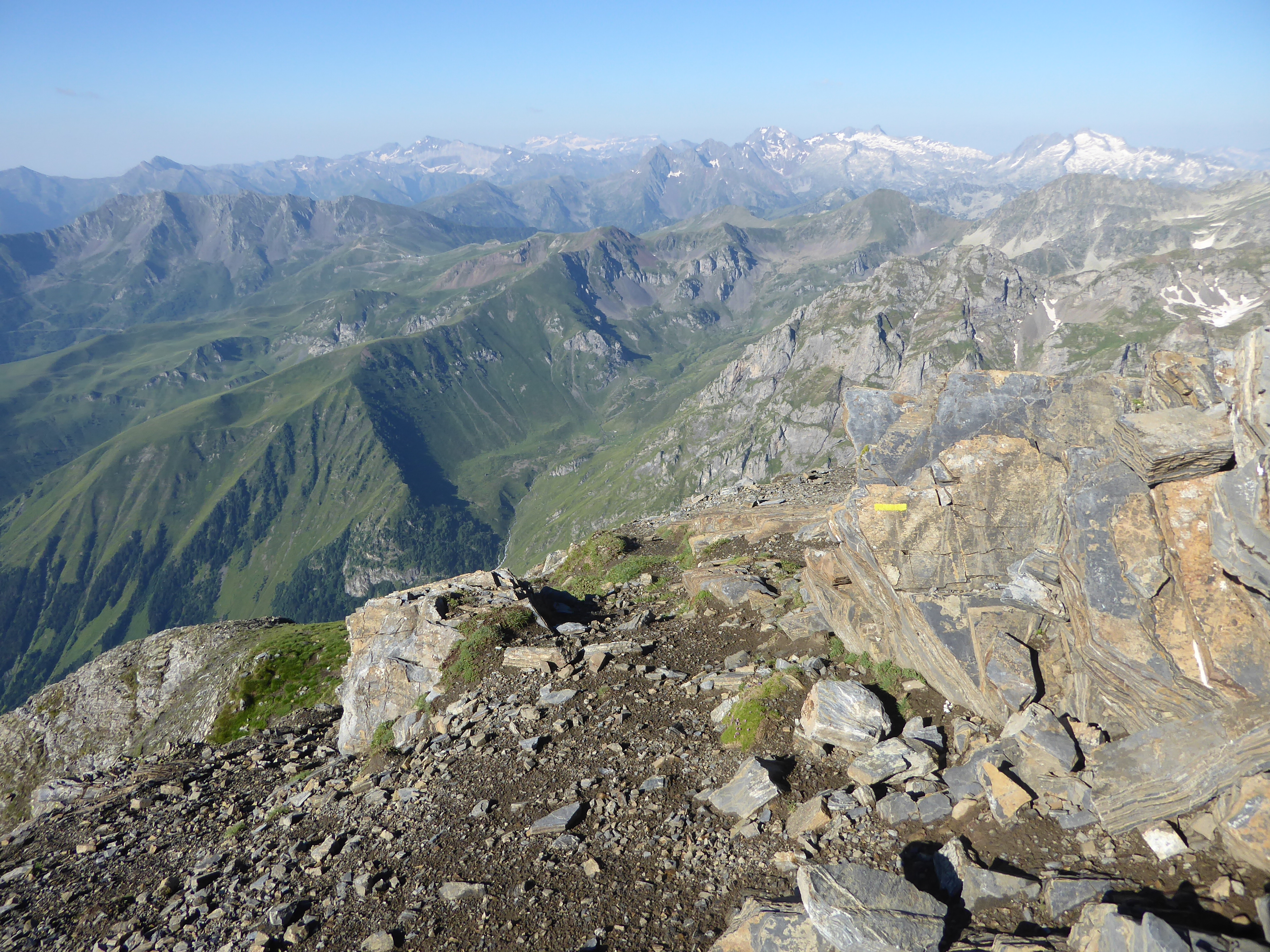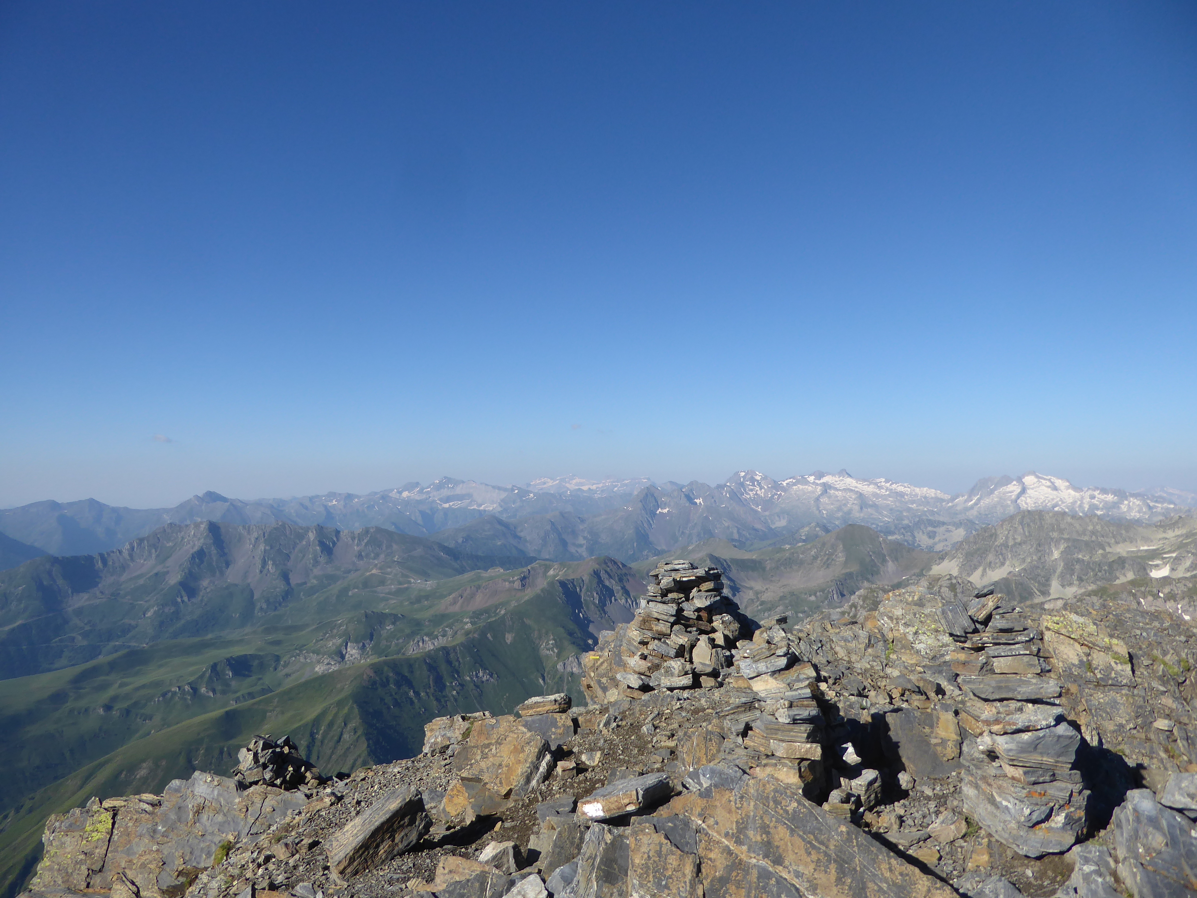 Arrivée au sommet de l'Arbizon (2831 m) : panorama très étendu malgré la présence de brume de chaleur des sommets ariégeois peu visibles jusqu'aux sommets béarnais en passant par l'Aneto, le Luchonnais, ... et la plaine !
