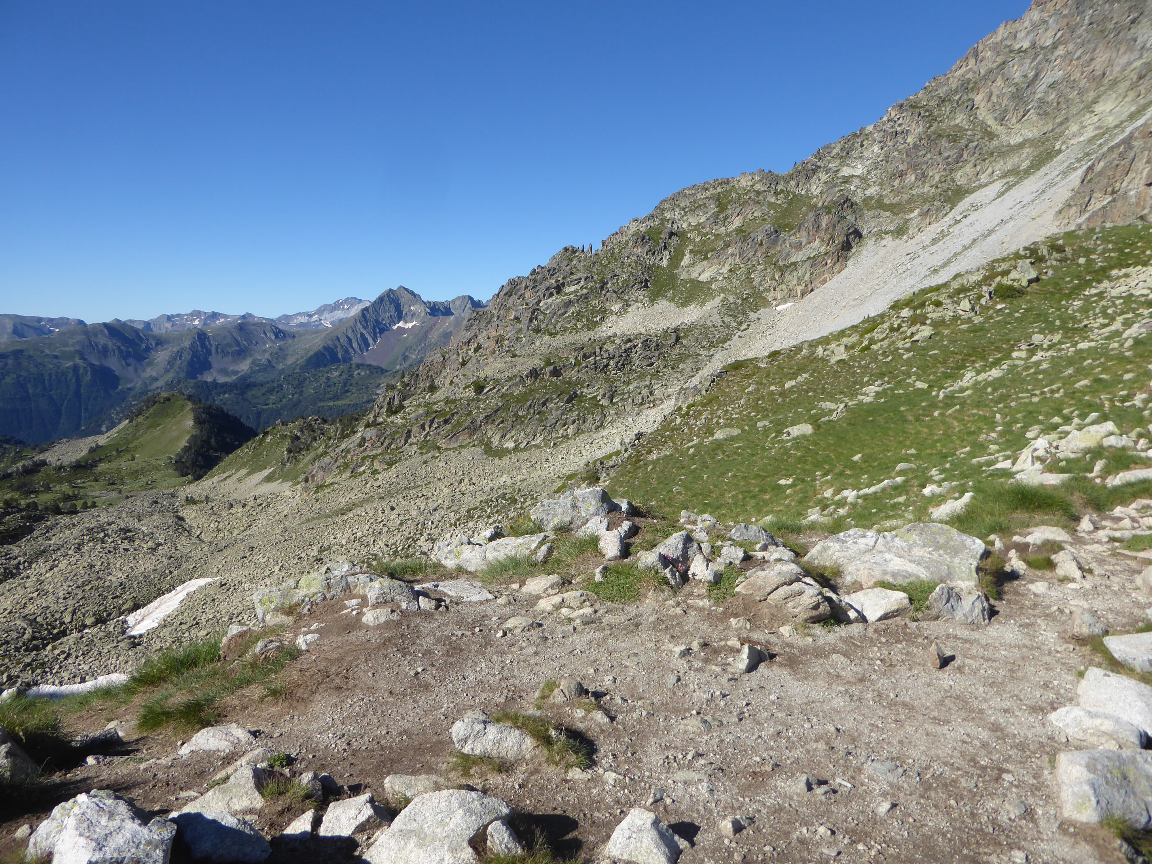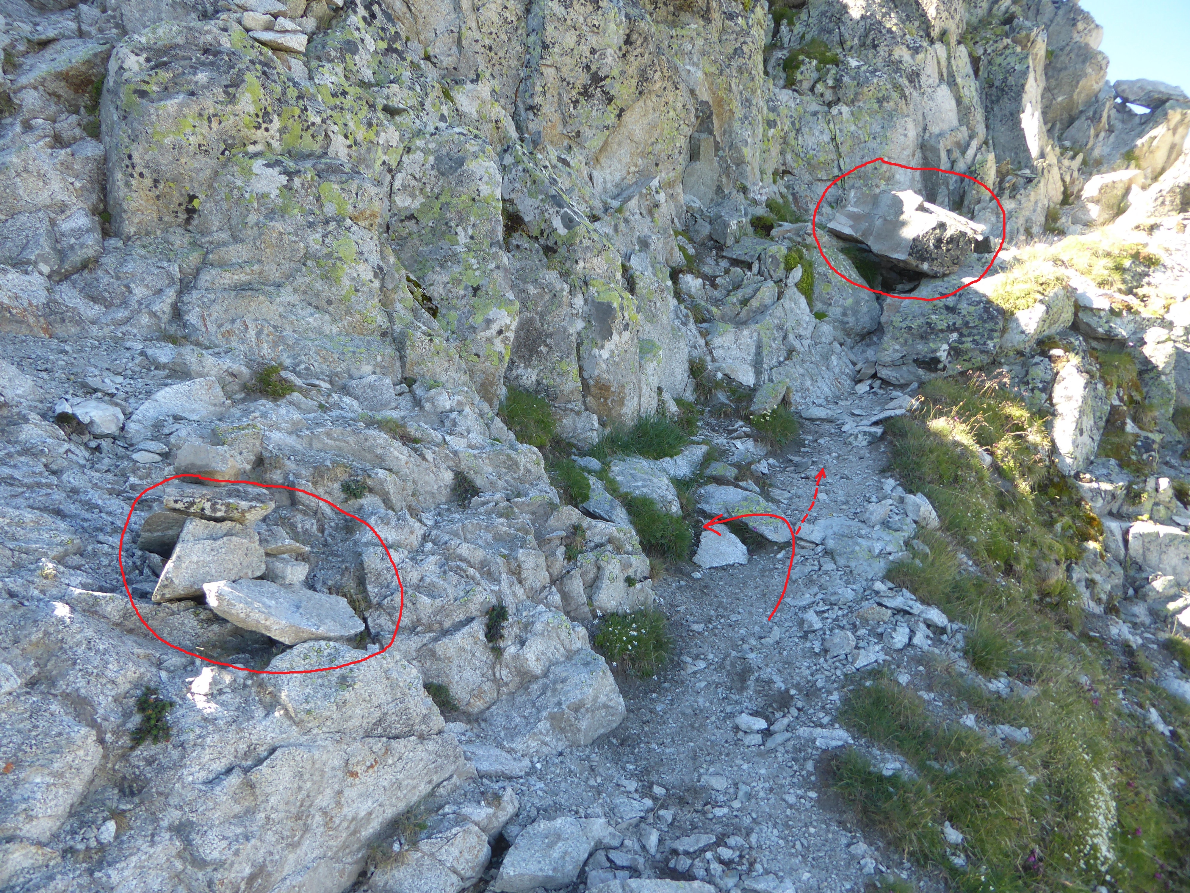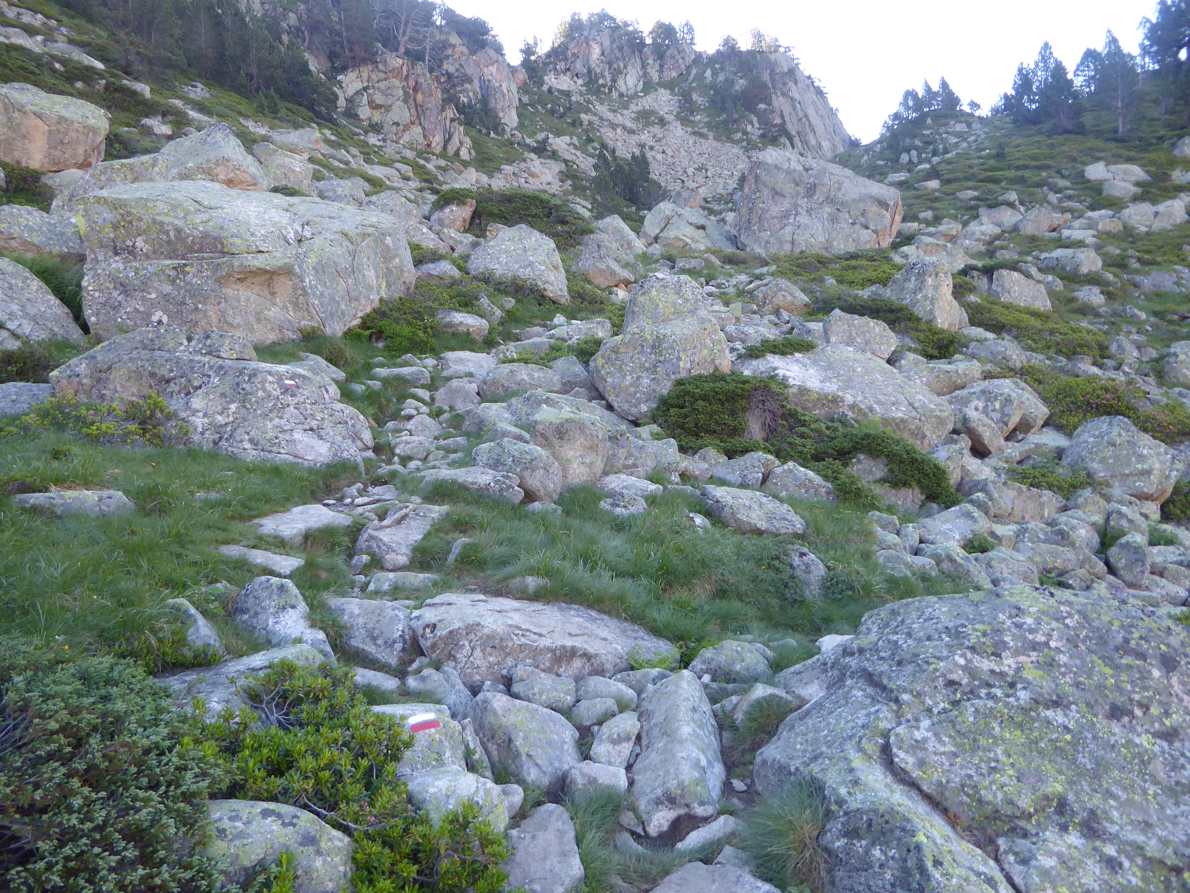 Lac de Gréziolles (2126 m) : suivre le chemin traversant ce chaos rocheux direction Col de Bastanet, balisé en rouge et blanc