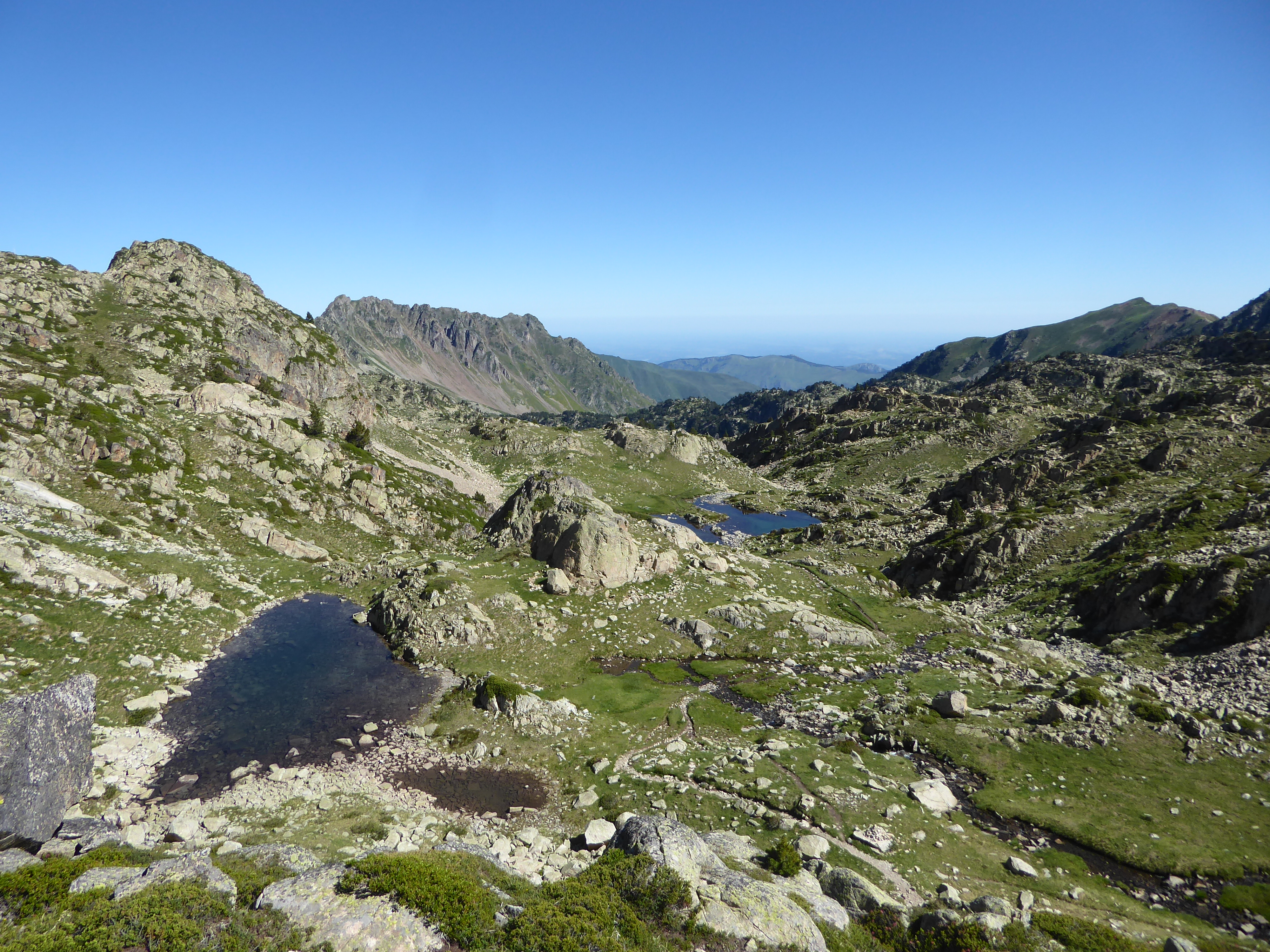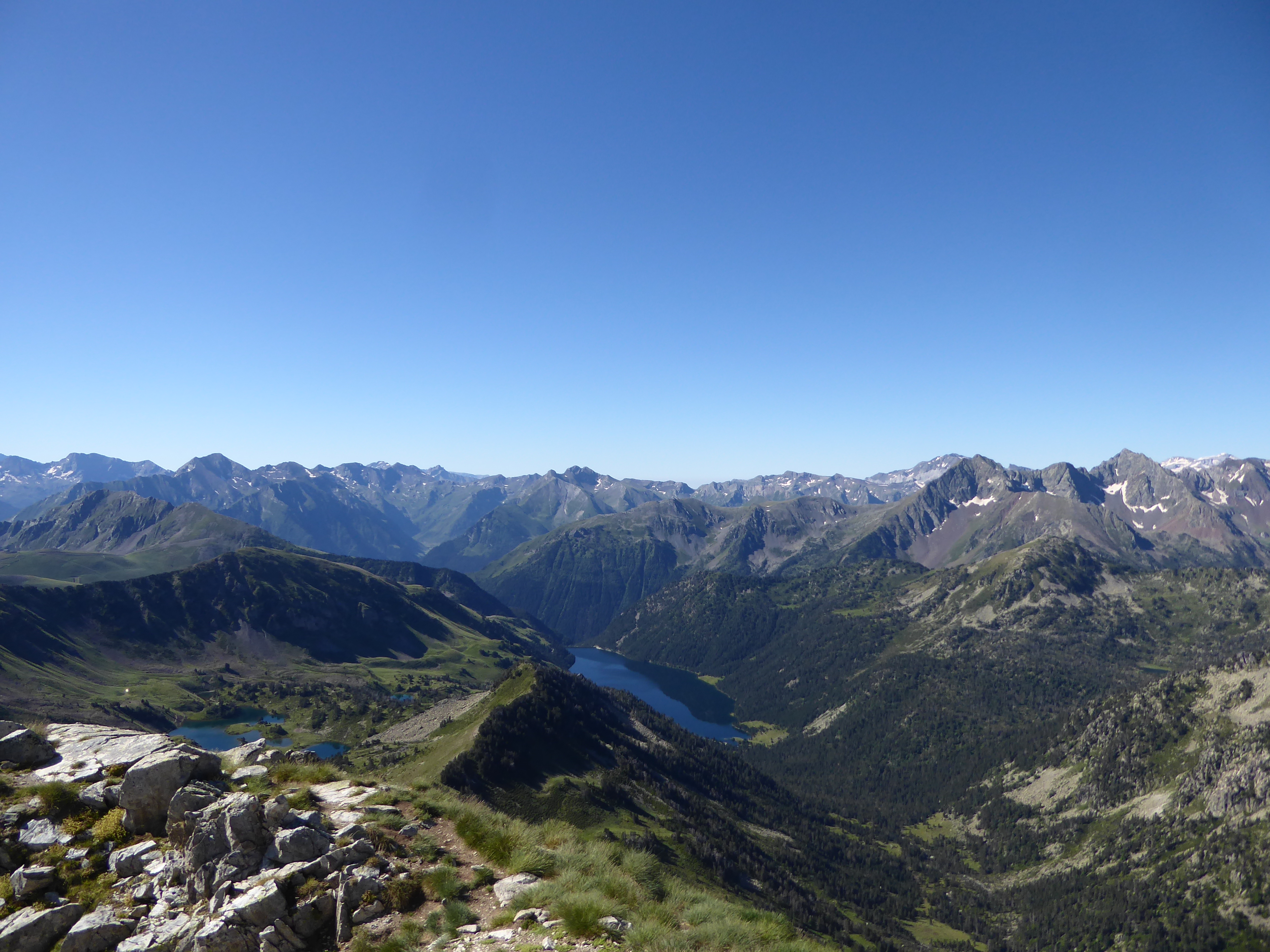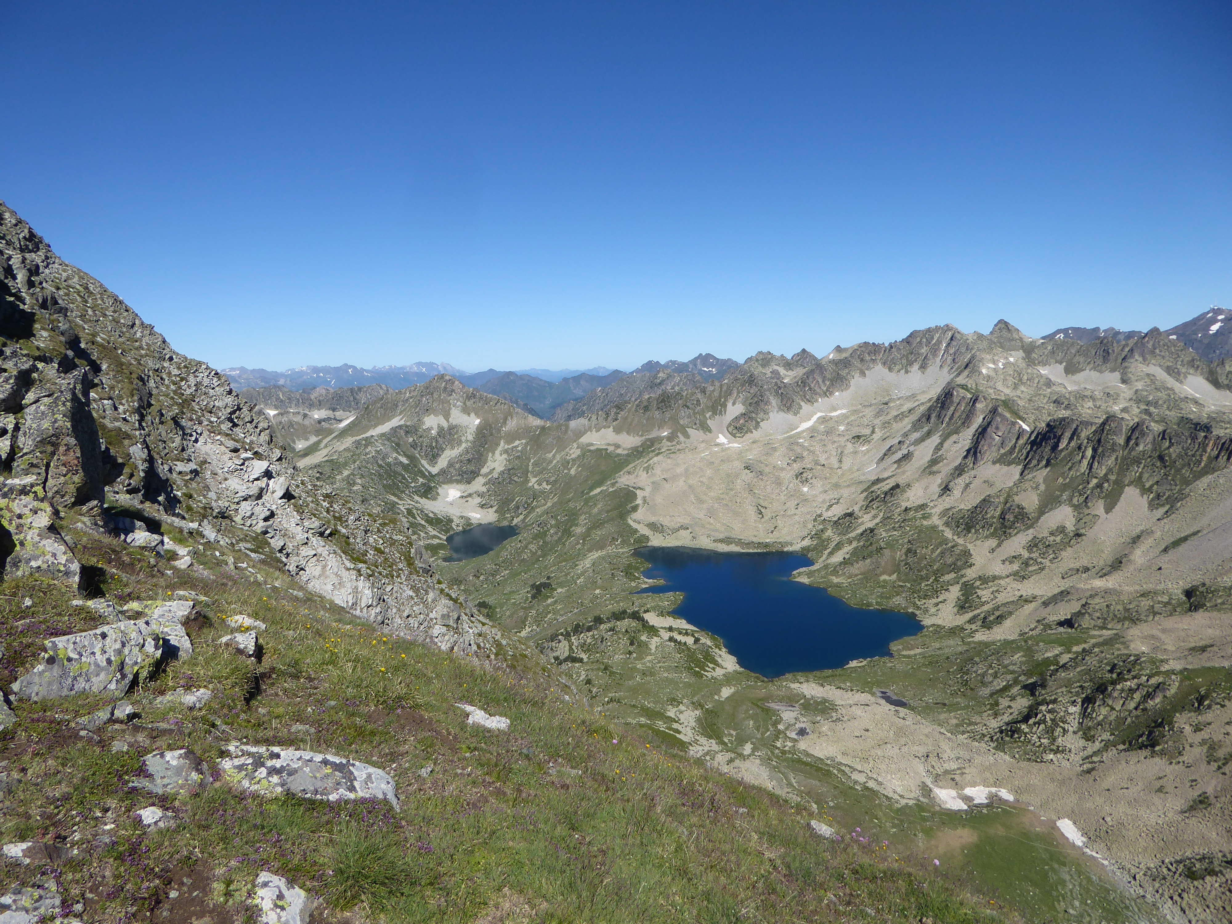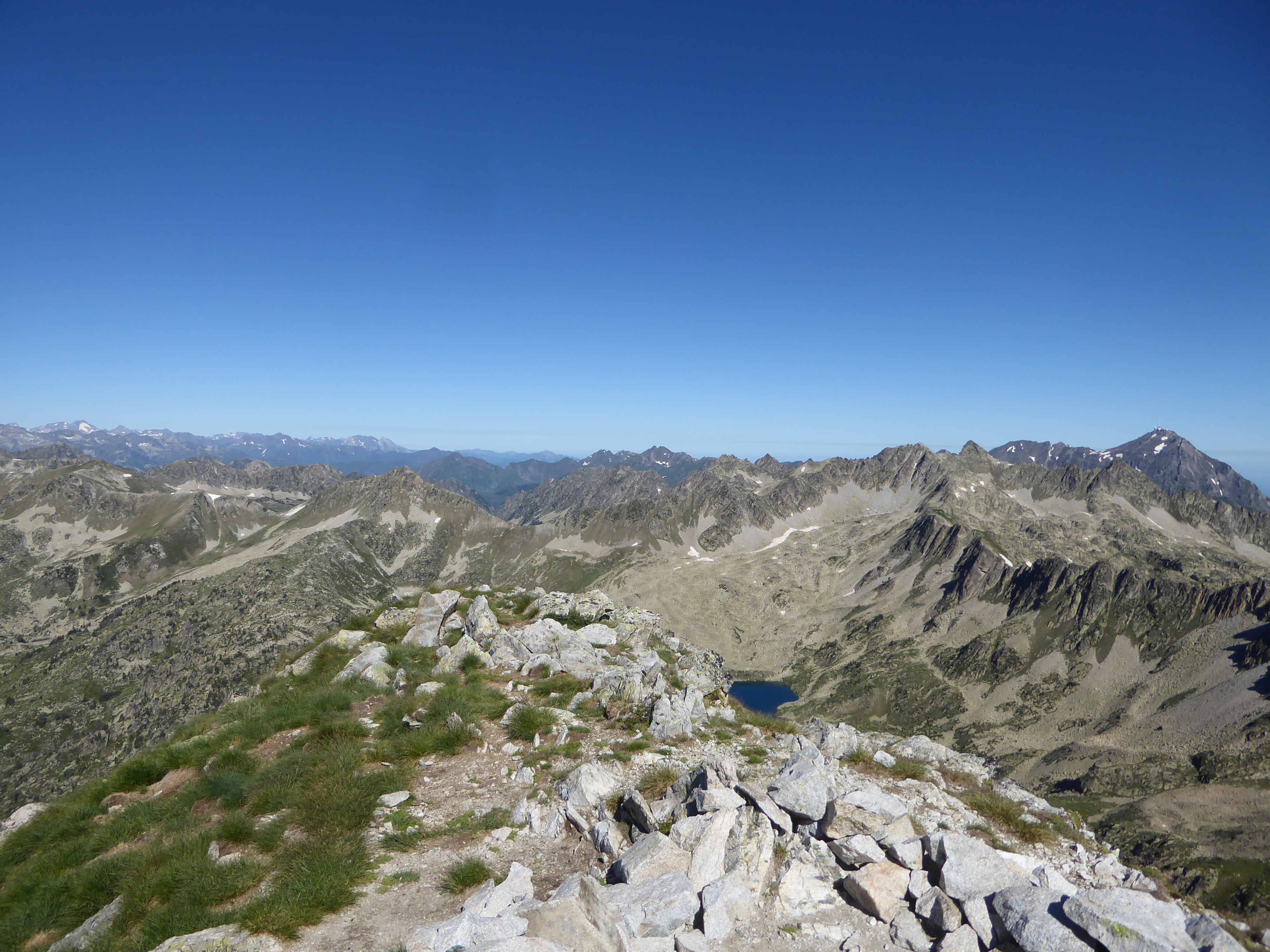 Arrivée au sommet du Pic de Bastan (2715 m) : superbe panorama aujourd'hui sur les sommets allant de l'Ariège jusqu'au Béarn en passant par les sommets espagnols frontaliers ... avec en prime les différents lacs plus bas !