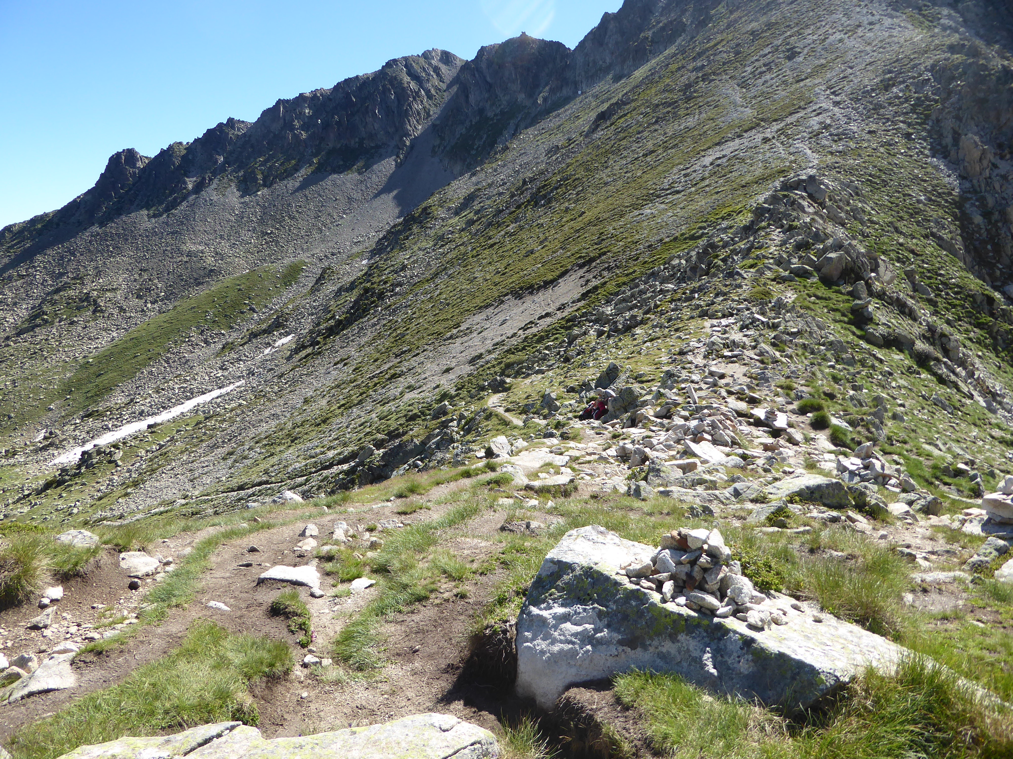 Au niveau de ce cairn situé avant ce rocher "bloquant" le chemin partant tout droit, deux possibilités : soit continuer sur ce même chemin puis rejoindre le sommet sur la gauche par de l'escalade facile (exposée au vide) soit tourner immédiatement à gauche et suivre le semblant de chemin serpentant jusqu'au sommet (moins exposé au vide) ; deuxième option choisie !