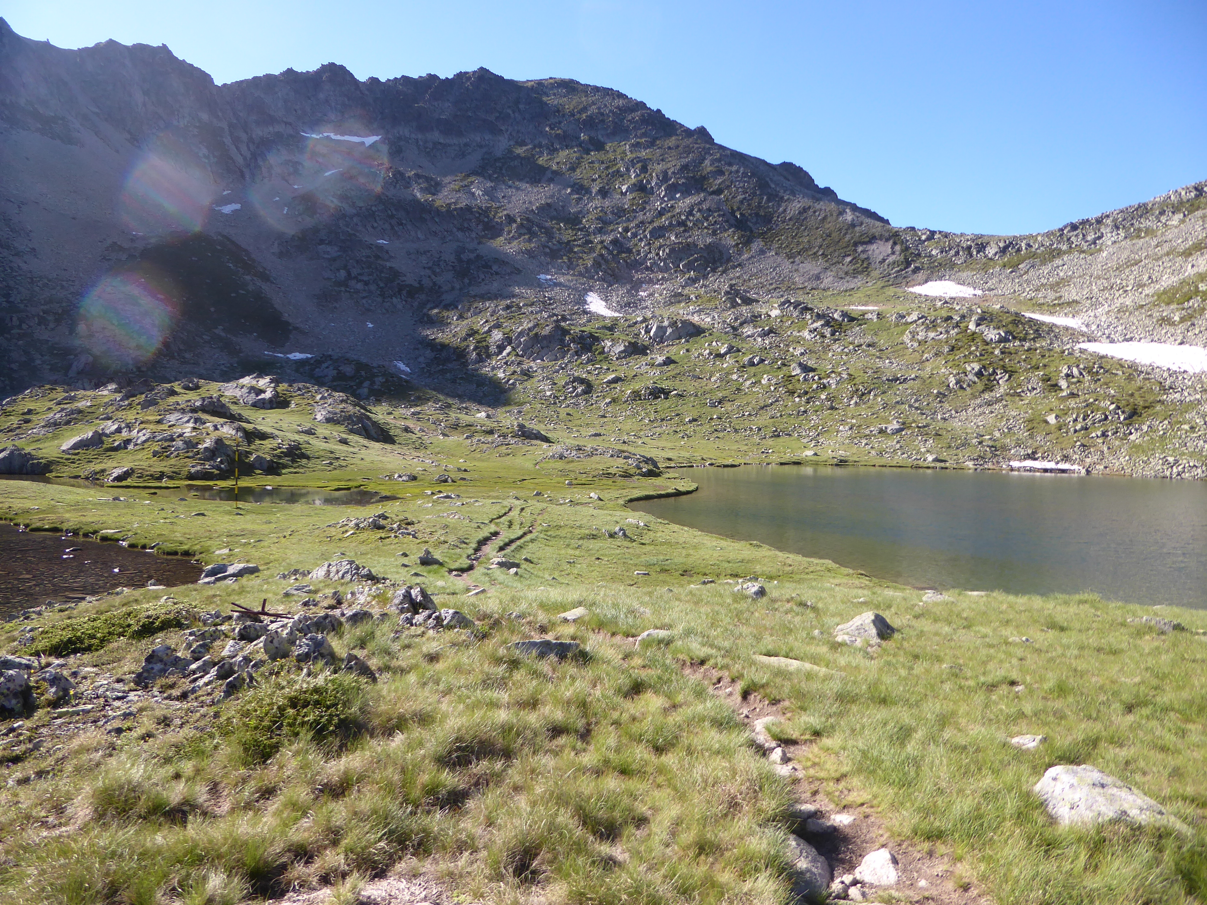 Lac de Gréziolles (2126 m) : continuer à suivre le chemin longeant le lac direction Virage du Garet, balisé en rouge et blanc