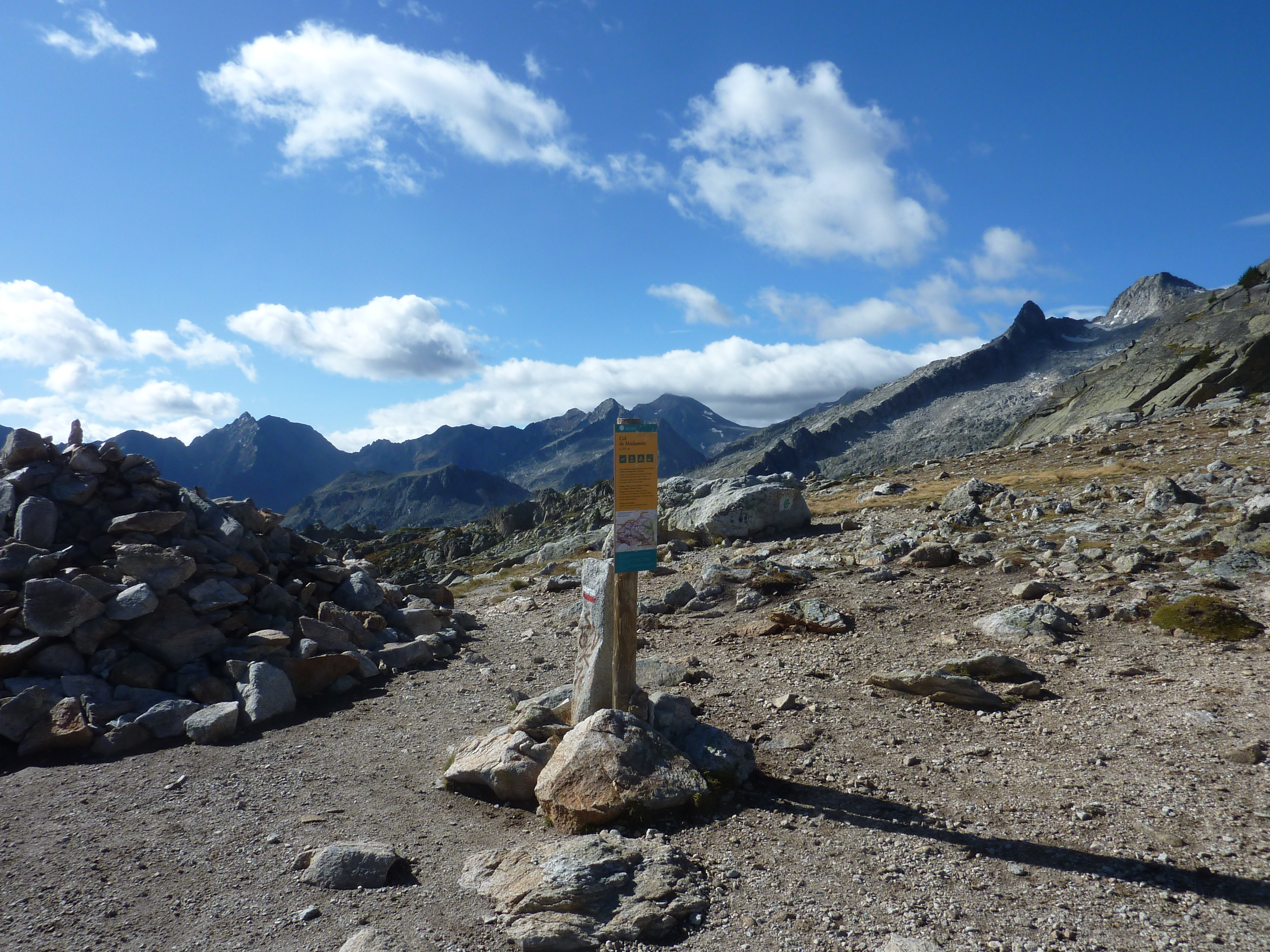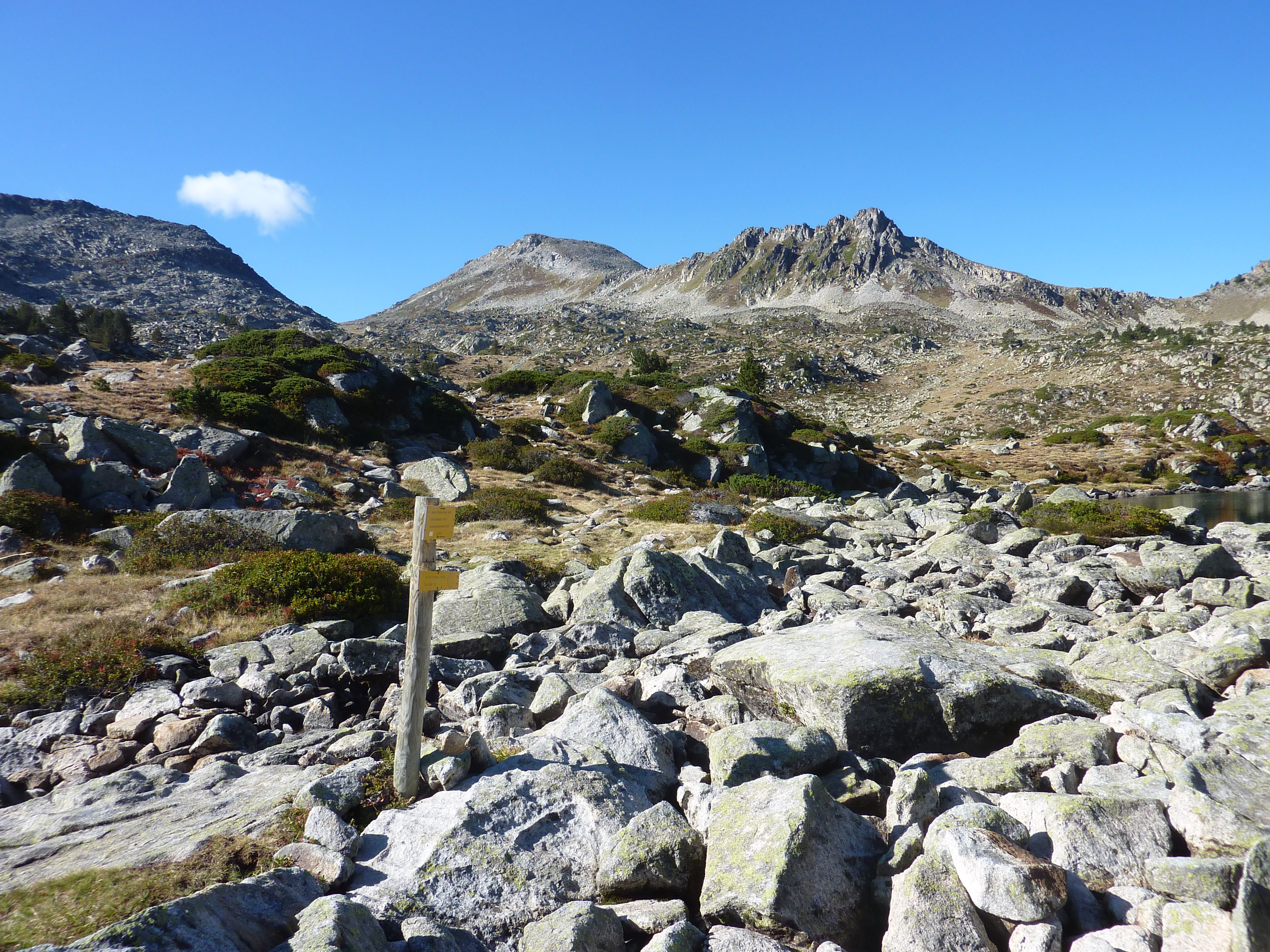 A ce croisement situé au niveau des Lacs de Madamète et marqué par la présence d'un panneau directionnel (1300 mètres après la Cabane d'Aygues Cluses), suivre le chemin mal tracé passant à travers les rochers partant tout droit direction Col de Madamète, balisé en rouge et blanc (bien suivre les balises rouges et blanches)