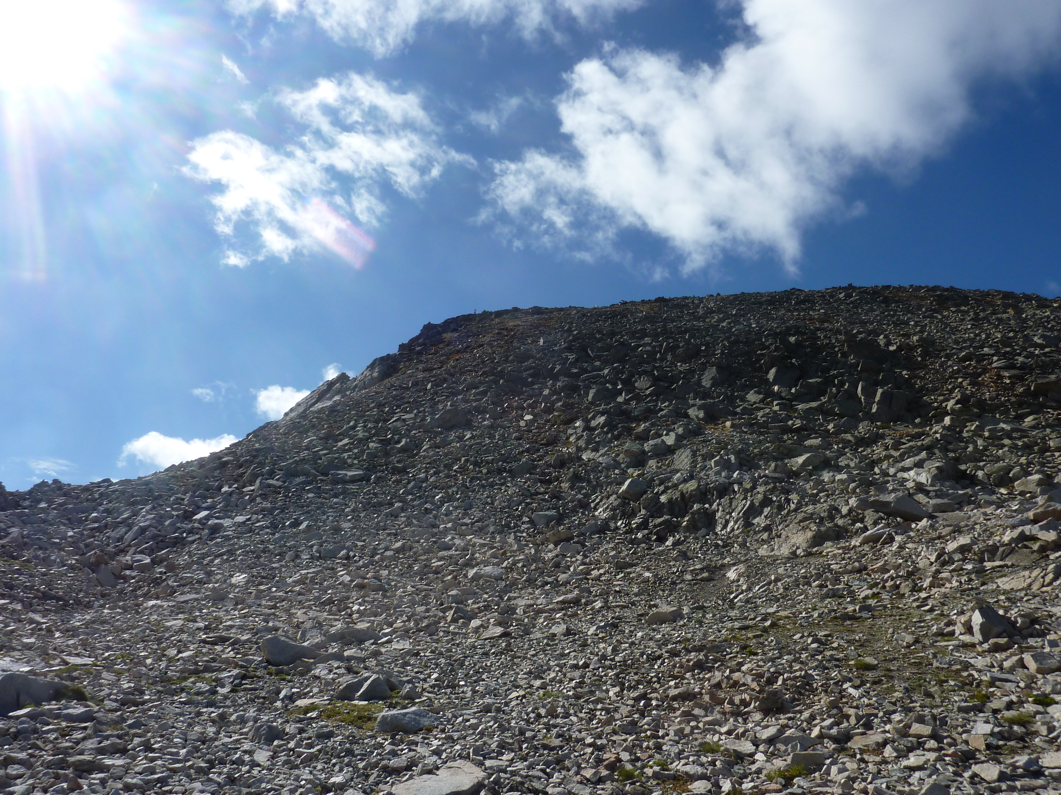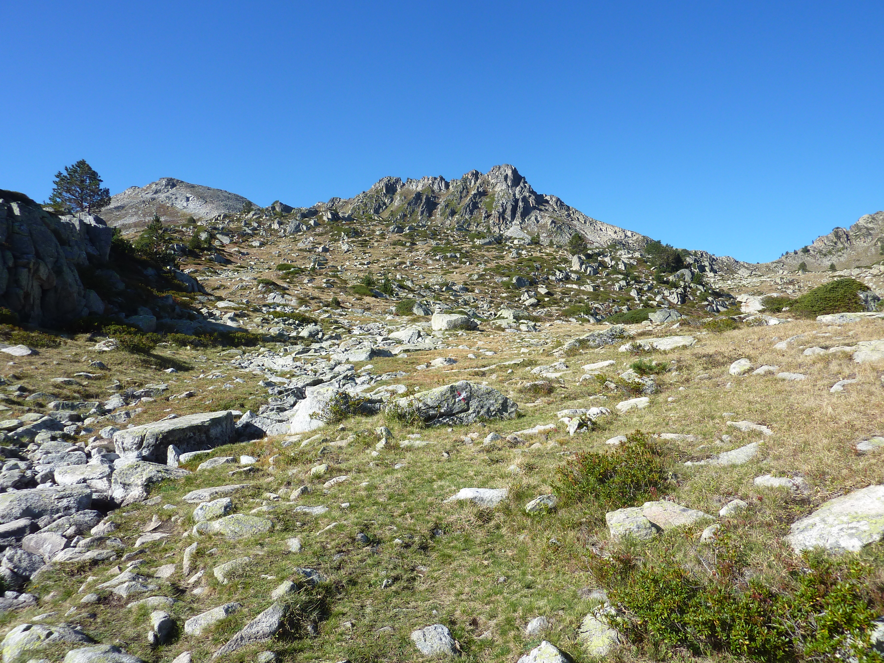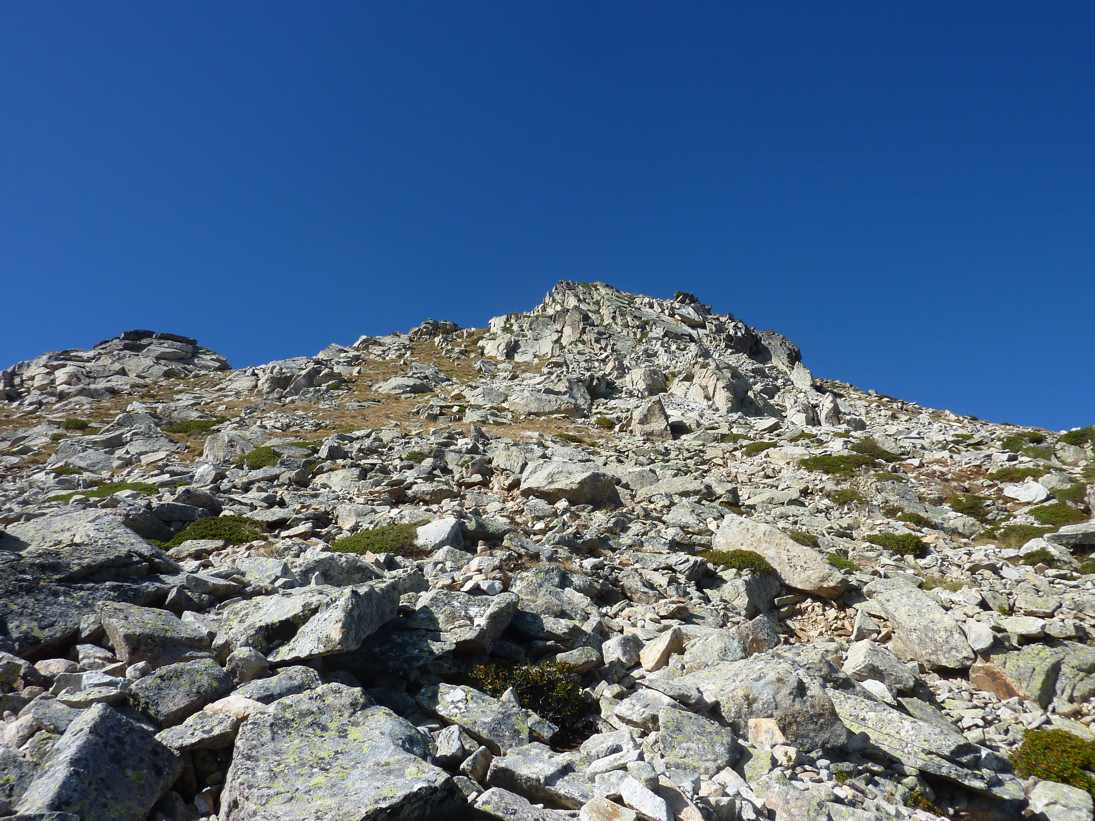 Vue sur la raide montée cairnée vers le Pic de Madamète : c'est quasiment du tout droit !