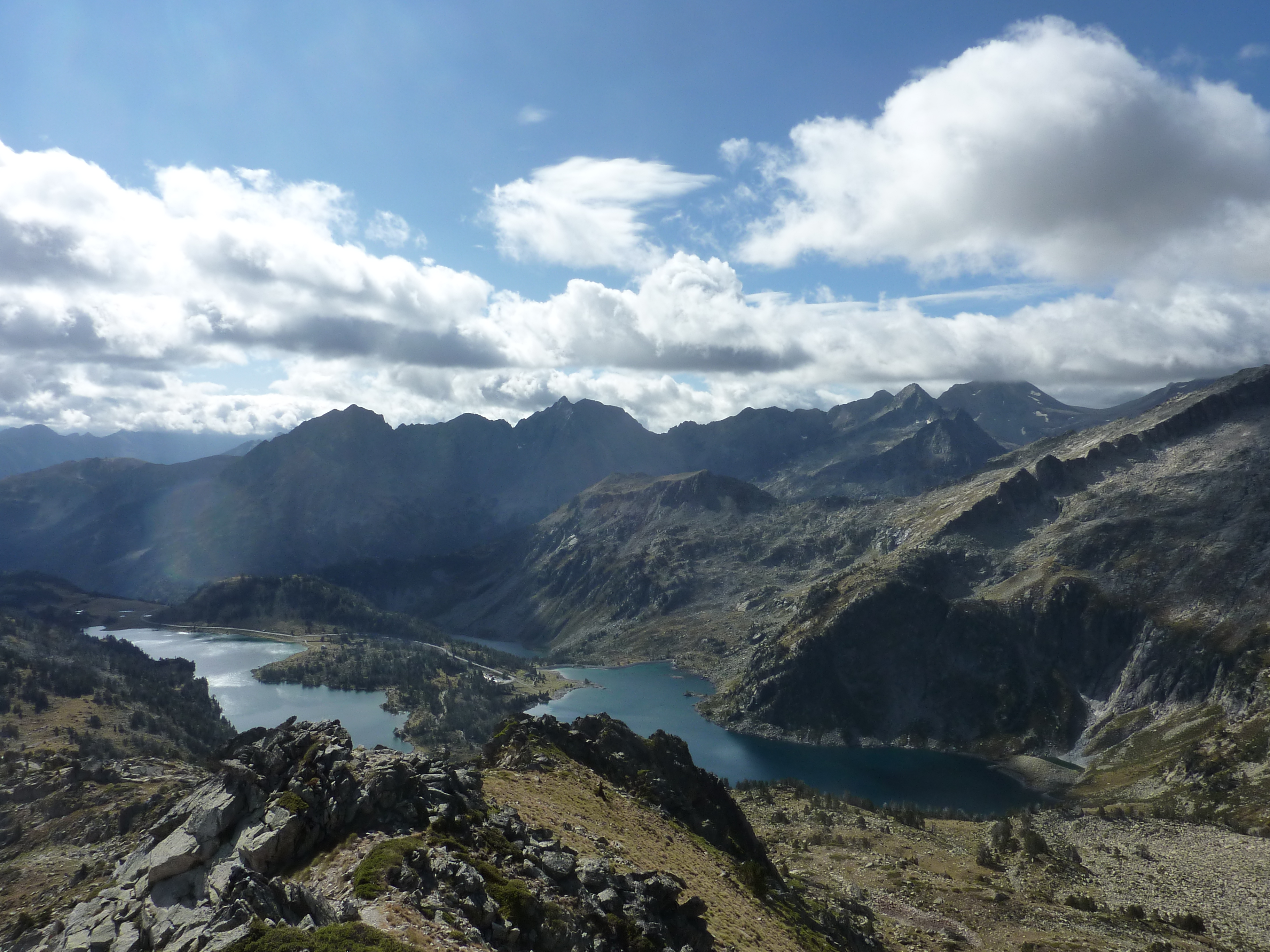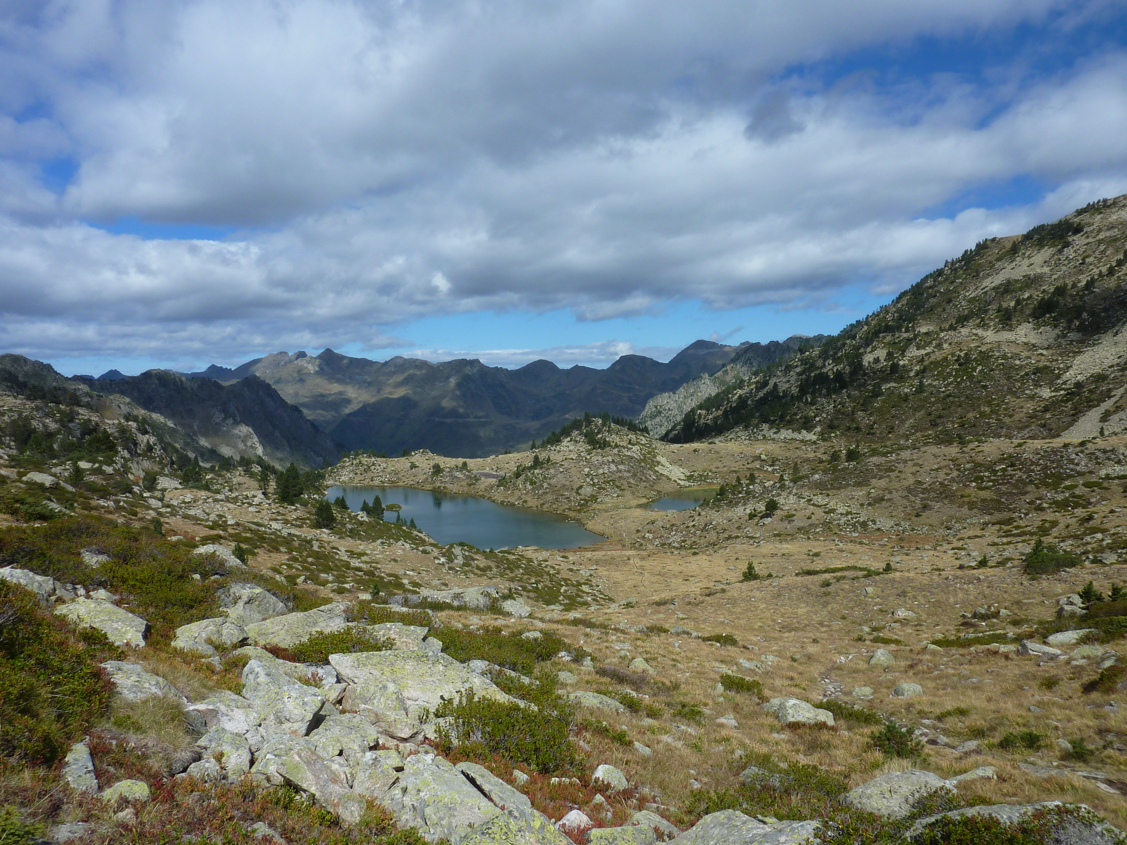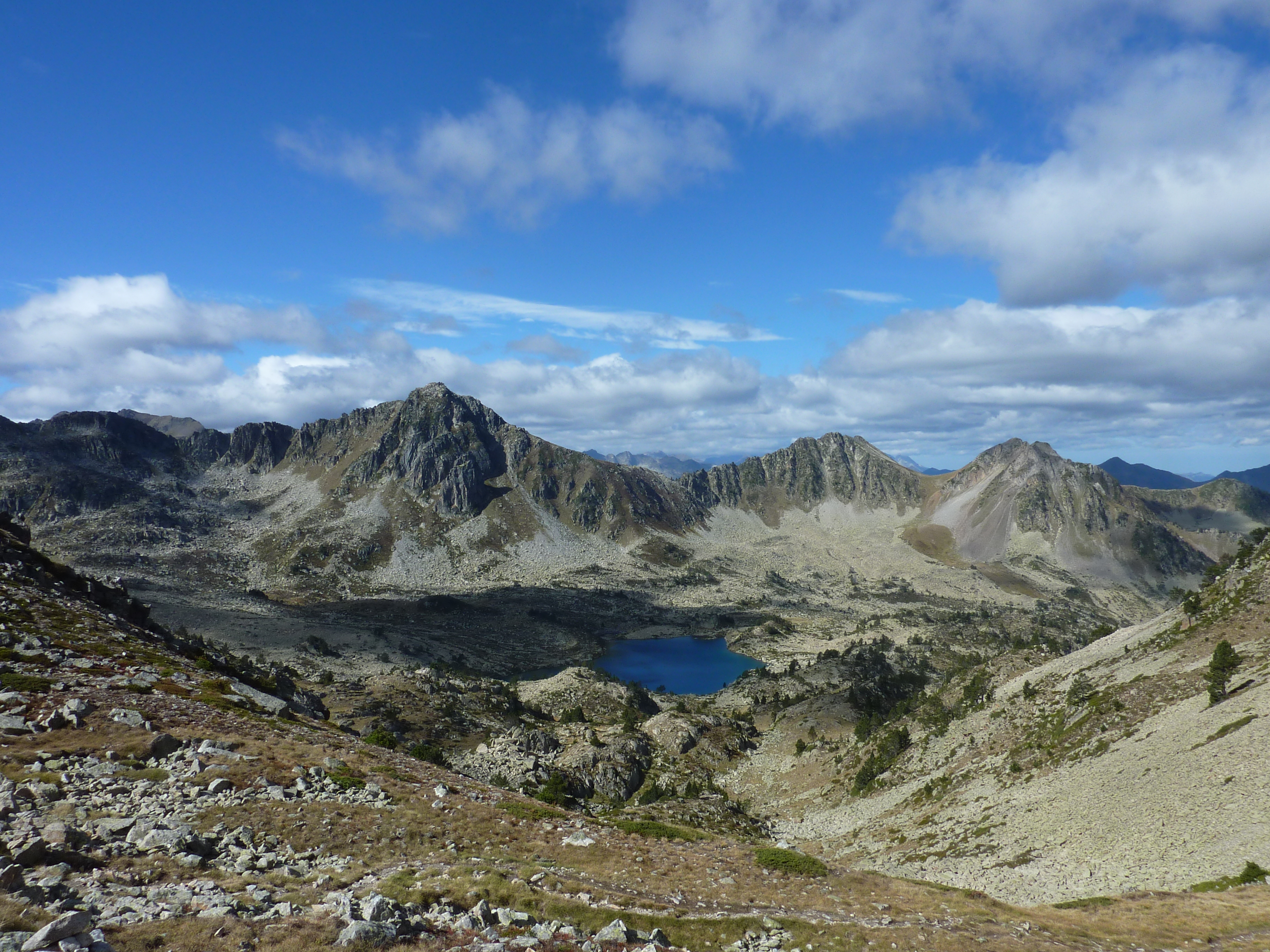 Vue sur le Lac d'Aubert, le Lac d'Aumar ainsi que sur le Pic de Bugatet, le Pic Méchant et le Pic Campbieil