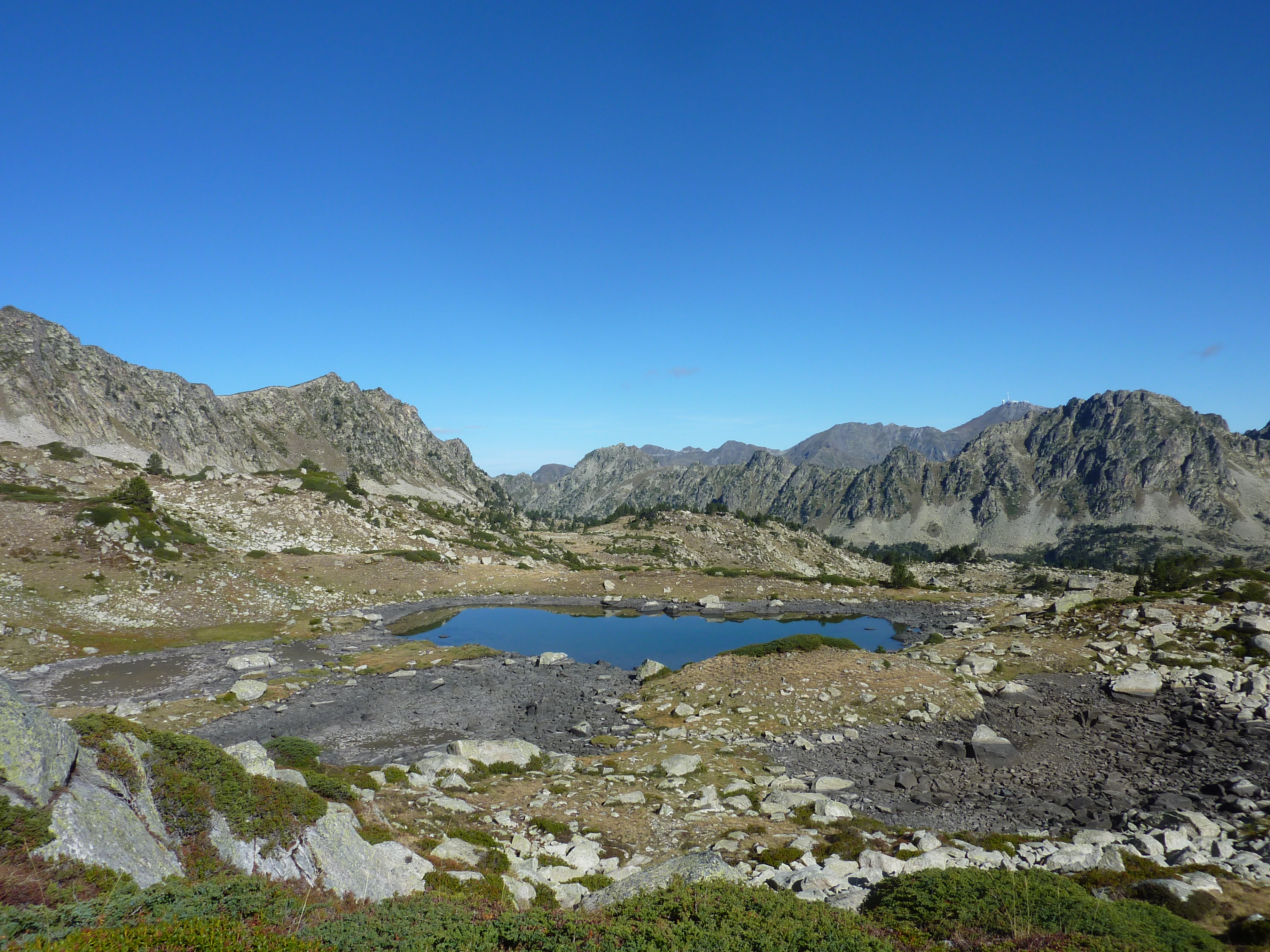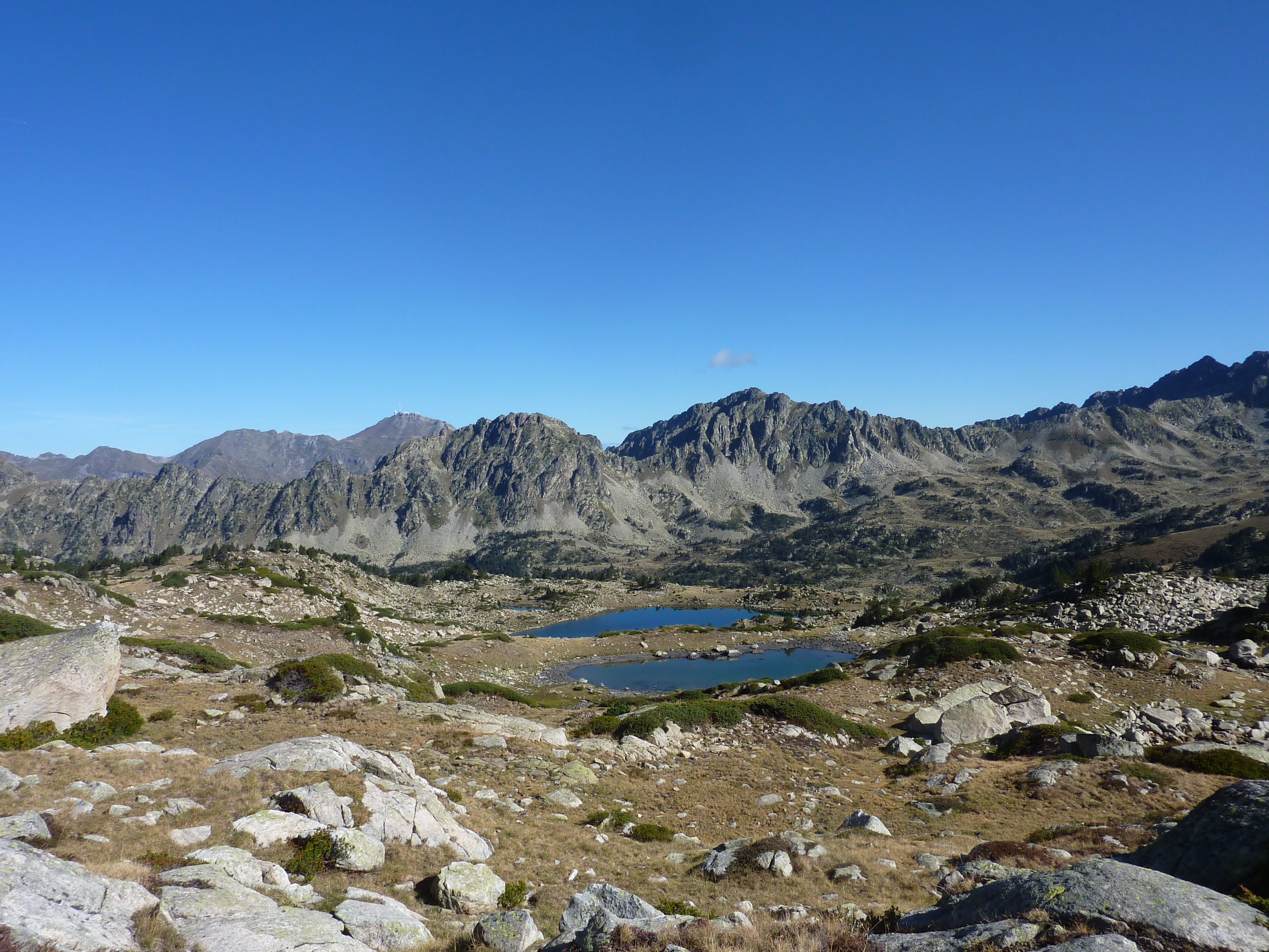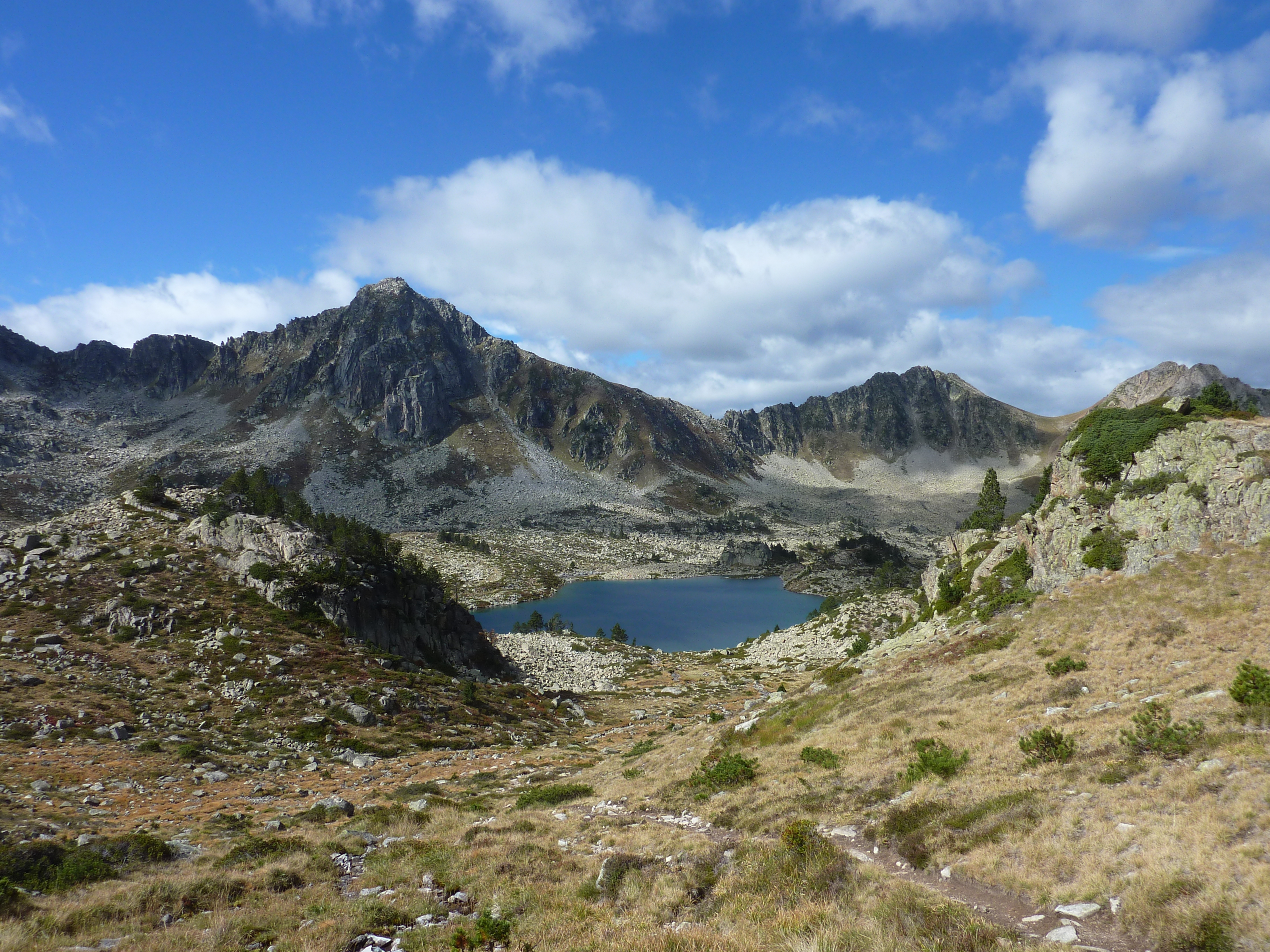 Vue sur le Lac d'Aubert, le Lac d'Aumar ainsi que sur le Pic de Bugatet, le Pic Méchant et le Pic Campbieil