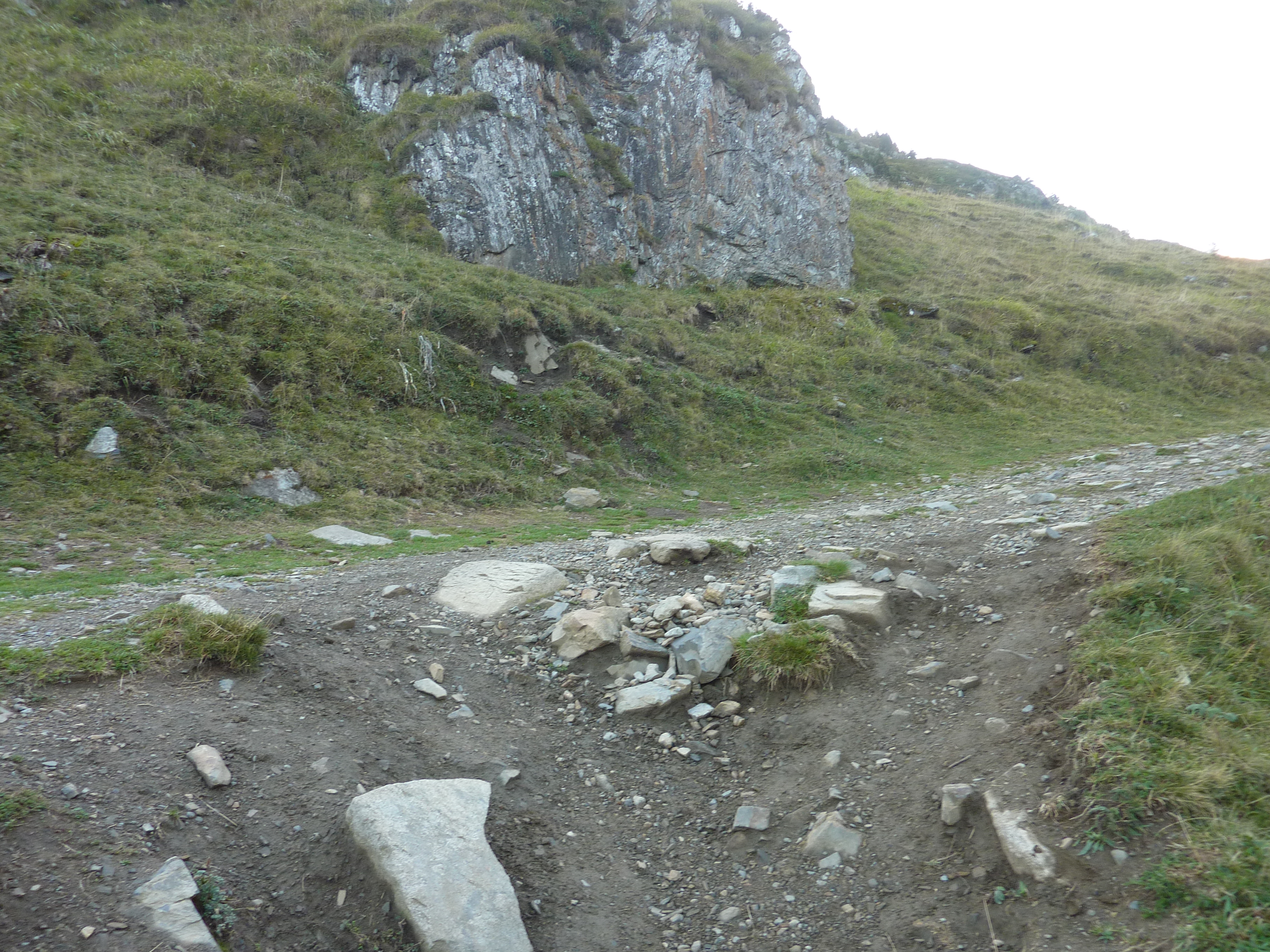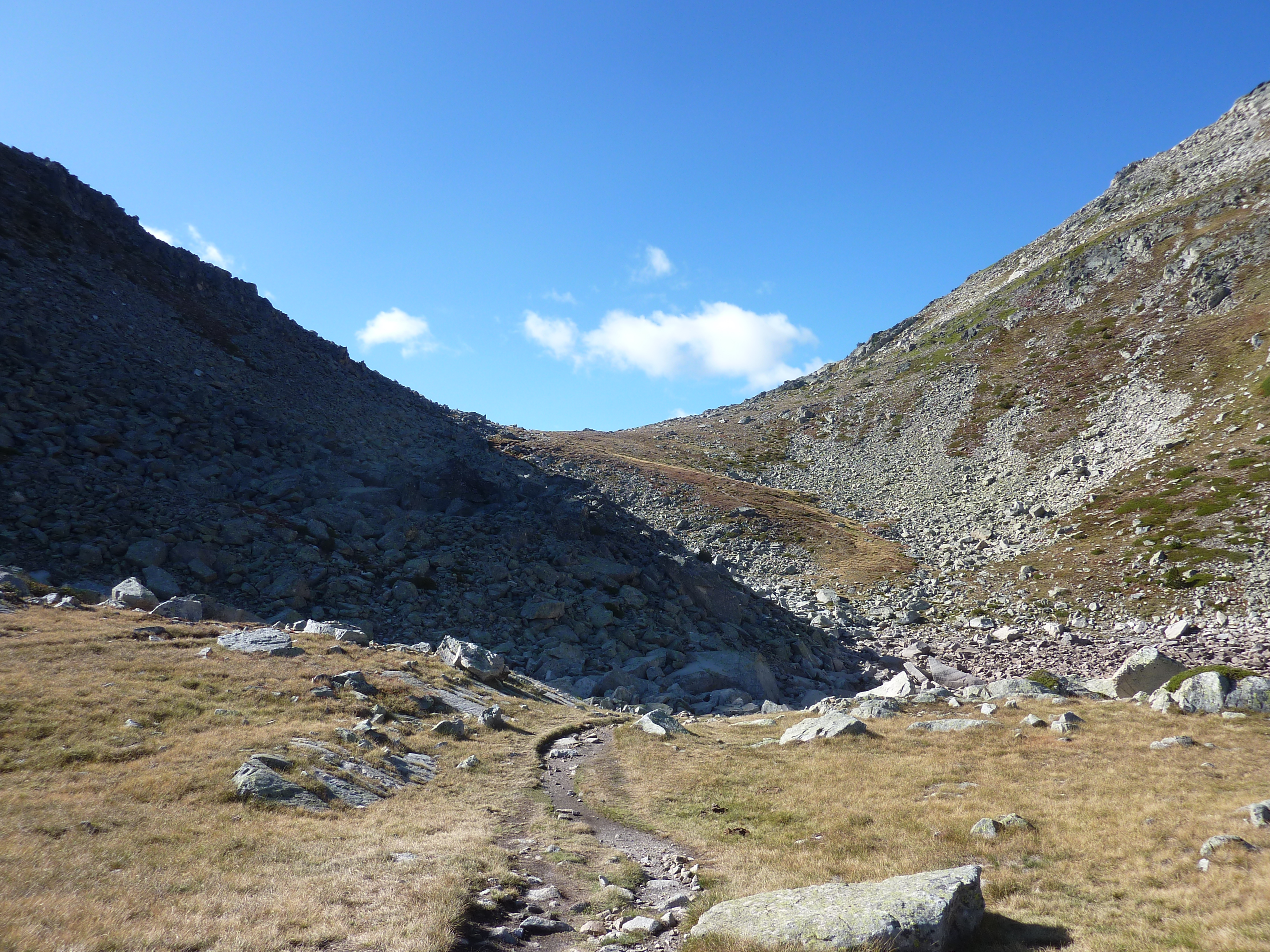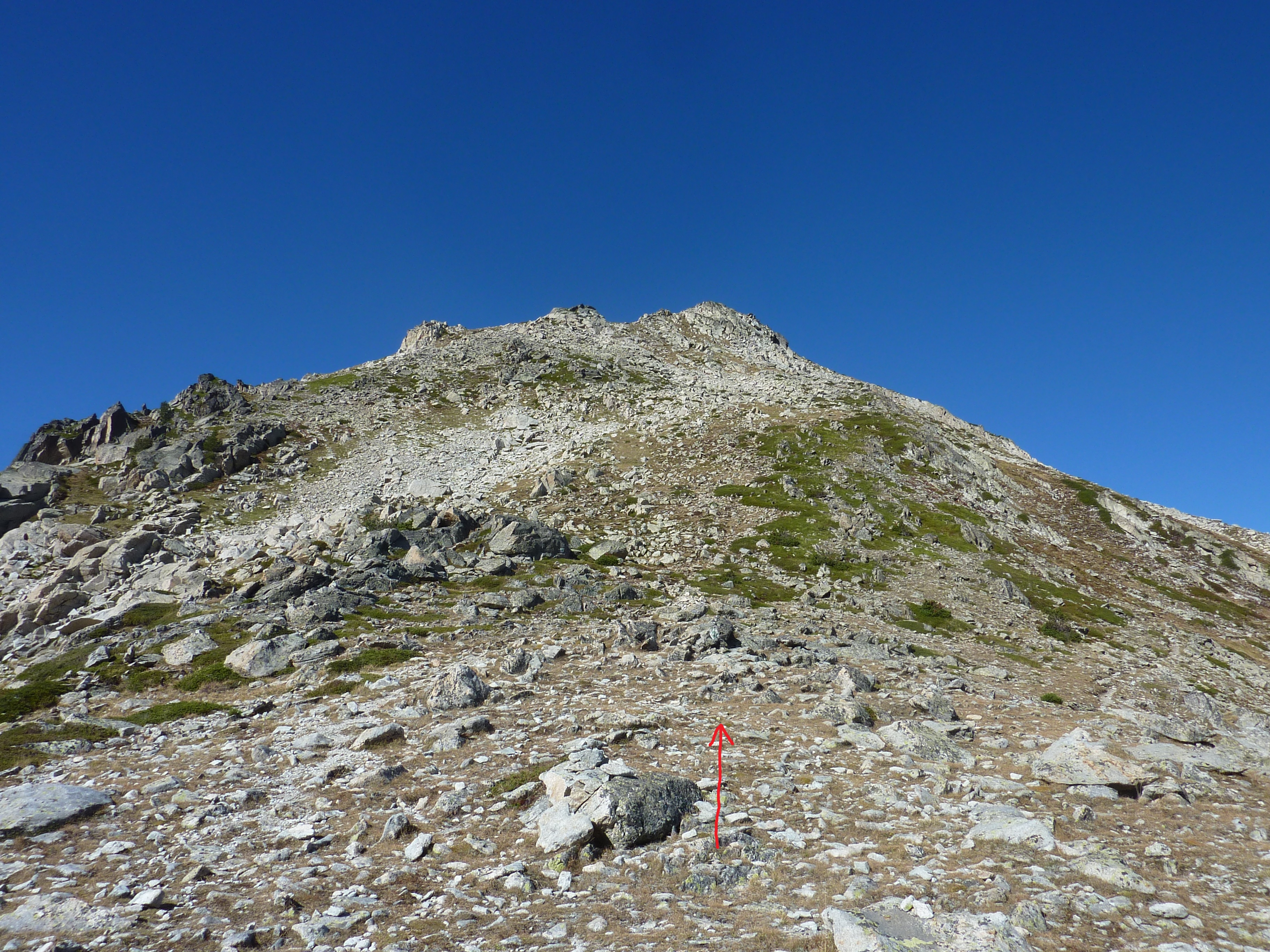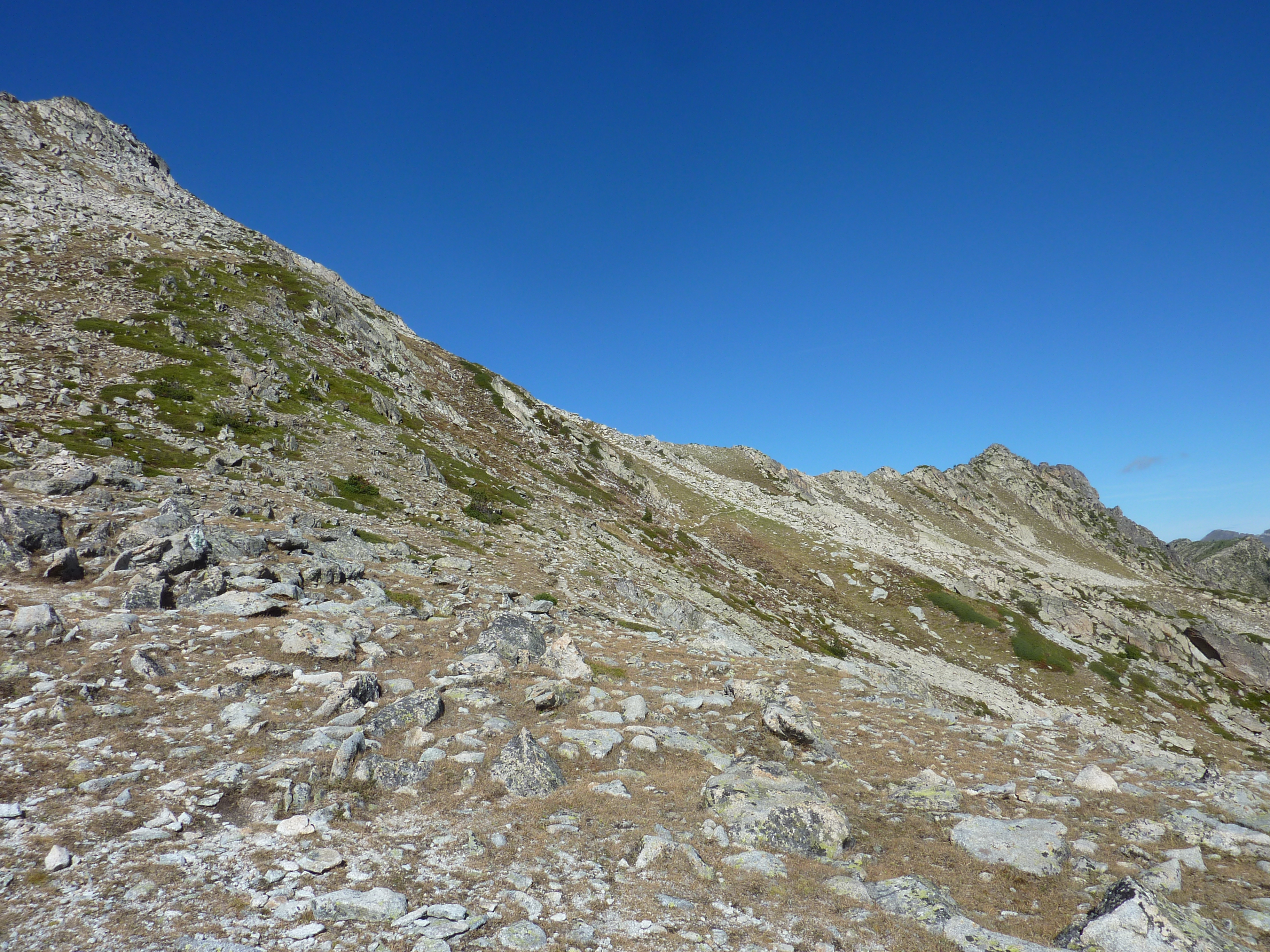 Col de Madamète (2509 m) : suivre le chemin cairné montant raidement sur la droite direction Pic de Madamète, aucun balisage dorénavant
