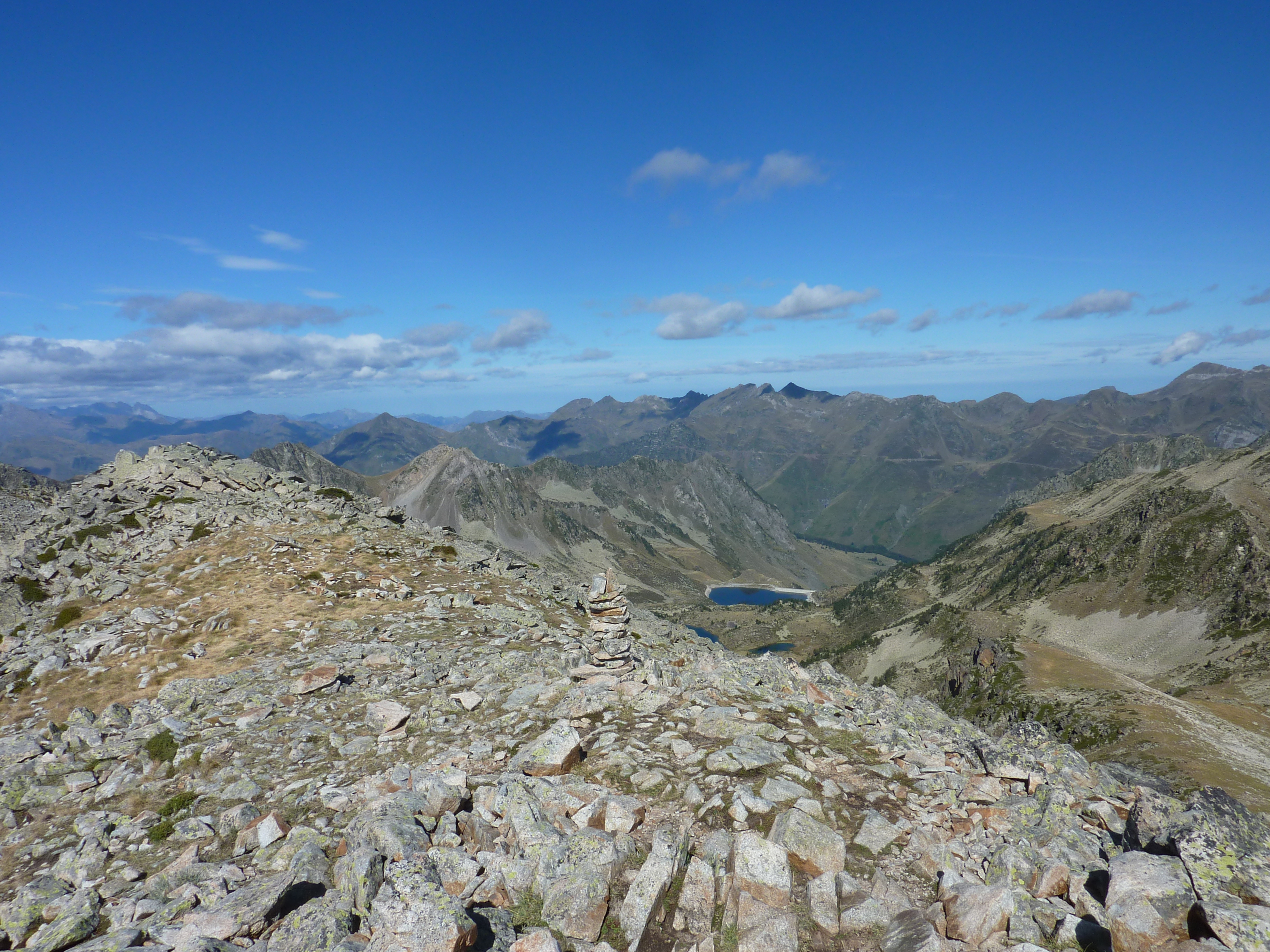 Arrivée au sommet du Pic de Madamète (2657 m) : beau panorama aujourd'hui malgré les nuages présents en fond de chaîne notamment sur les sommets du Luchonnais, de la Vallée d'Aure, de la Réserve de Néouvielle, de la Vallée du Lutour, du Valentin de du Bastan ... les lacs du secteur sont également bien visibles !