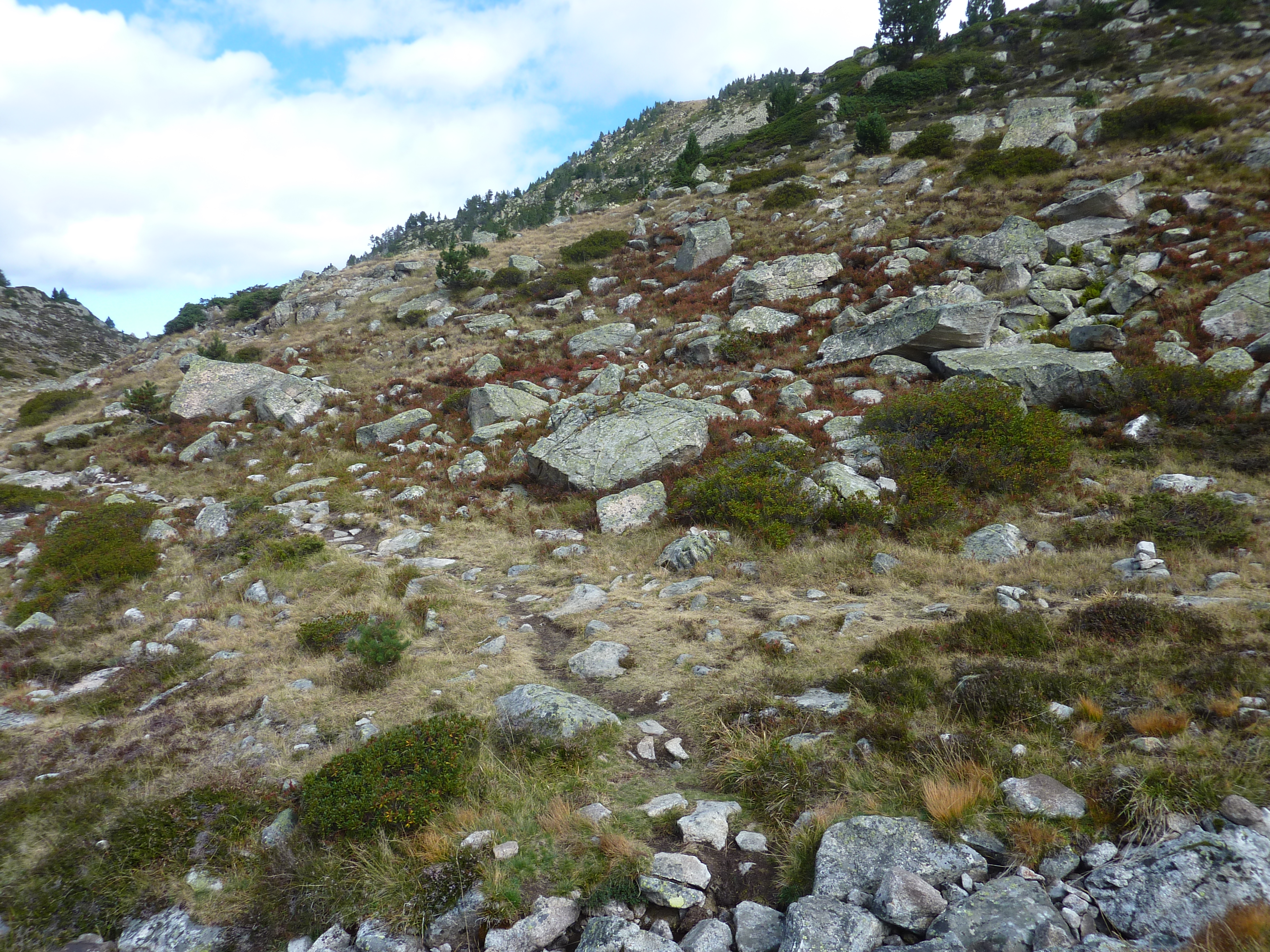 - Montée à travers des blocs rocheux sur chemins mal tracés au niveau des Lacs de Madamète