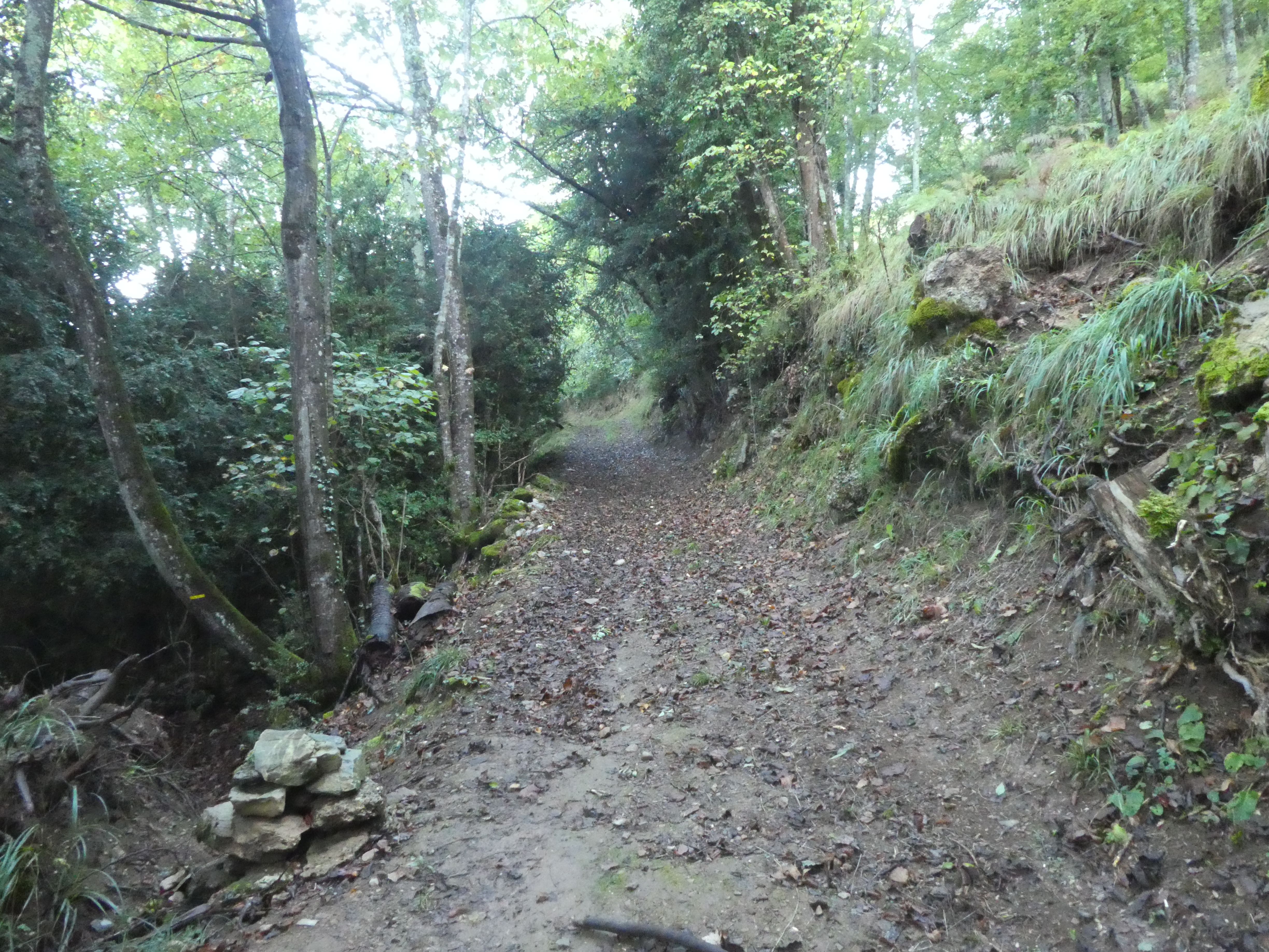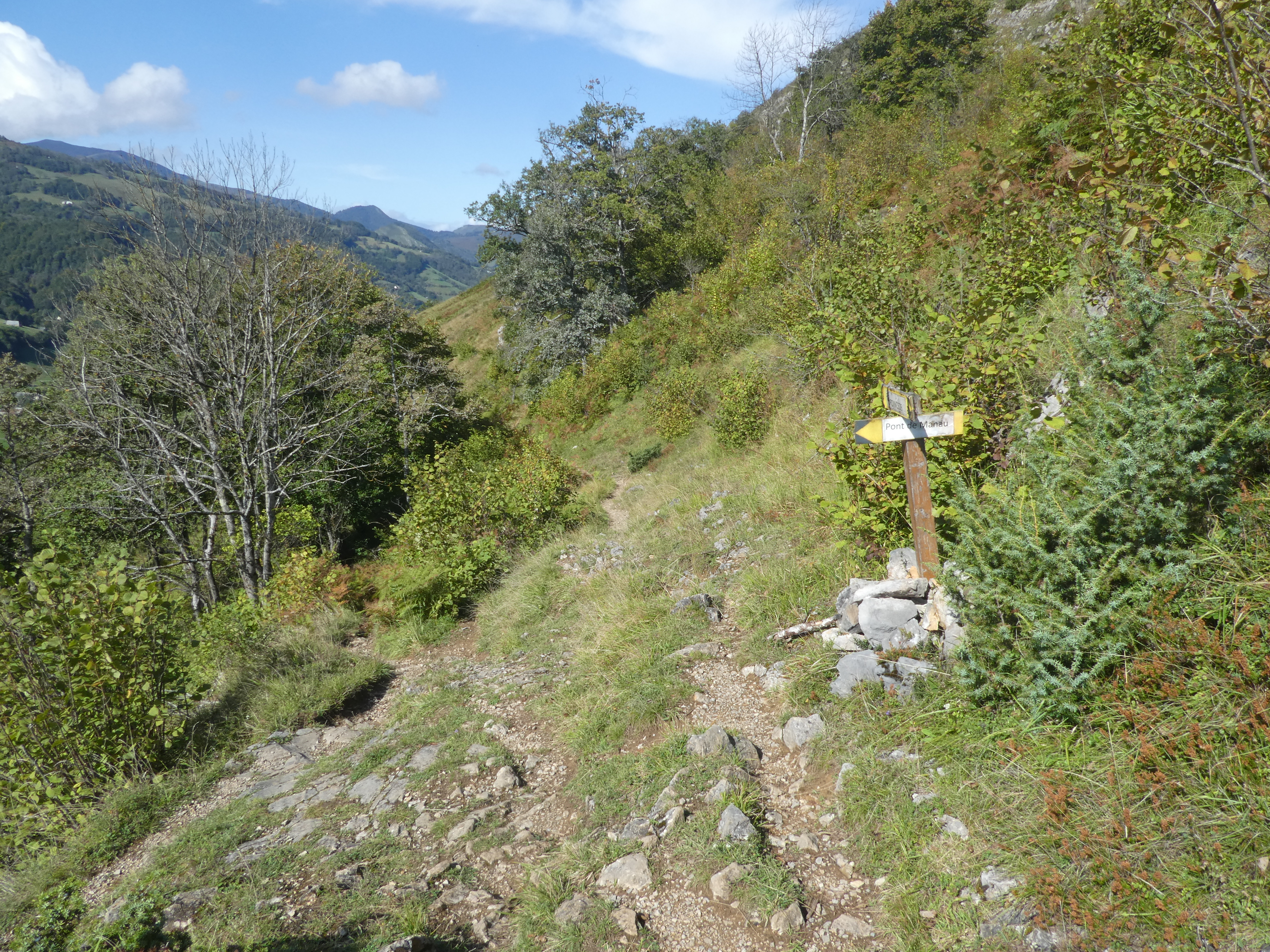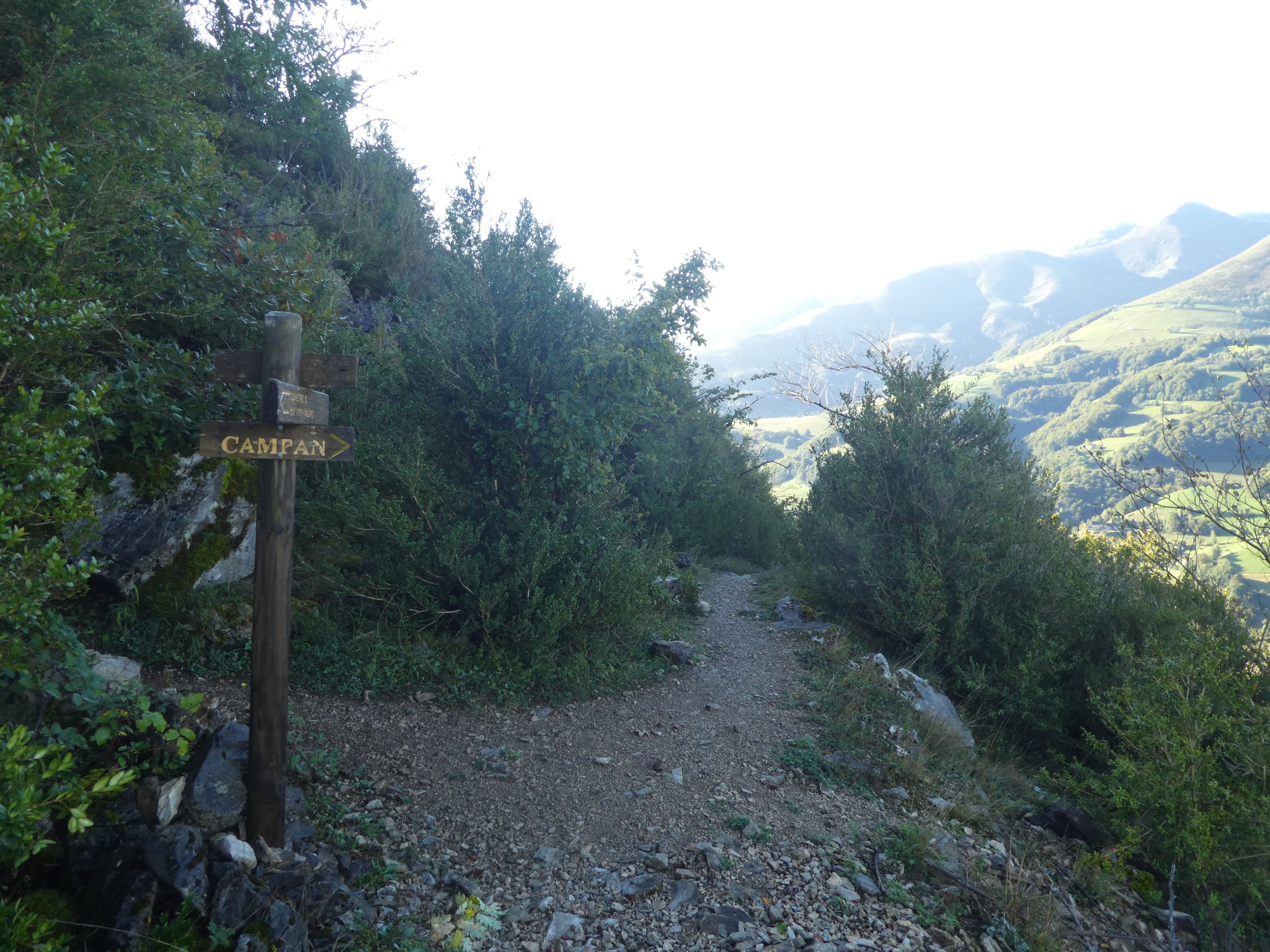 A ce croisement marqué par la présence d'un panneau directionnel (400 mètres après le précédent) (834 m), suivre le chemin partant tout droit sur 25 mètres direction Campan, balisé sporadiquement en jaune (le chemin montant sur la droite mène aussi à la Cabane du Teilhet et fait économiser environ 15 minutes de marche)