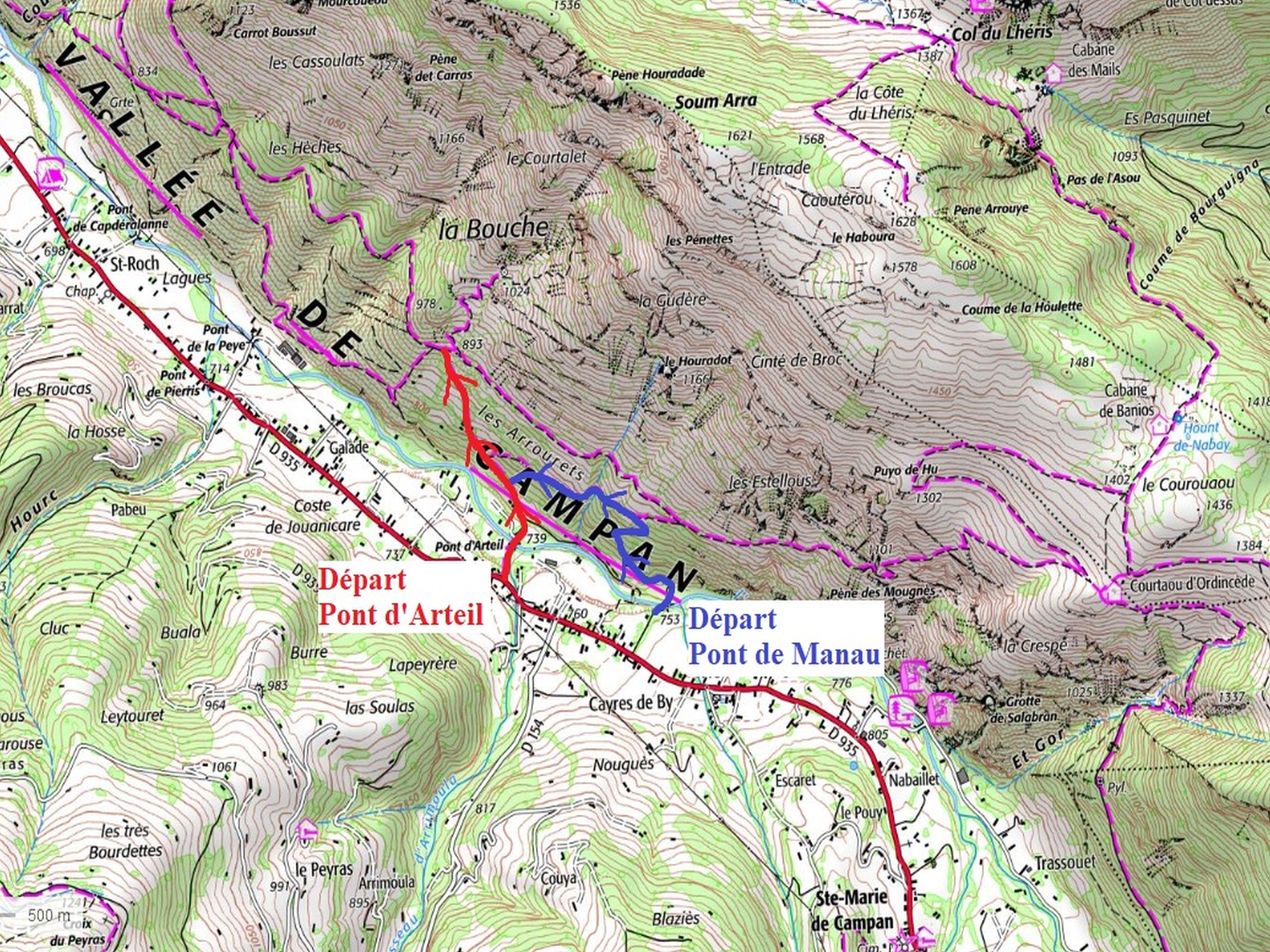 - Départ : Pont d'Arteil (746 m) (42,9958 °N ; 0,2087 °E)