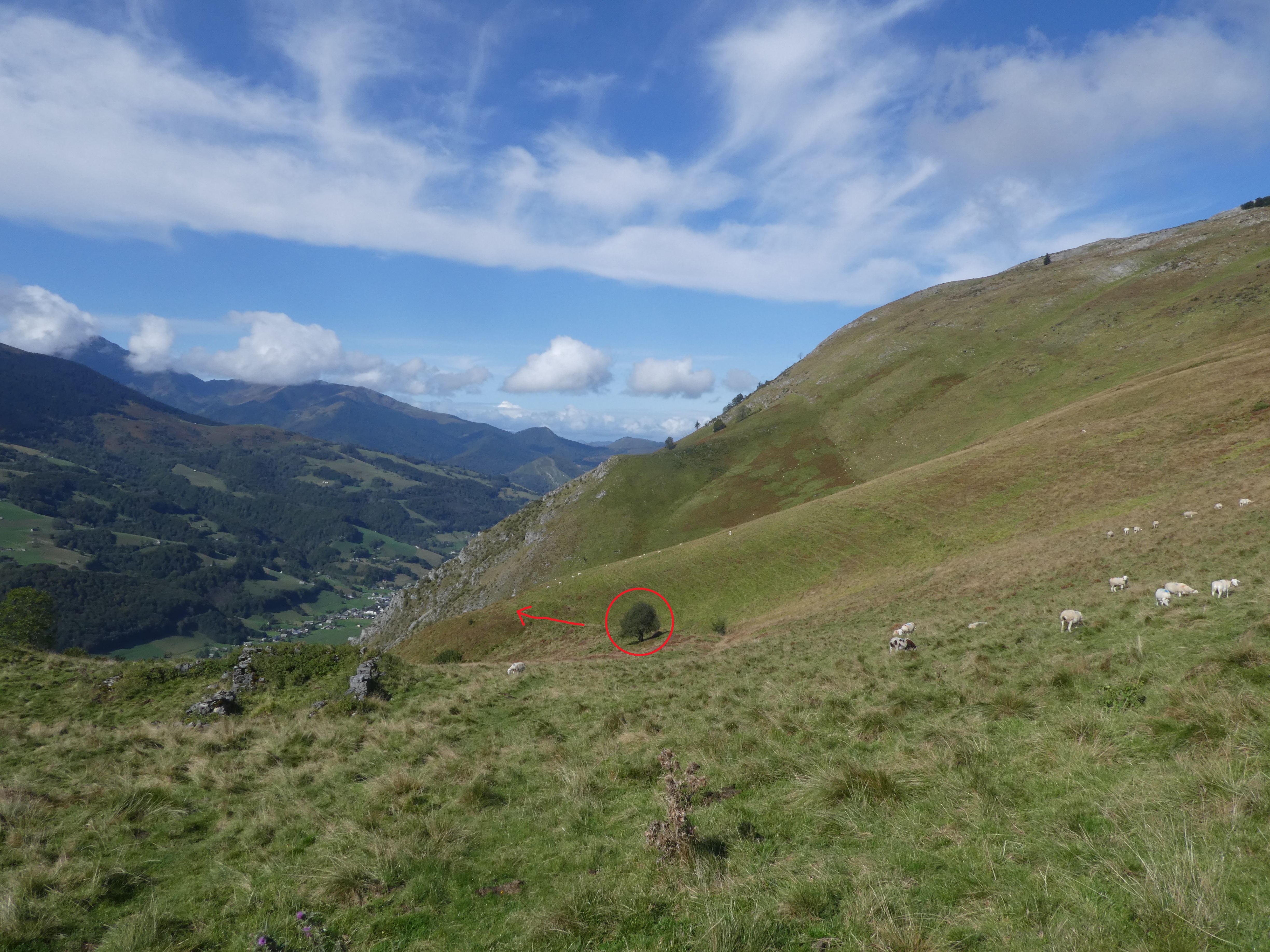 Viser cet arbre pour retrouver le chemin de descente vers le Pont d'Arteil après avoir contourné les Cabanes d'Ordincède par la gauche direction Pont d'Arteil, balisé sporadiquement en jaune