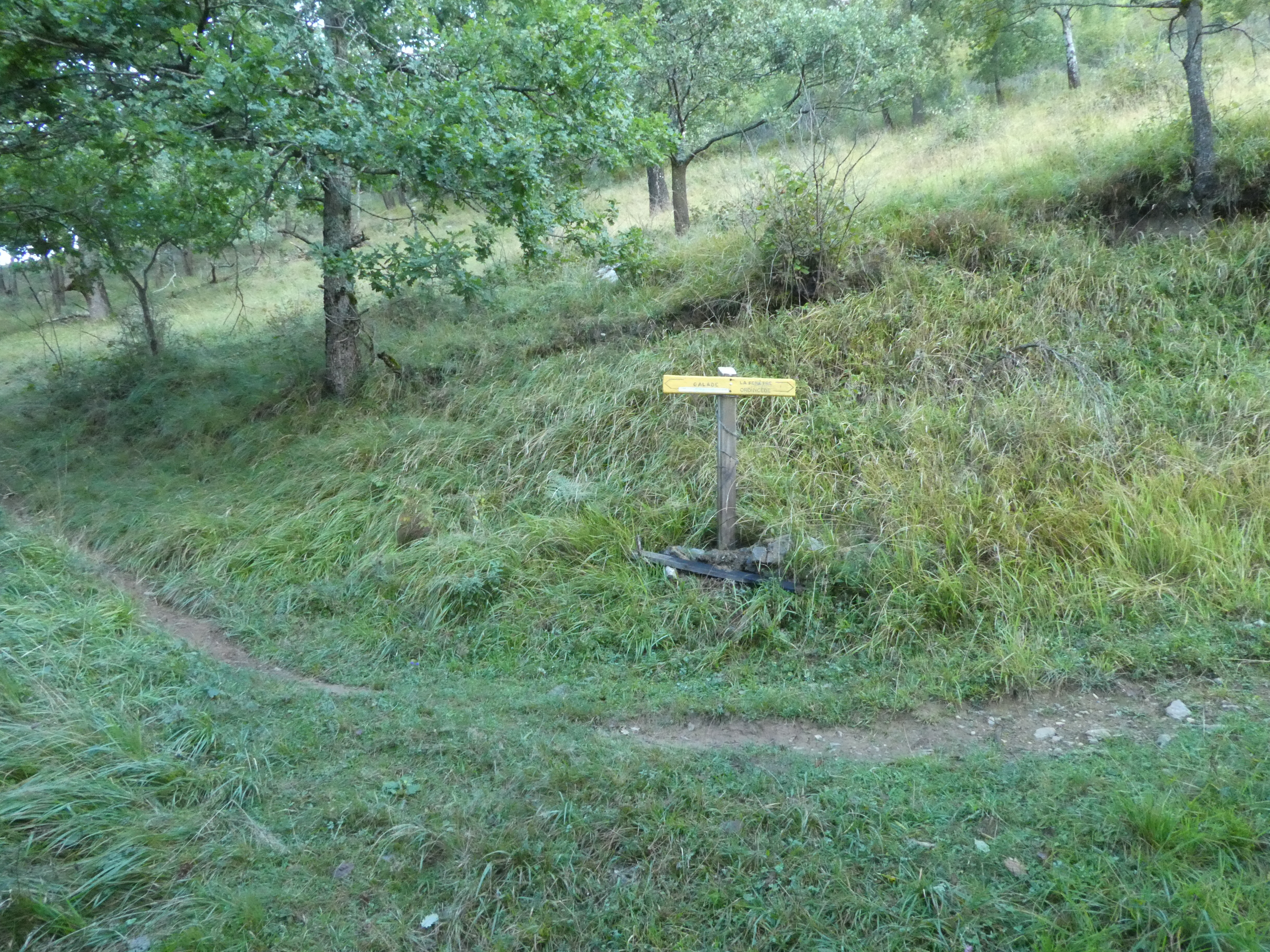A ce croisement marqué par la présence d'un panneau directionnel (400 mètres après le précédent), suivre le chemin montant sur la gauche direction Teilhet, balisé sporadiquement en jaune (ceux qui auraient suivi la direction "Teilhet" précédemment se retrouveront ici)