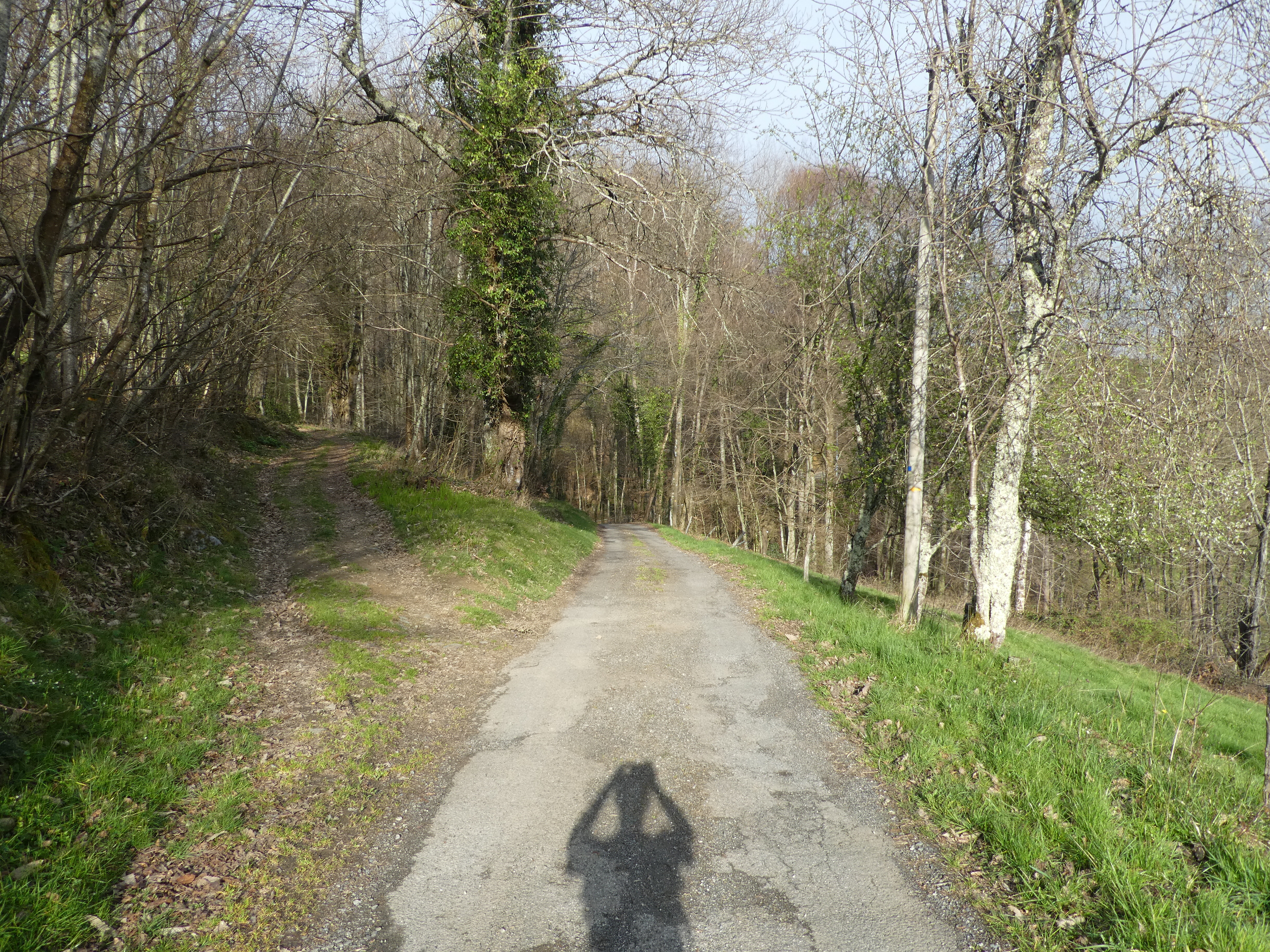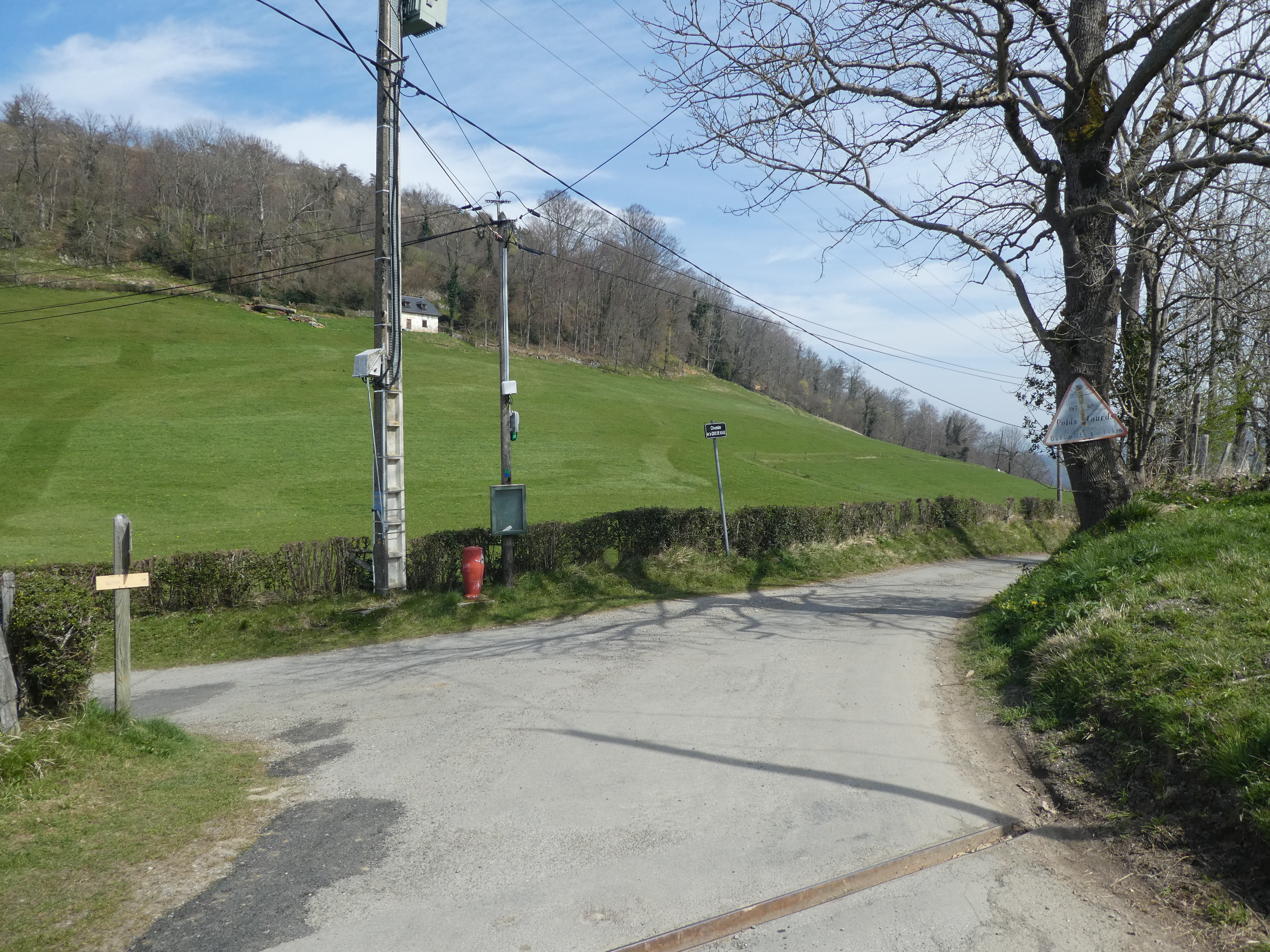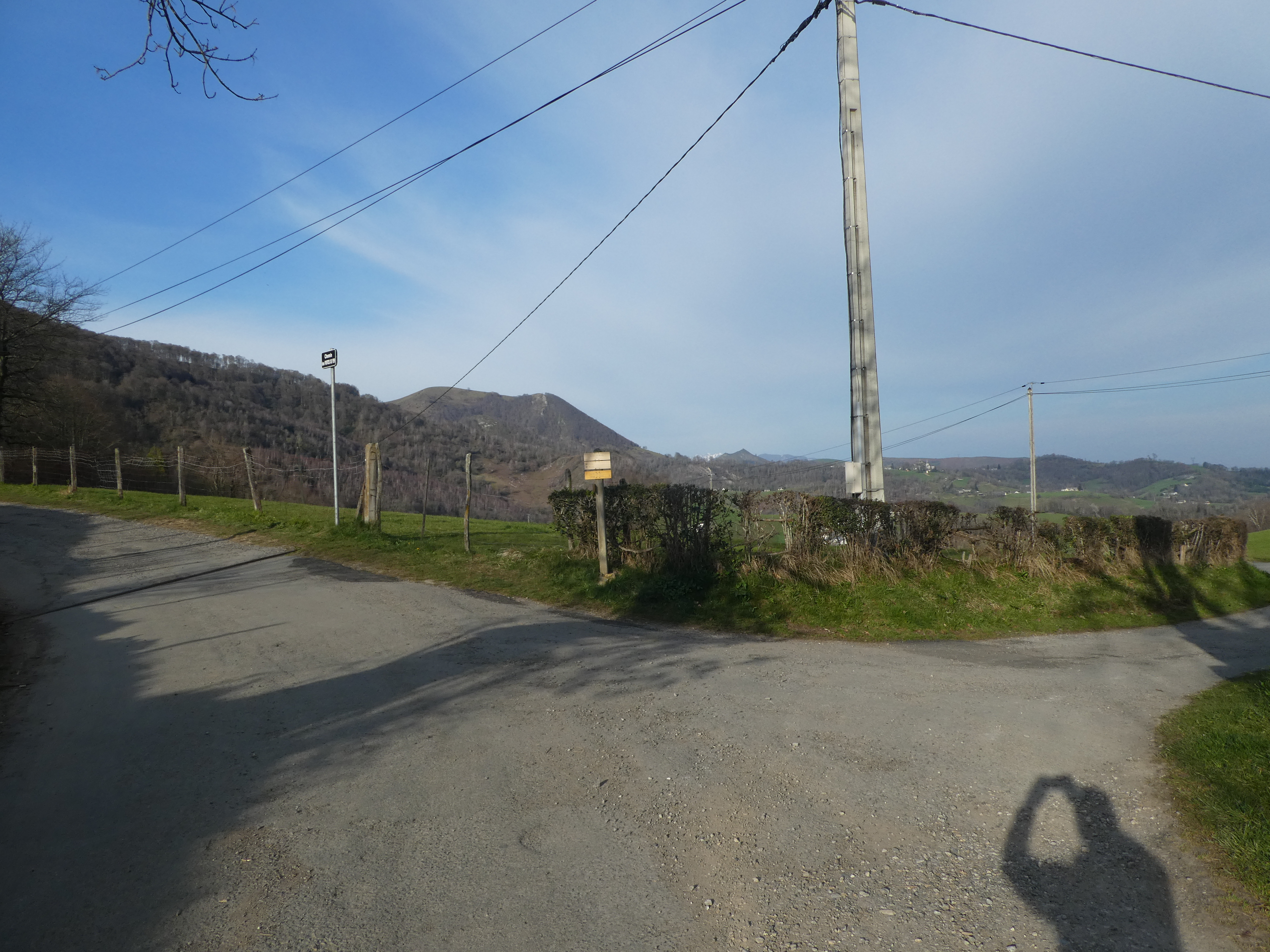 A ce croisement marqué par la présence d'un panneau directionnel (1600 mètres après le lieu-dit "Rond Point d'Esquiou"), suivre le chemin montant tout droit direction le Monné, balisé en jaune dorénavant