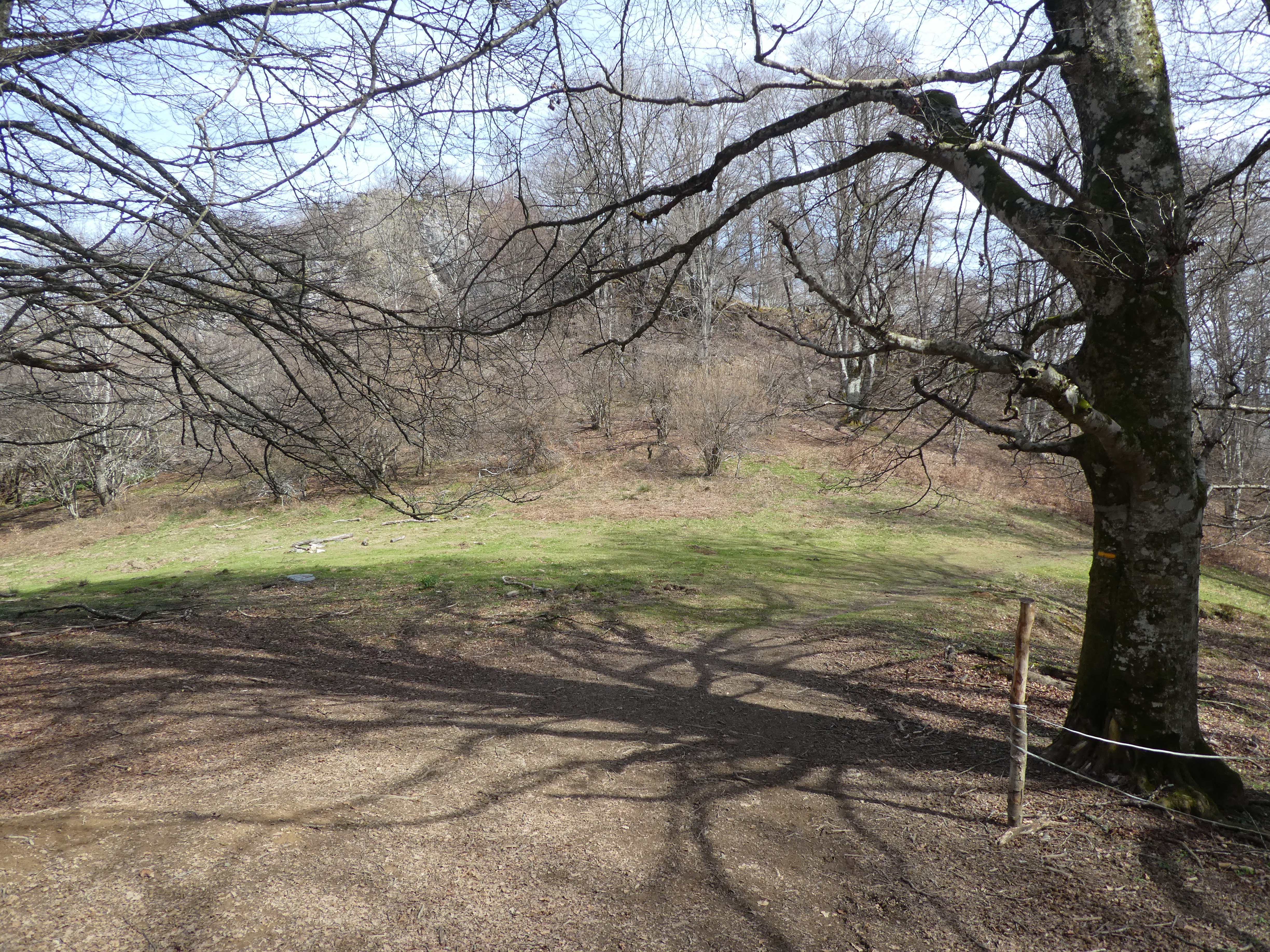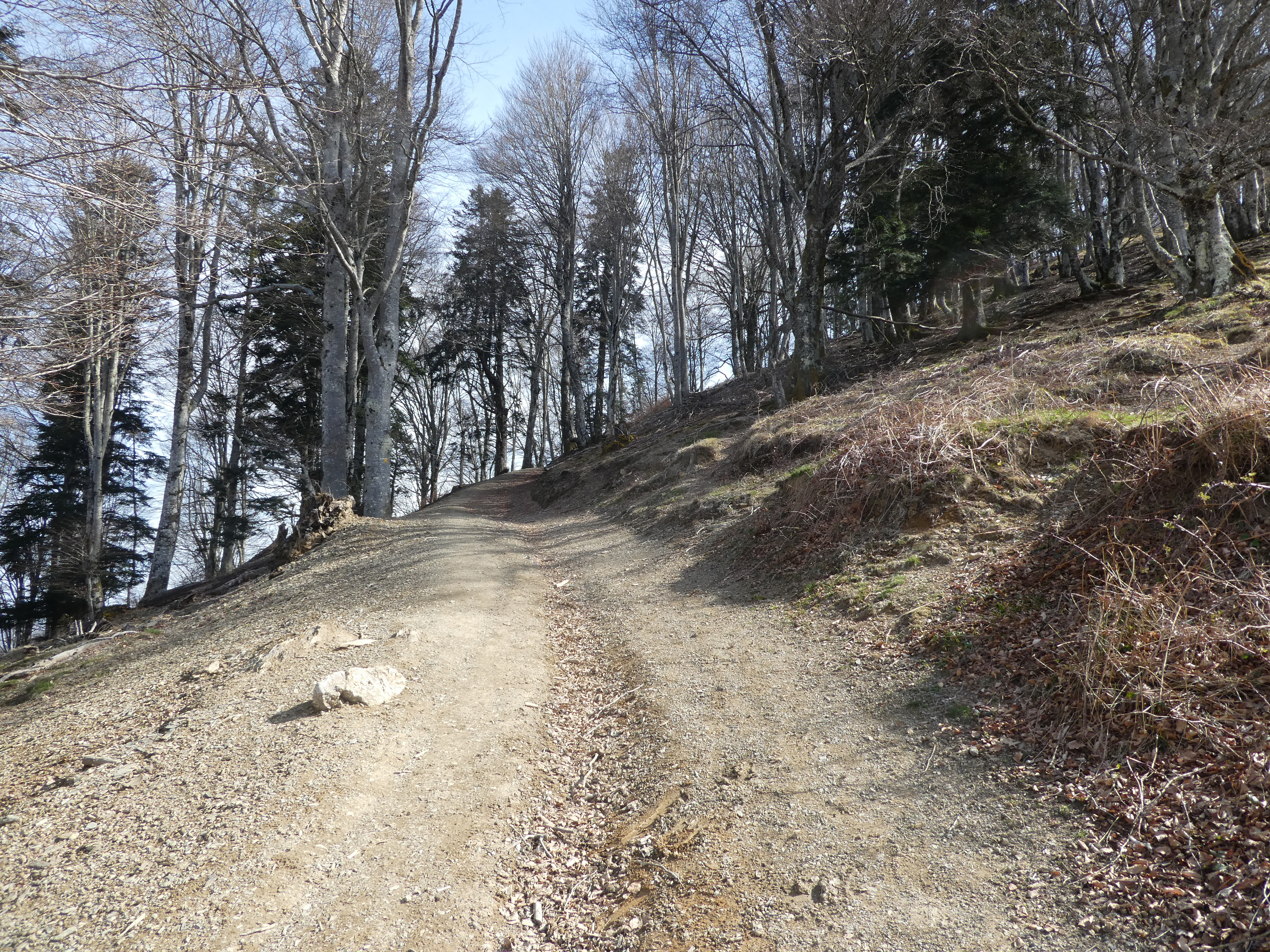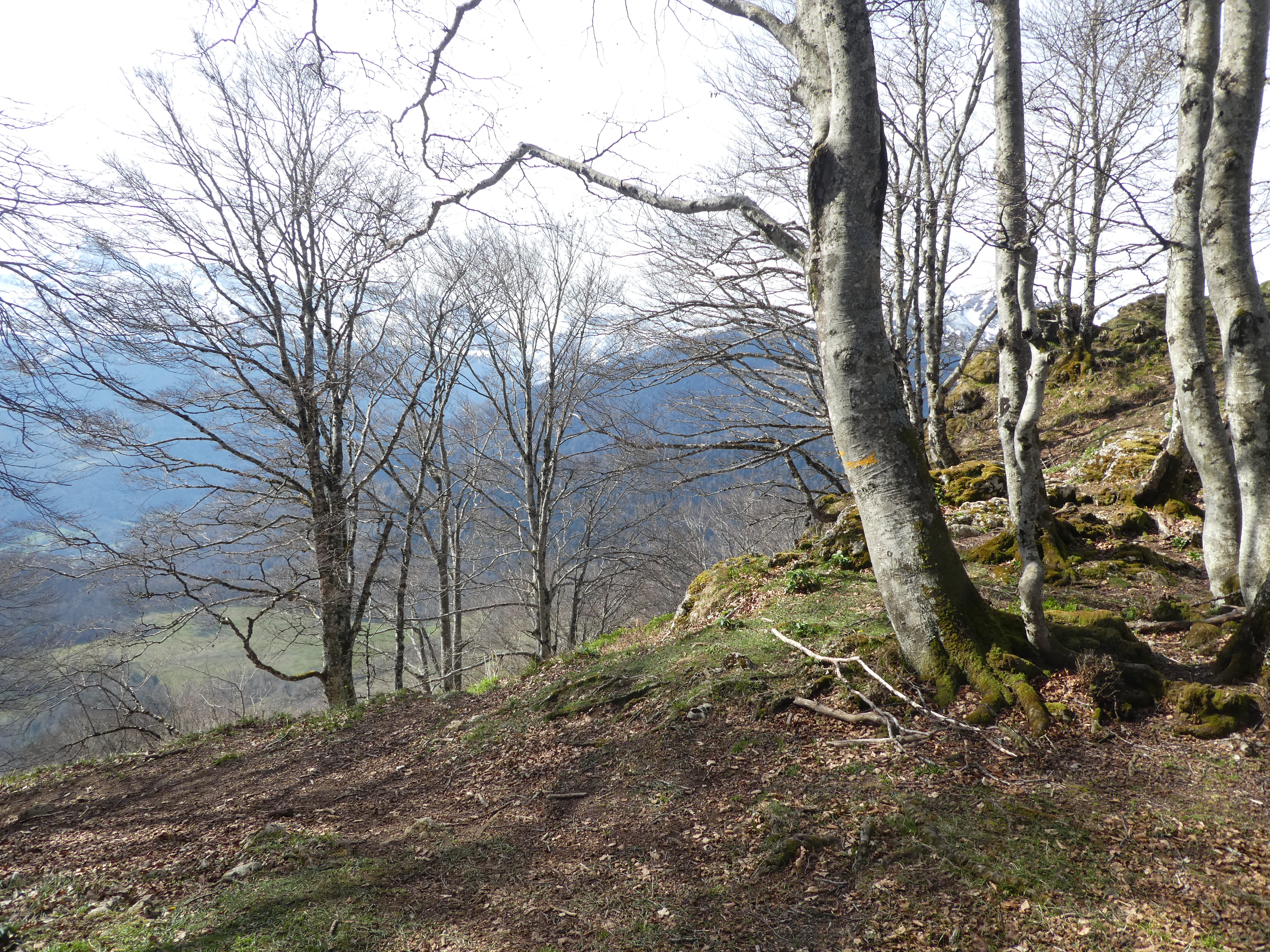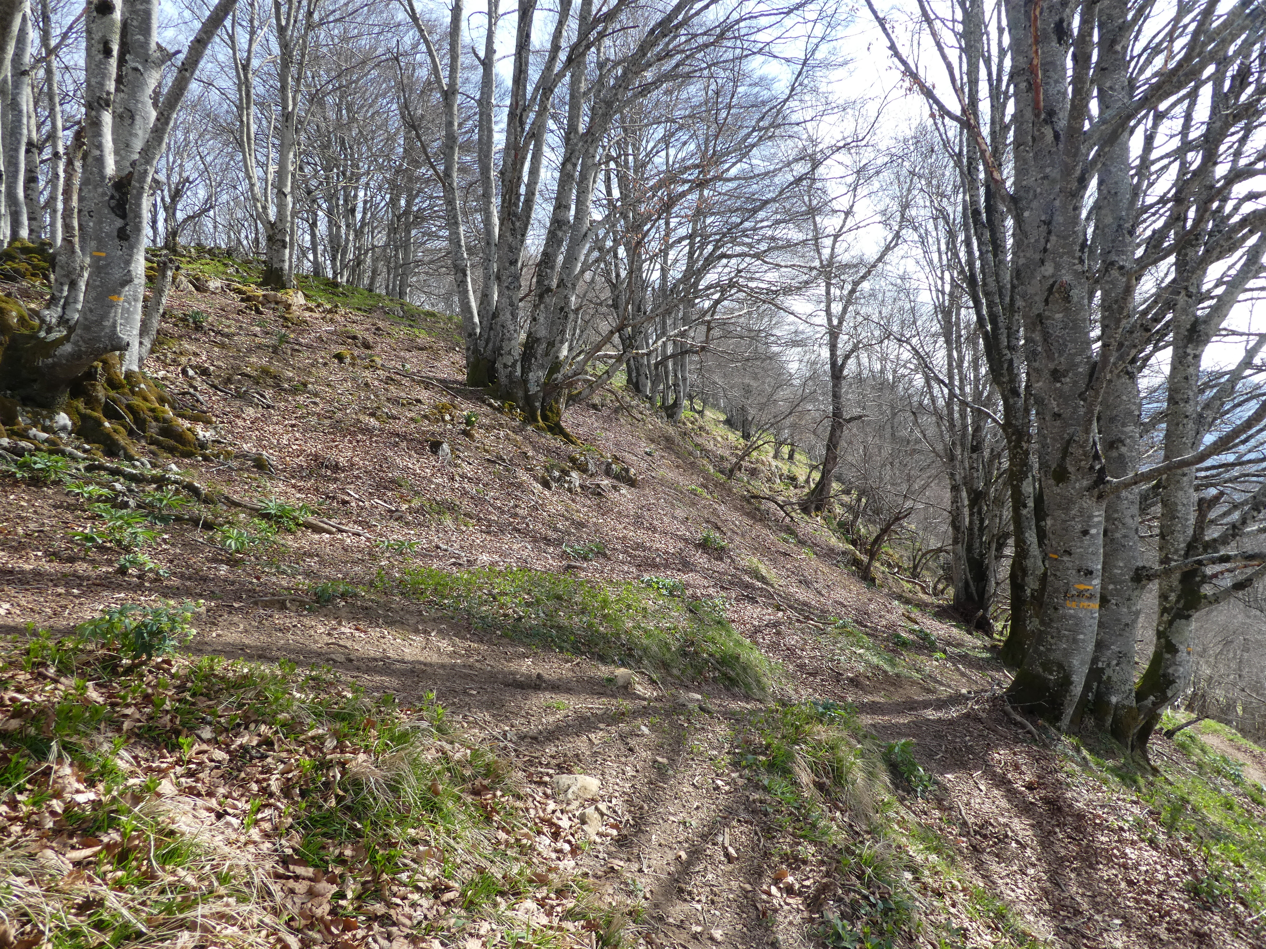 Rond Point d'Esquiou (1034 m) : suivre le large chemin partant tout droit puis celui partant sur la droite 50 mètres plus loin direction Pic de Labassère, balisé en rouge et blanc dorénavant (pour ceux qui ne voudraient pas faire l'aller-retour d'environ 1 heure au Pic de Labassère et aller directement au sommet du Monné, suivre le chemin partant sur la gauche balisé en rouge et blanc)