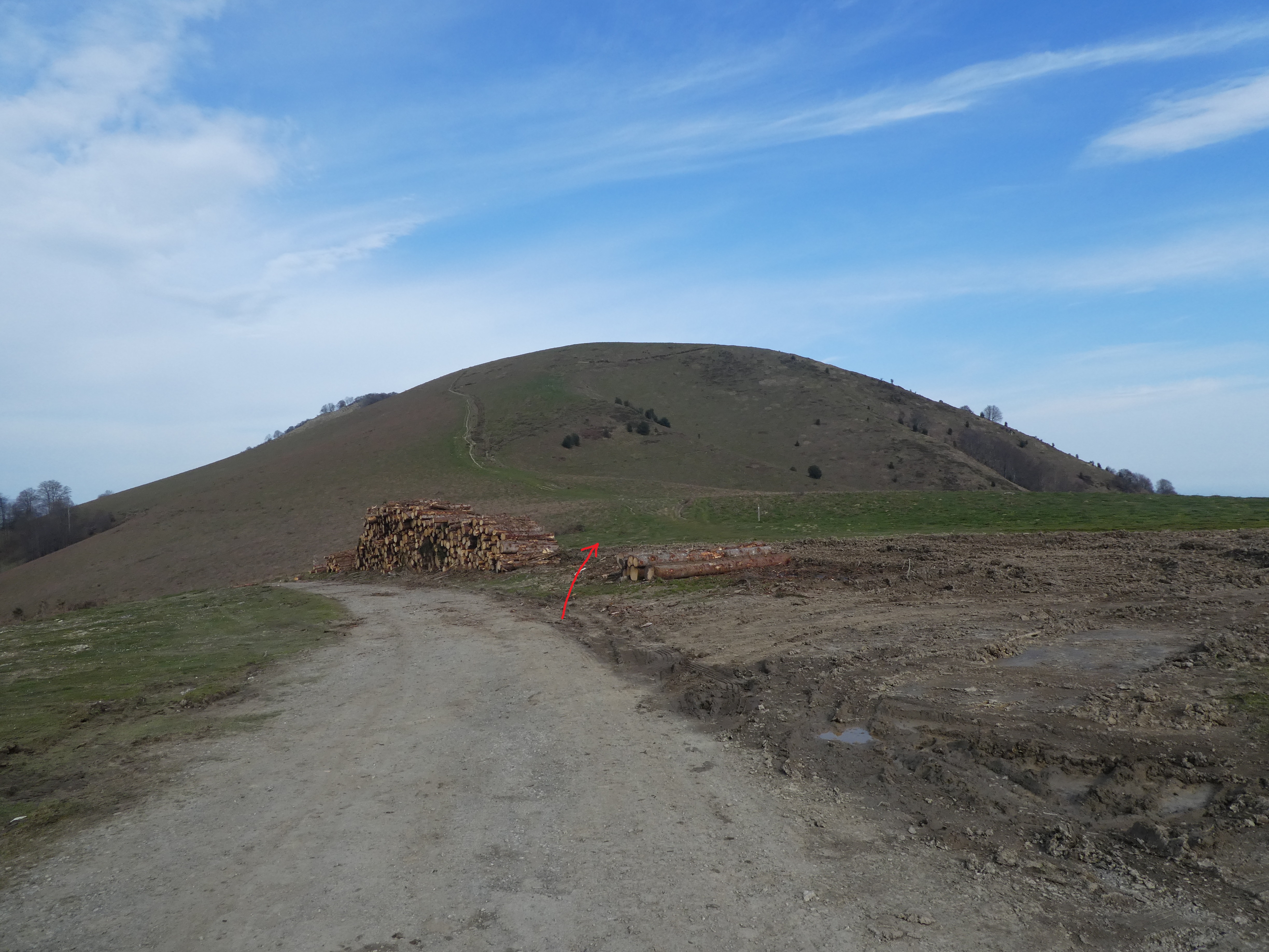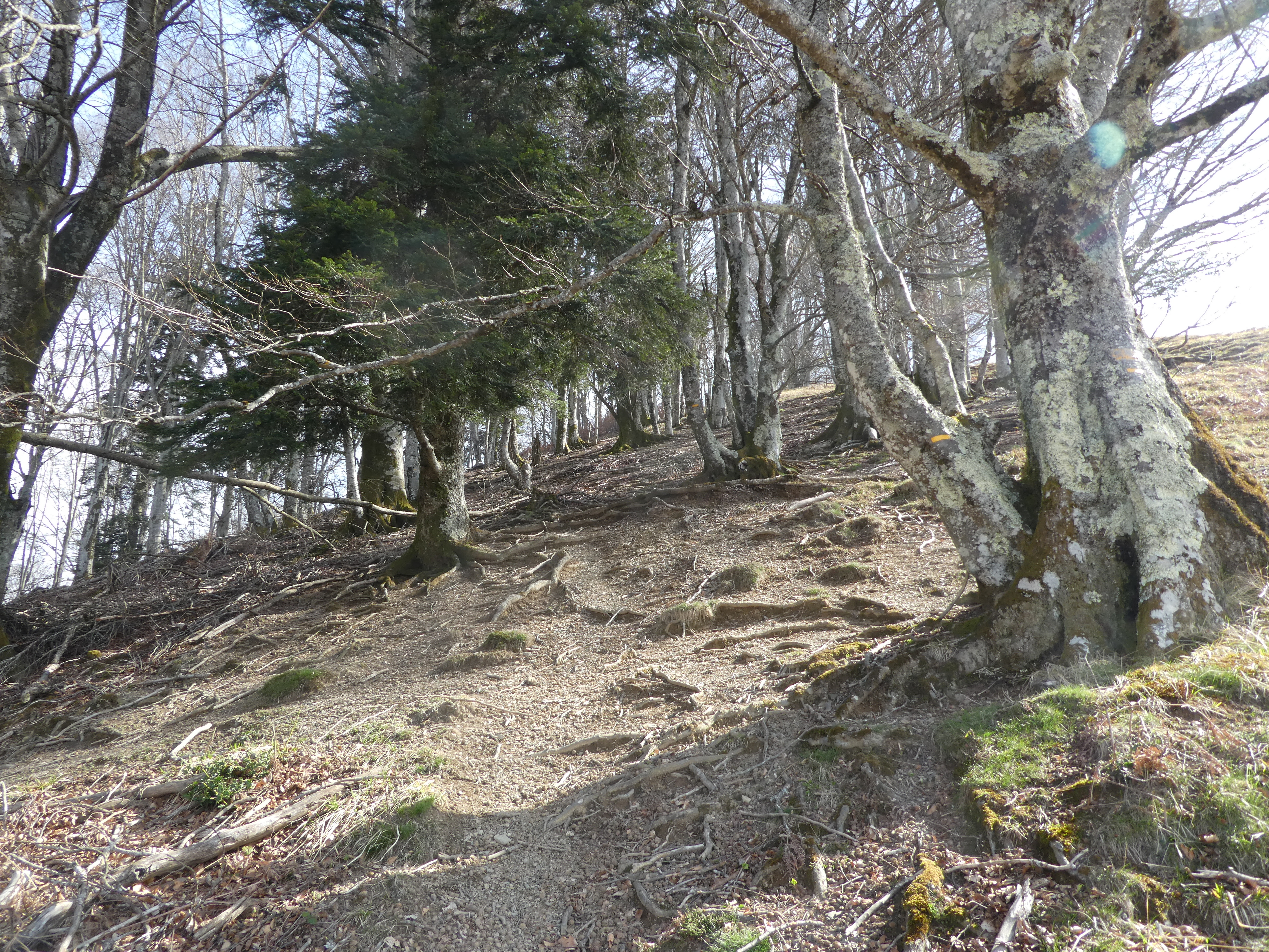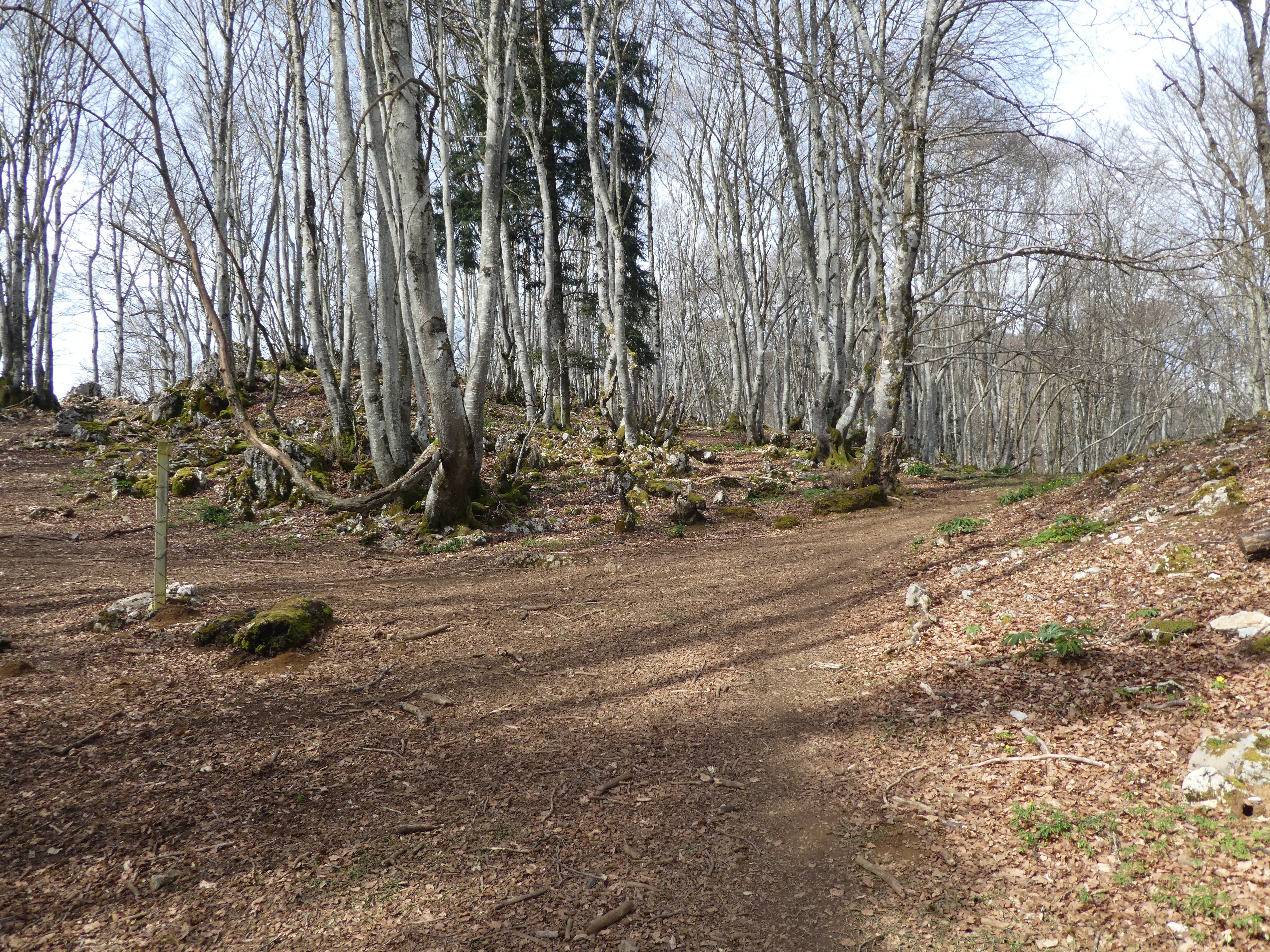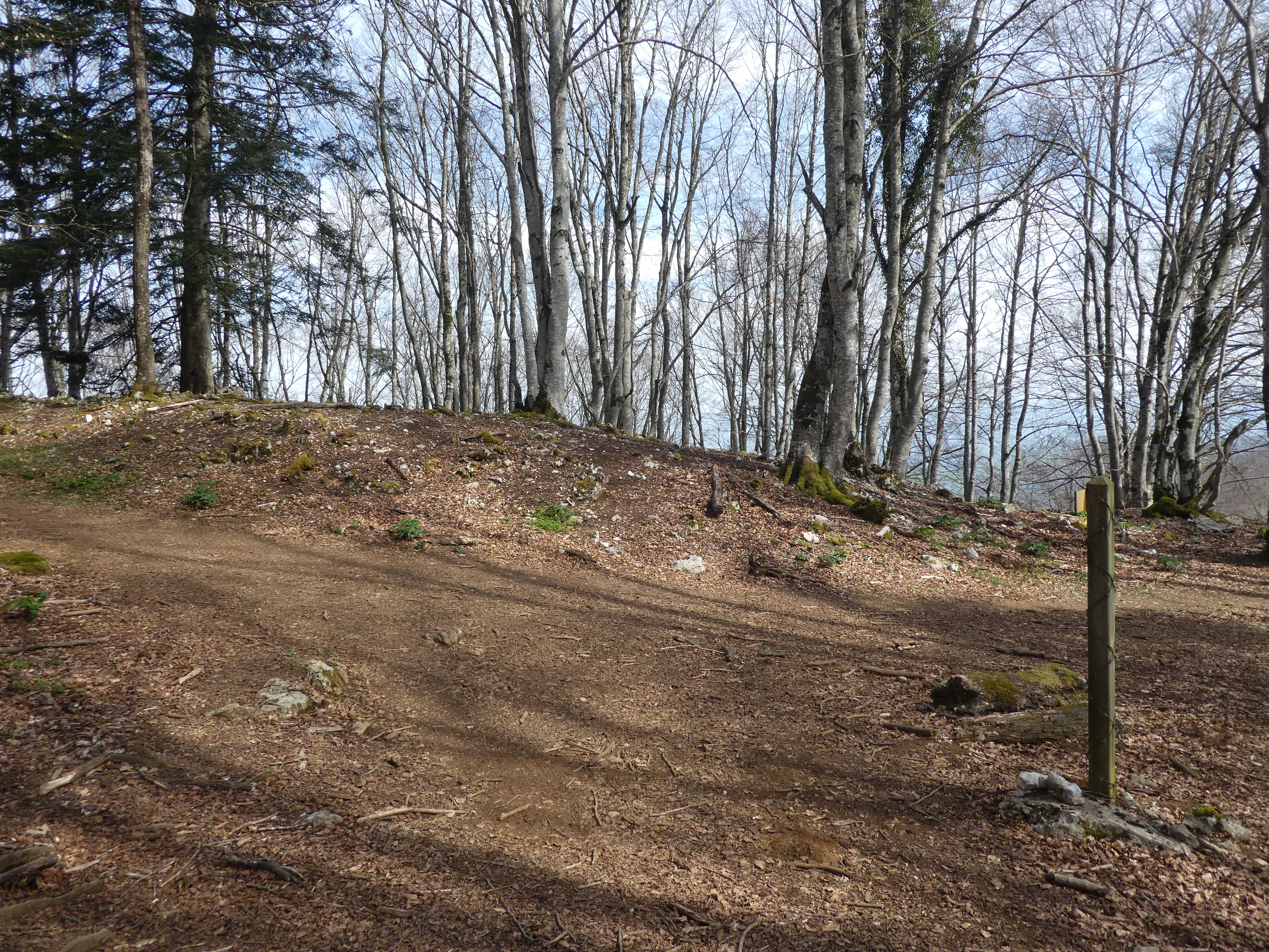 Rond Point d'Esquiou (1034 m) : suivre le large chemin partant tout droit puis celui partant sur la droite 50 mètres plus loin direction Pic de Labassère, balisé en rouge et blanc dorénavant (pour ceux qui ne voudraient pas faire l'aller-retour d'environ 1 heure au Pic de Labassère et aller directement au sommet du Monné, suivre le chemin partant sur la gauche balisé en rouge et blanc)