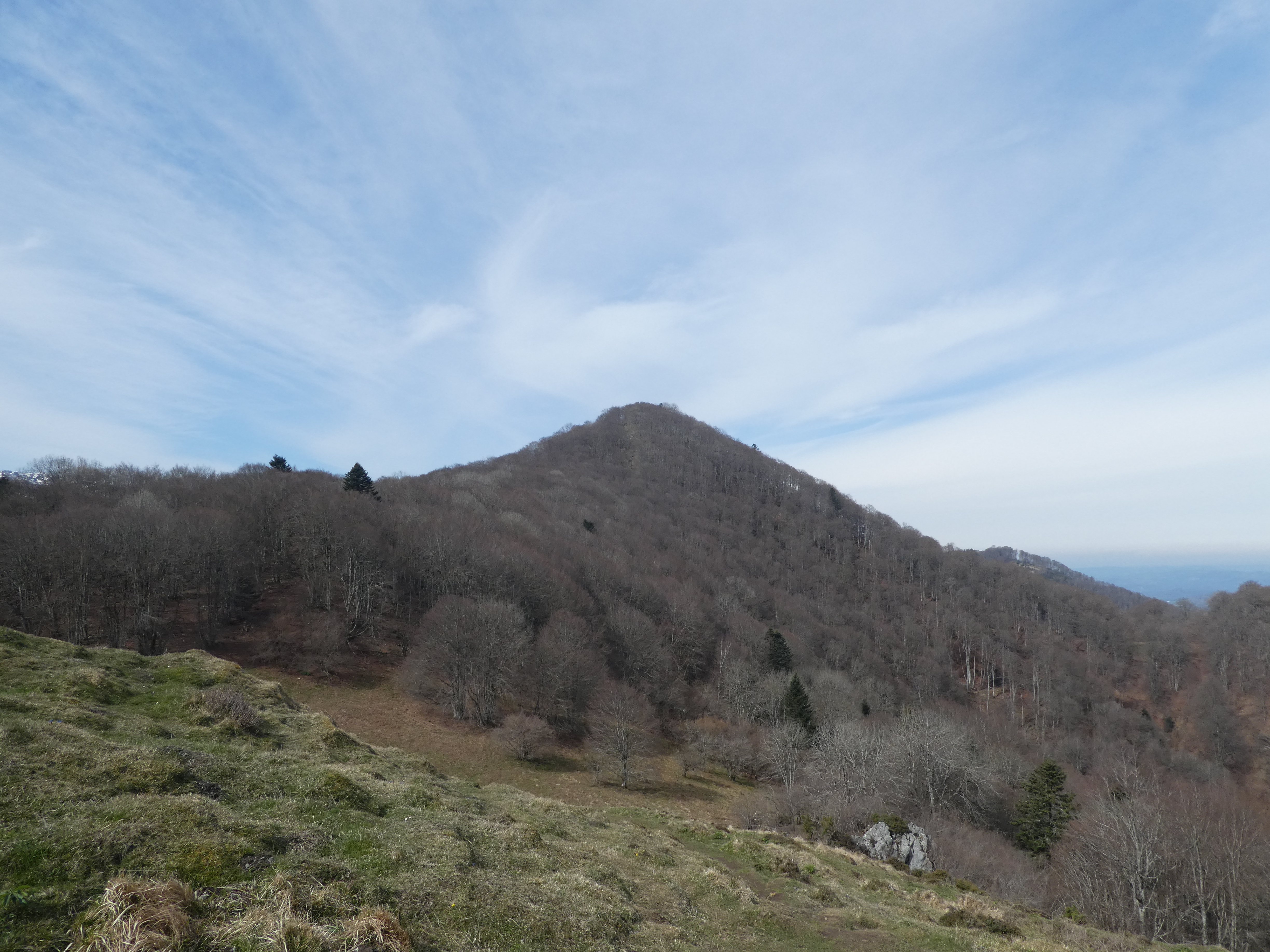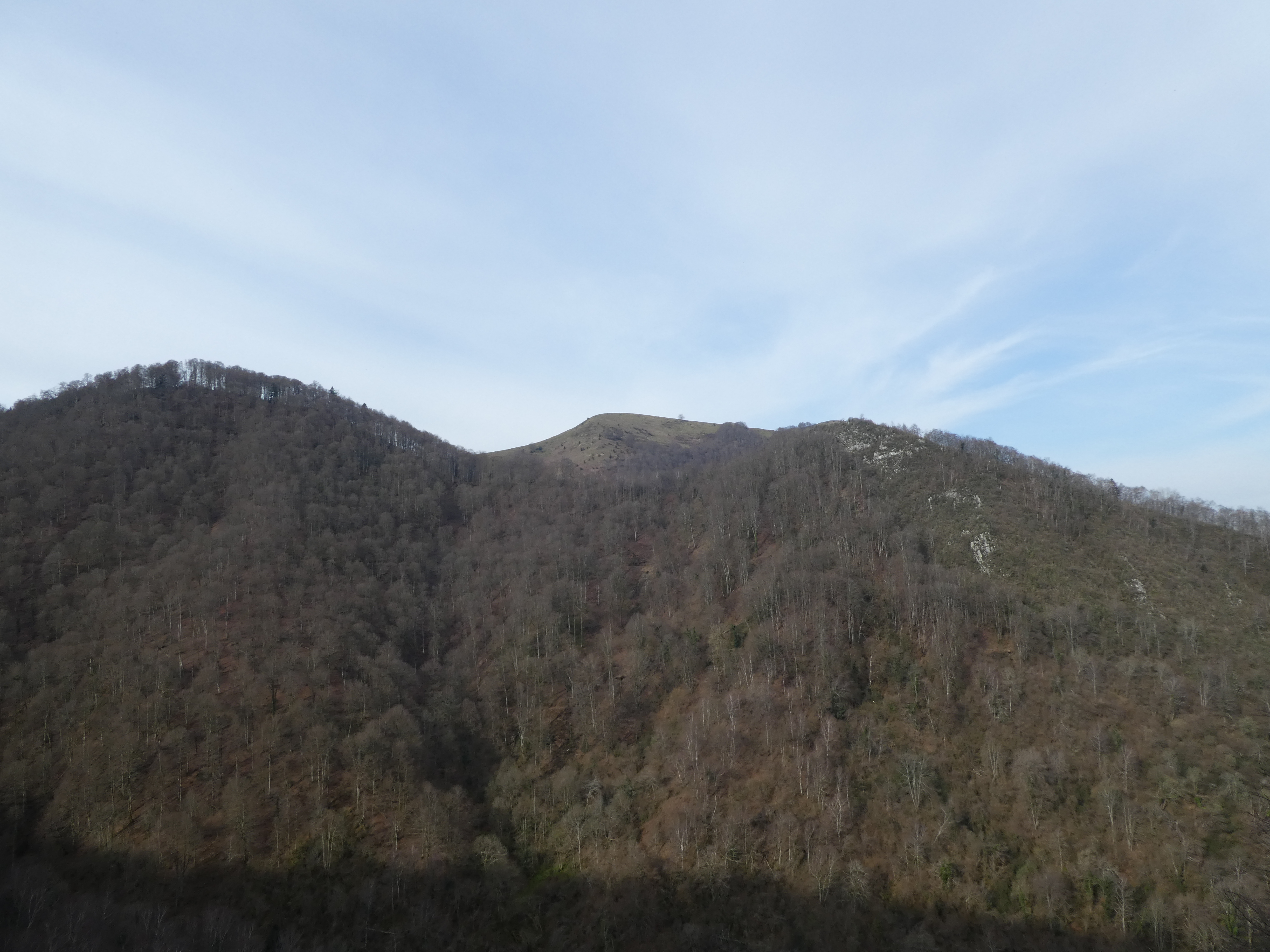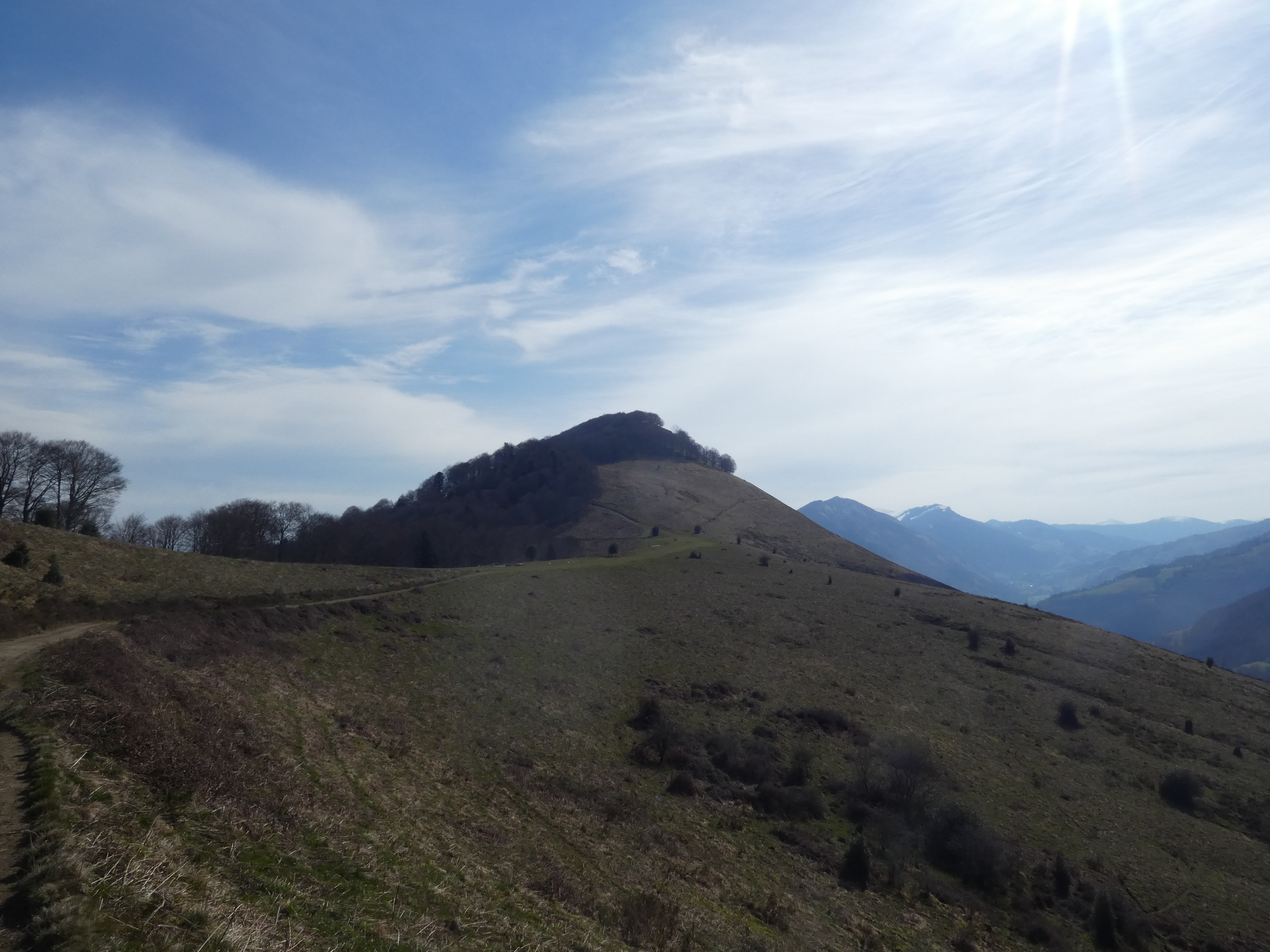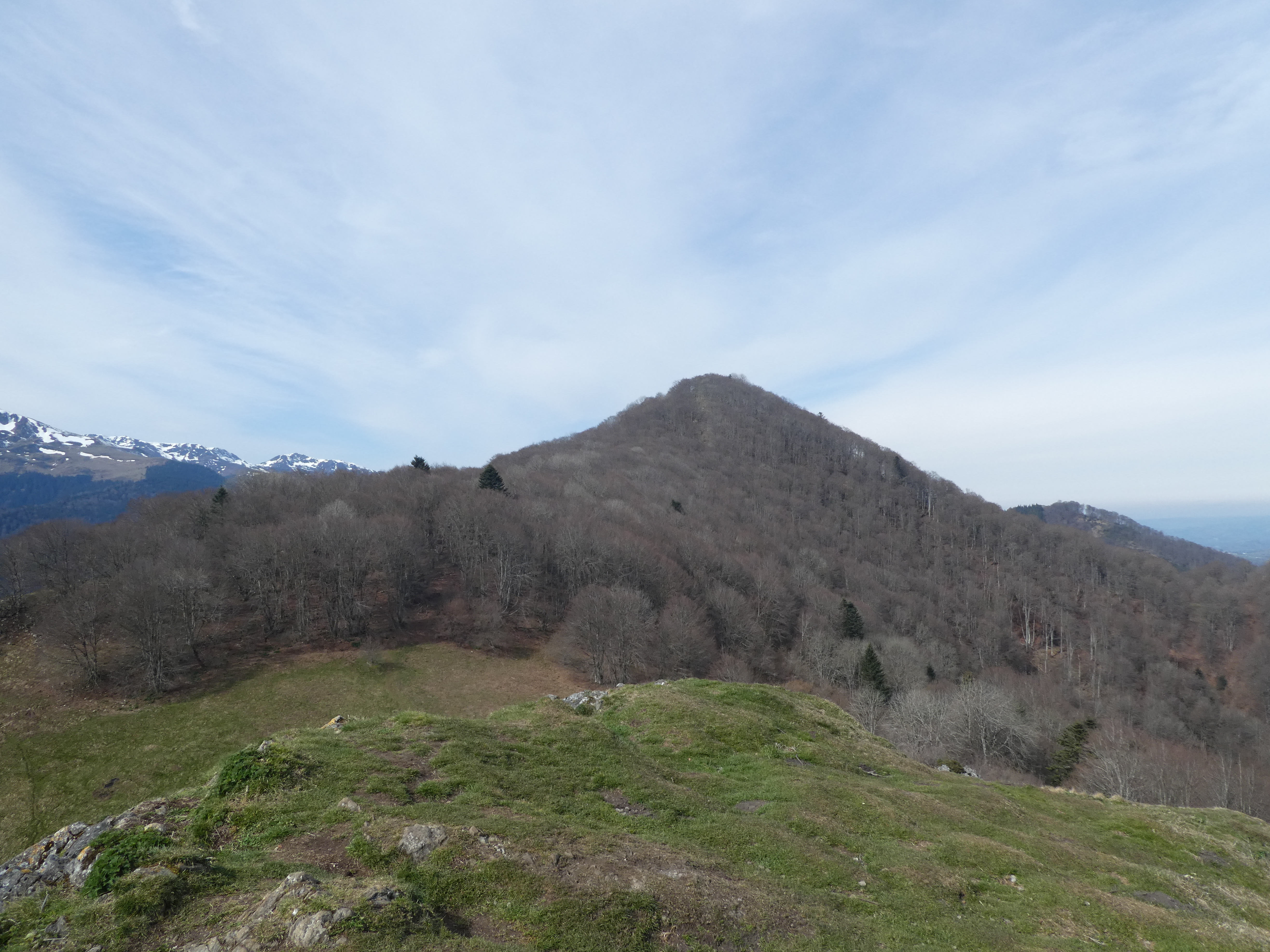 Arrivée au sommet du Monné (1269 m) : panorama réduit en raison de la présence d'arbres au sommet avec vue sur les massifs du Midi de Bigorre et du Montaigu