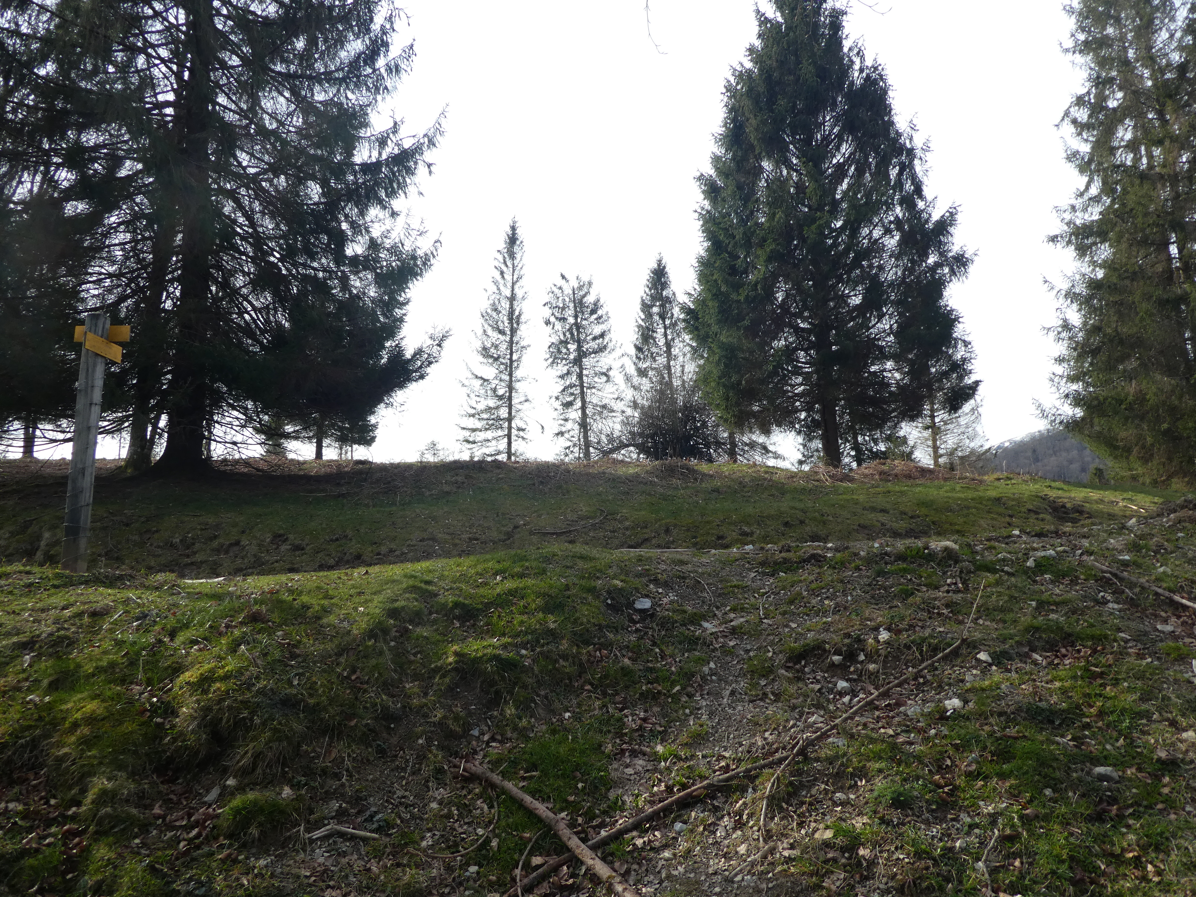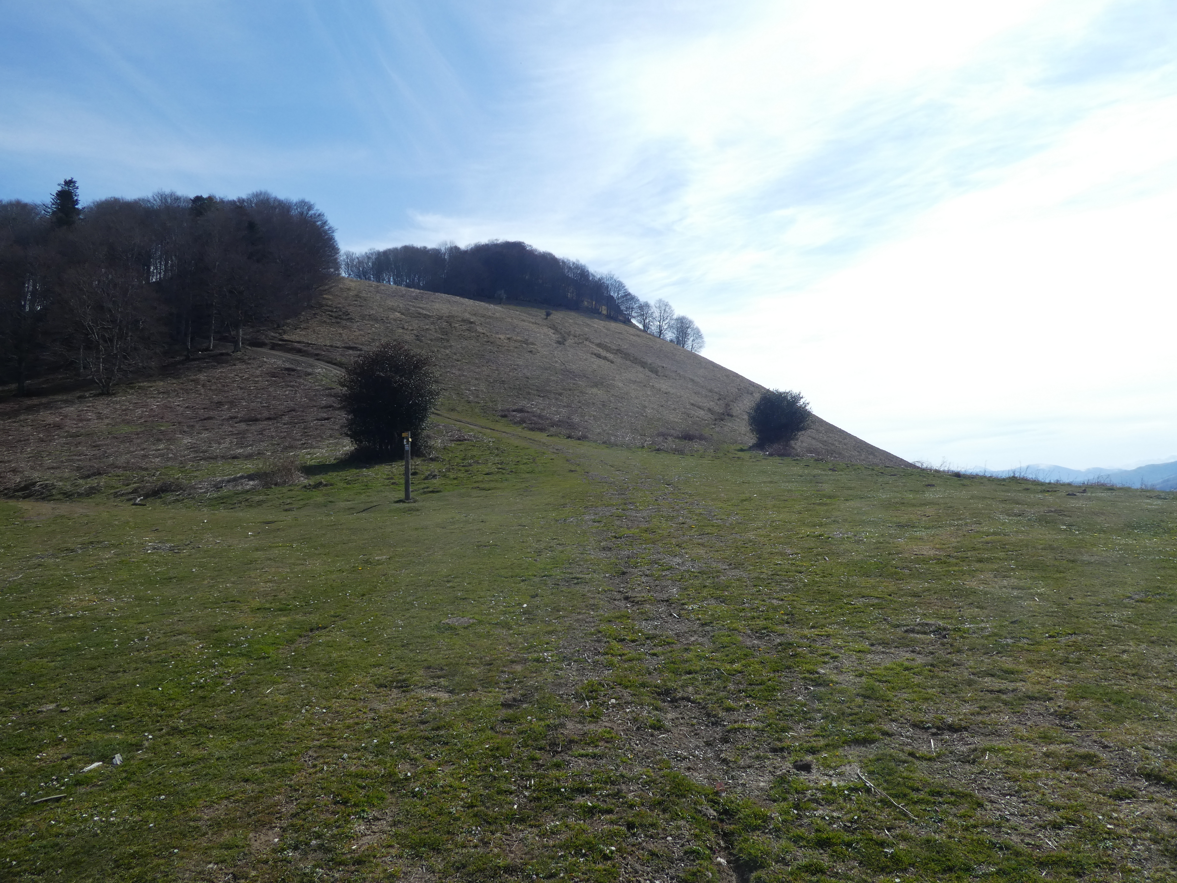 A ce croisement marqué par la présence d'un panneau directionnel (800 mètres après avoir quitté le sommet du Monné), suivre le chemin descendant sur la droite direction le Petit Monné, balisé en jaune