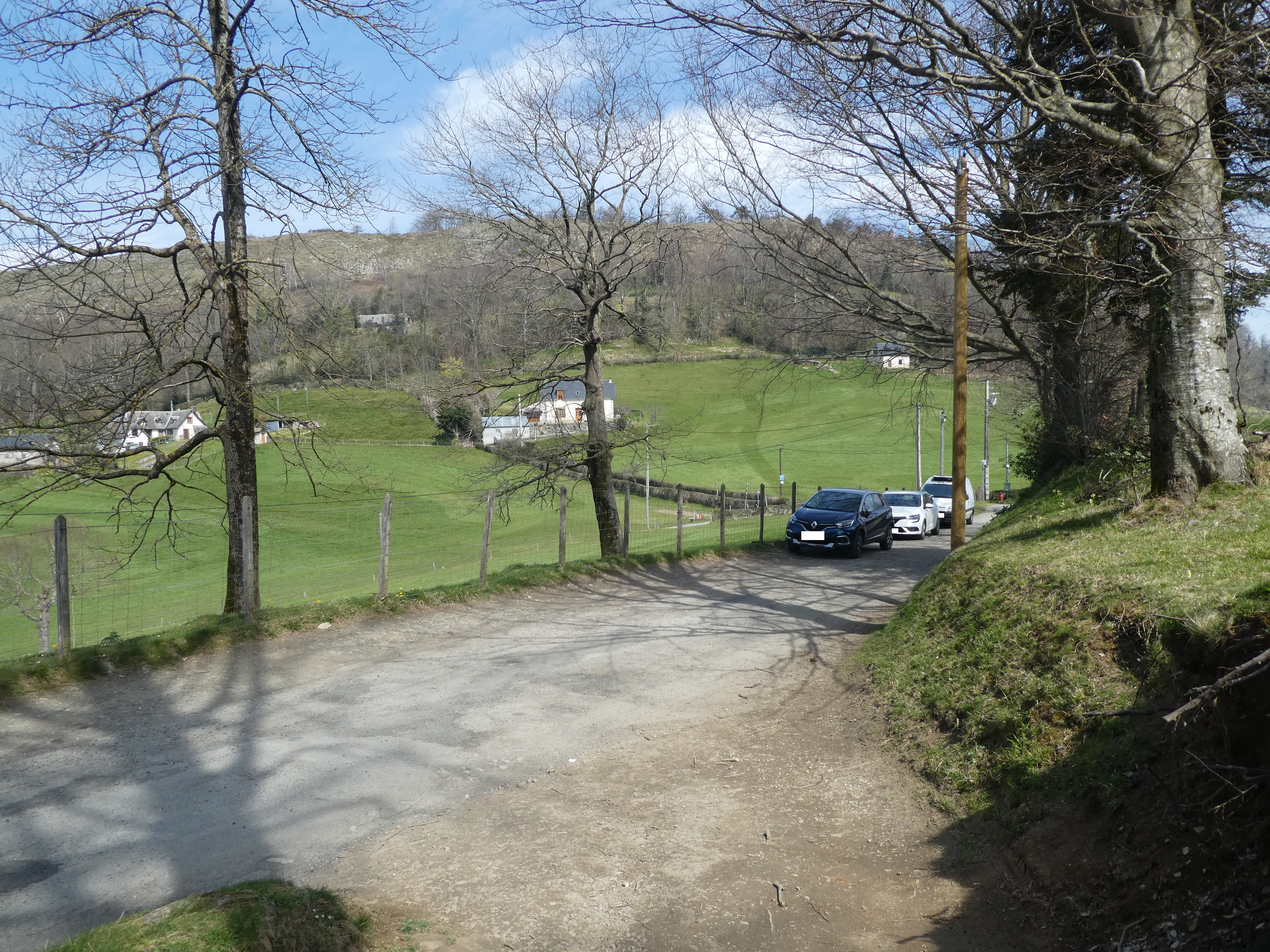 A ce croisement avec le chemin de montée vers le Pic de Labassère et marqué par la présence d'un panneau directionnel (800 mètres après le lieu-dit "Rond Point d'Esquiou") (1034 m), quitter le GR78 partant légèrement sur la gauche pour suivre le chemin partant de biais sur la droite direction Pic de Labassère, aucun balisage dorénavant