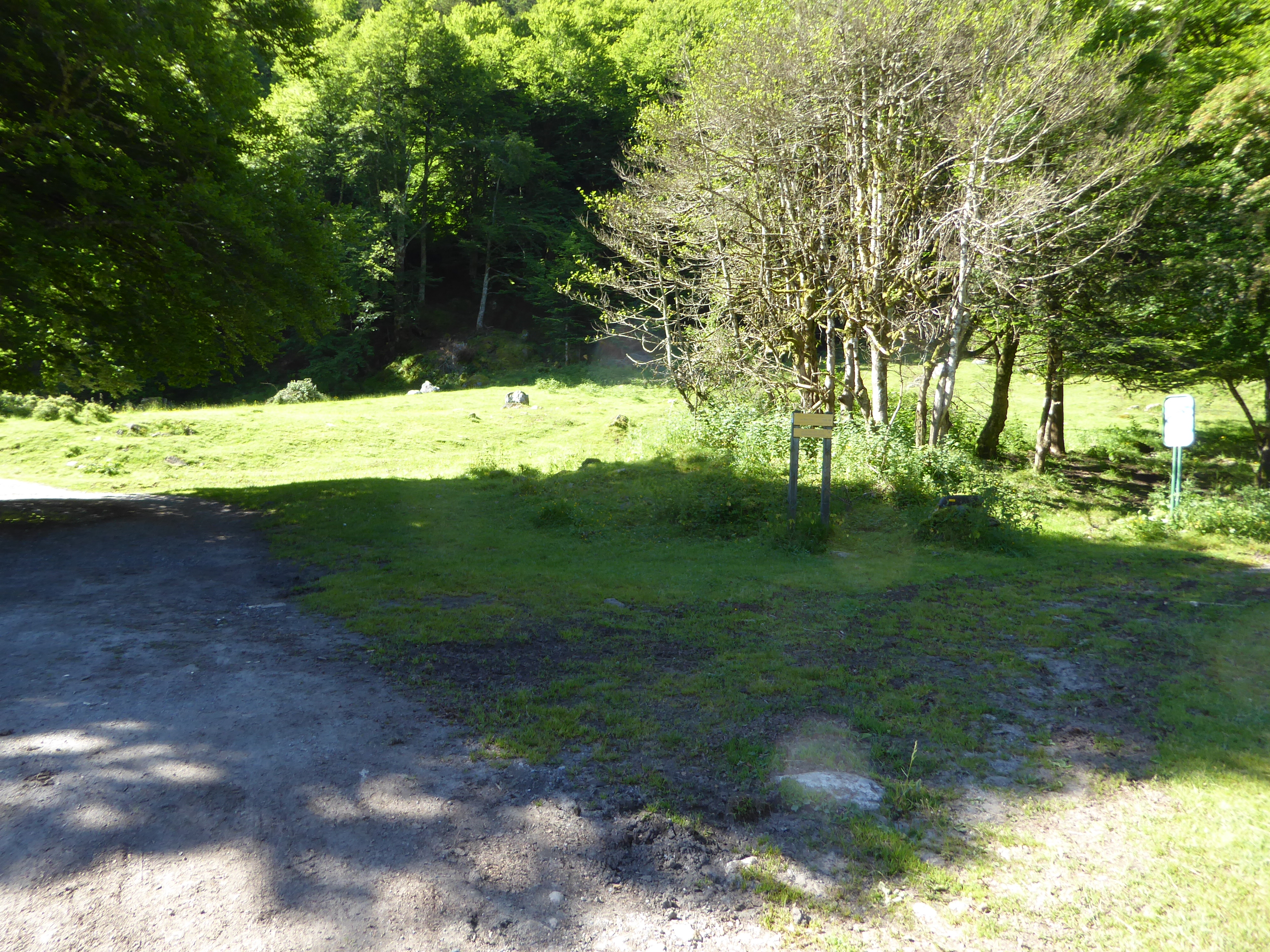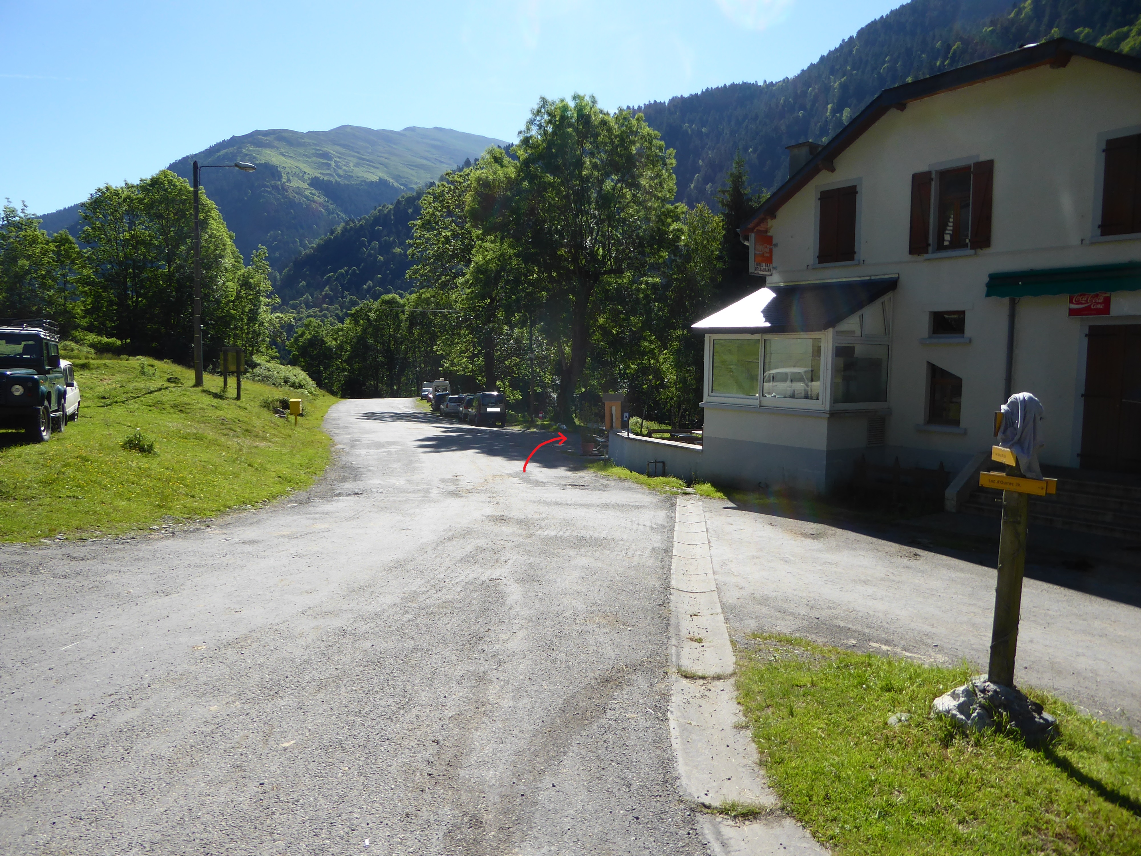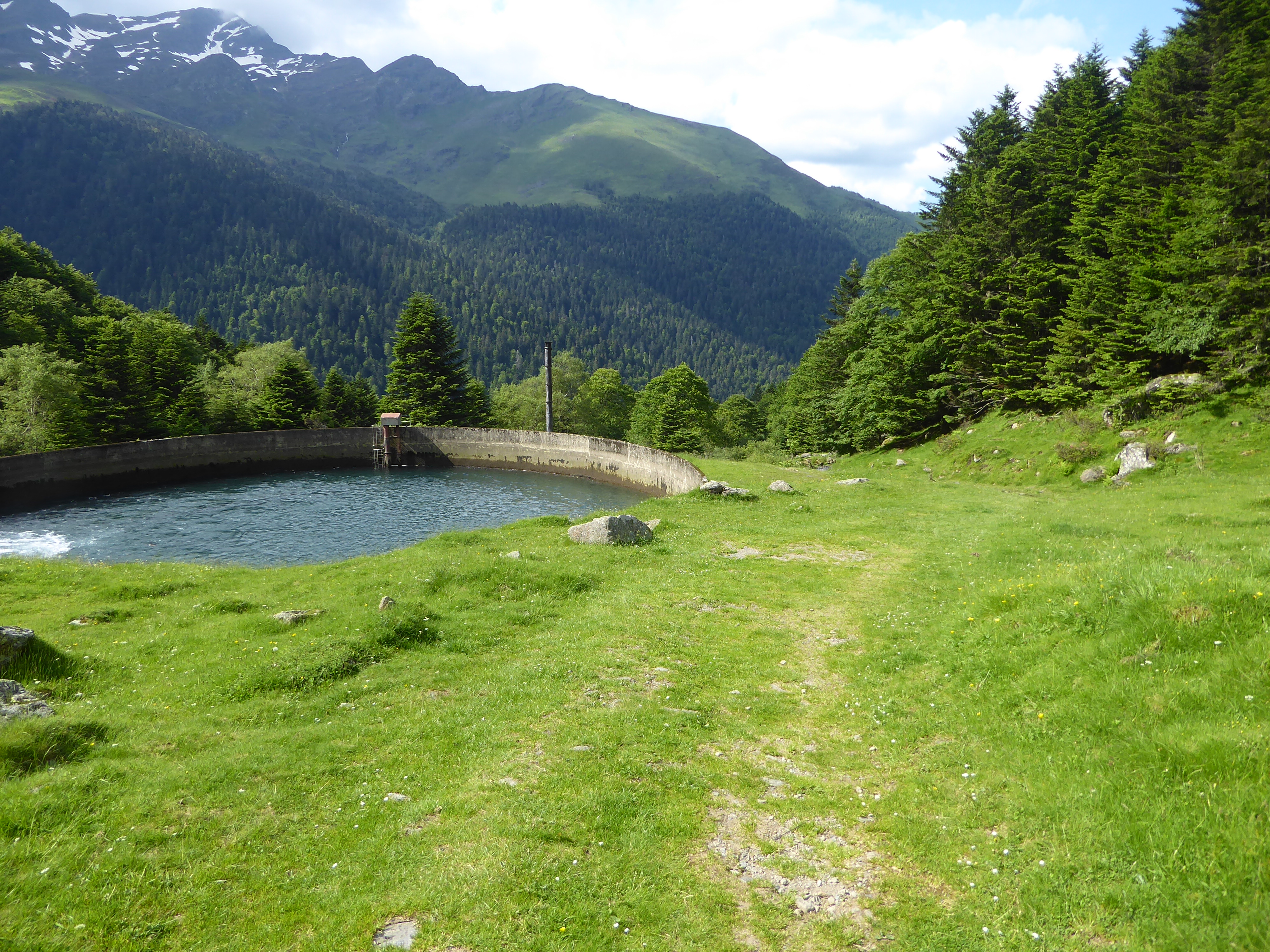 Bassin d'eau (1271 m) : continuer à suivre le chemin partant tout droit et remontant le Vallon du Lhécou direction Lac Bleu, balisé en jaune