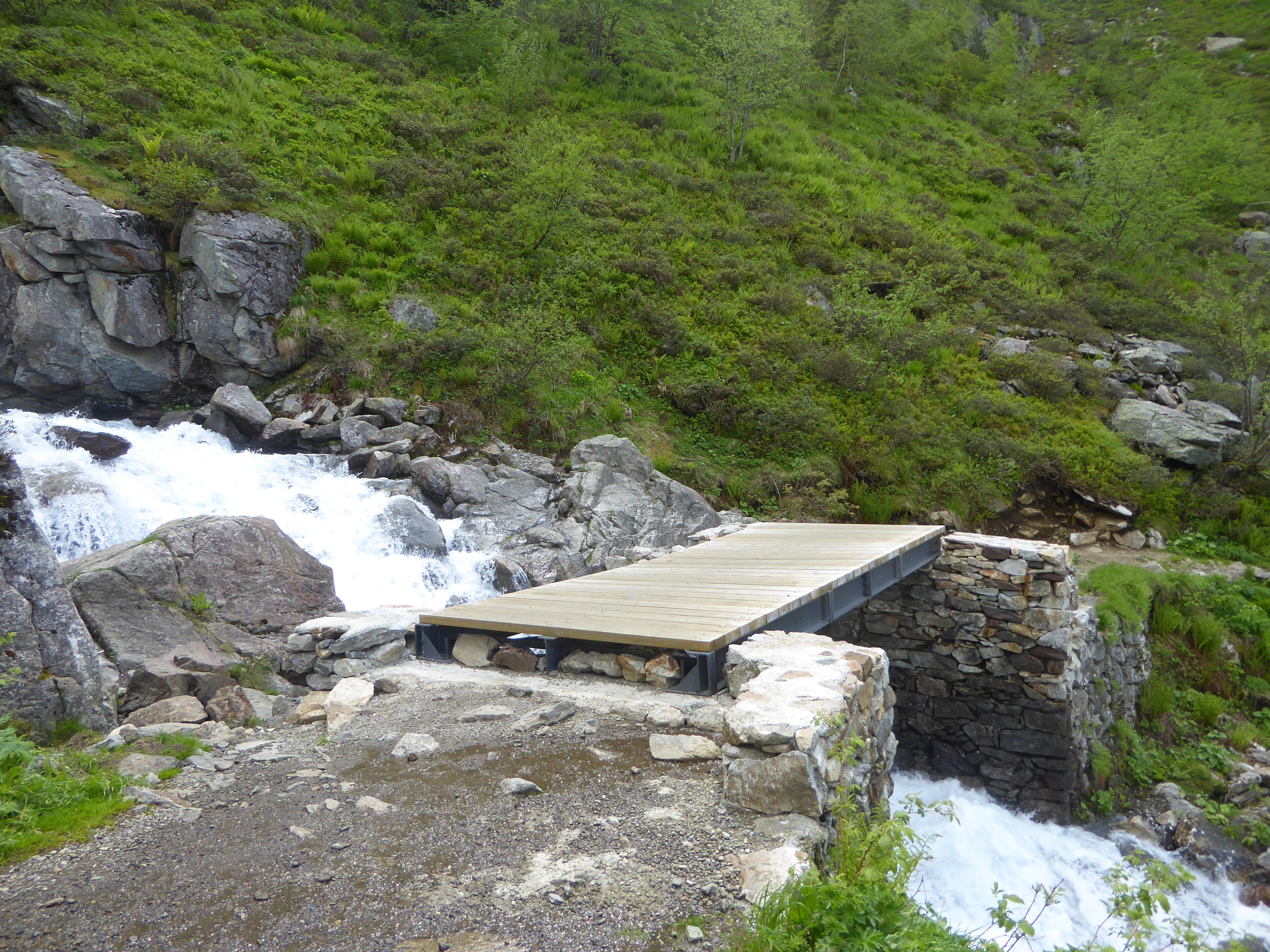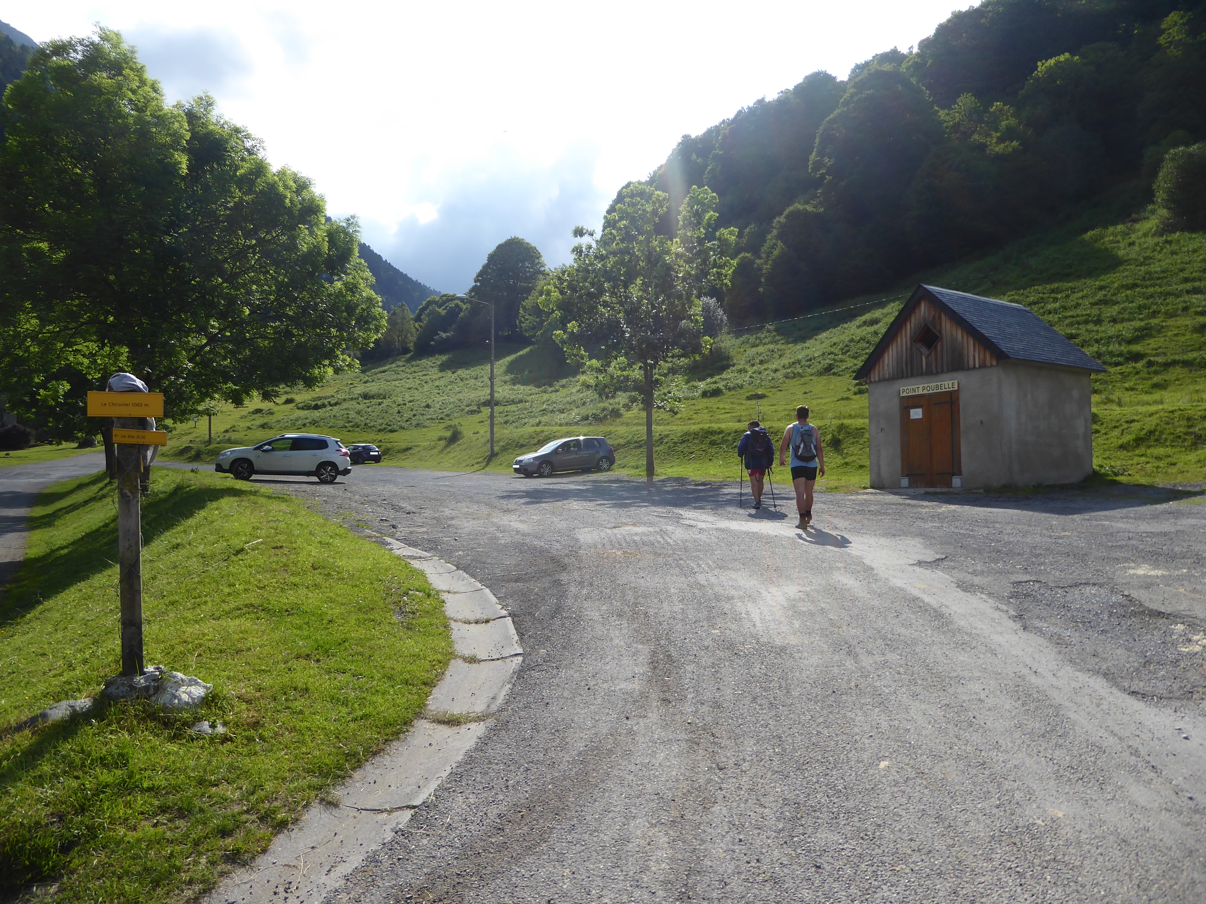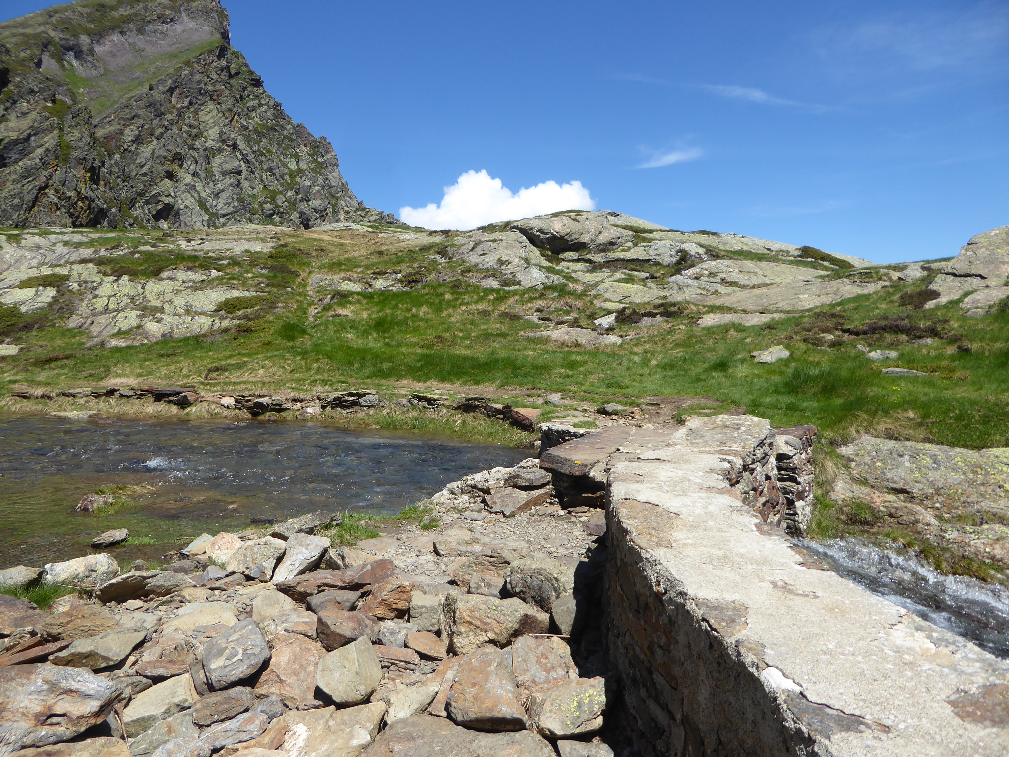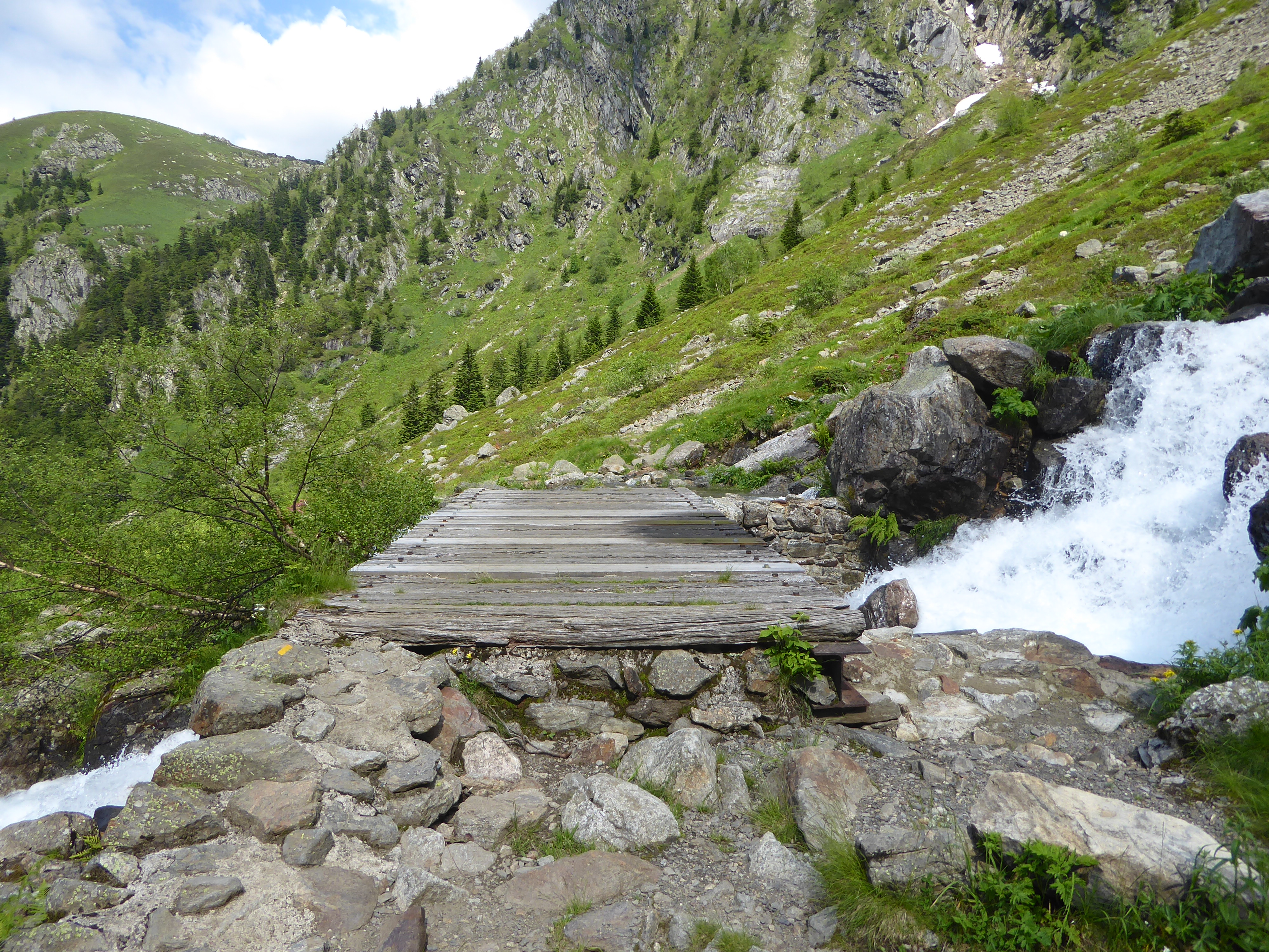 Passerelle (1669 m) : continuer à suivre le chemin qui descend le Vallon du Lhécou direction le Chiroulet, balisé en jaune