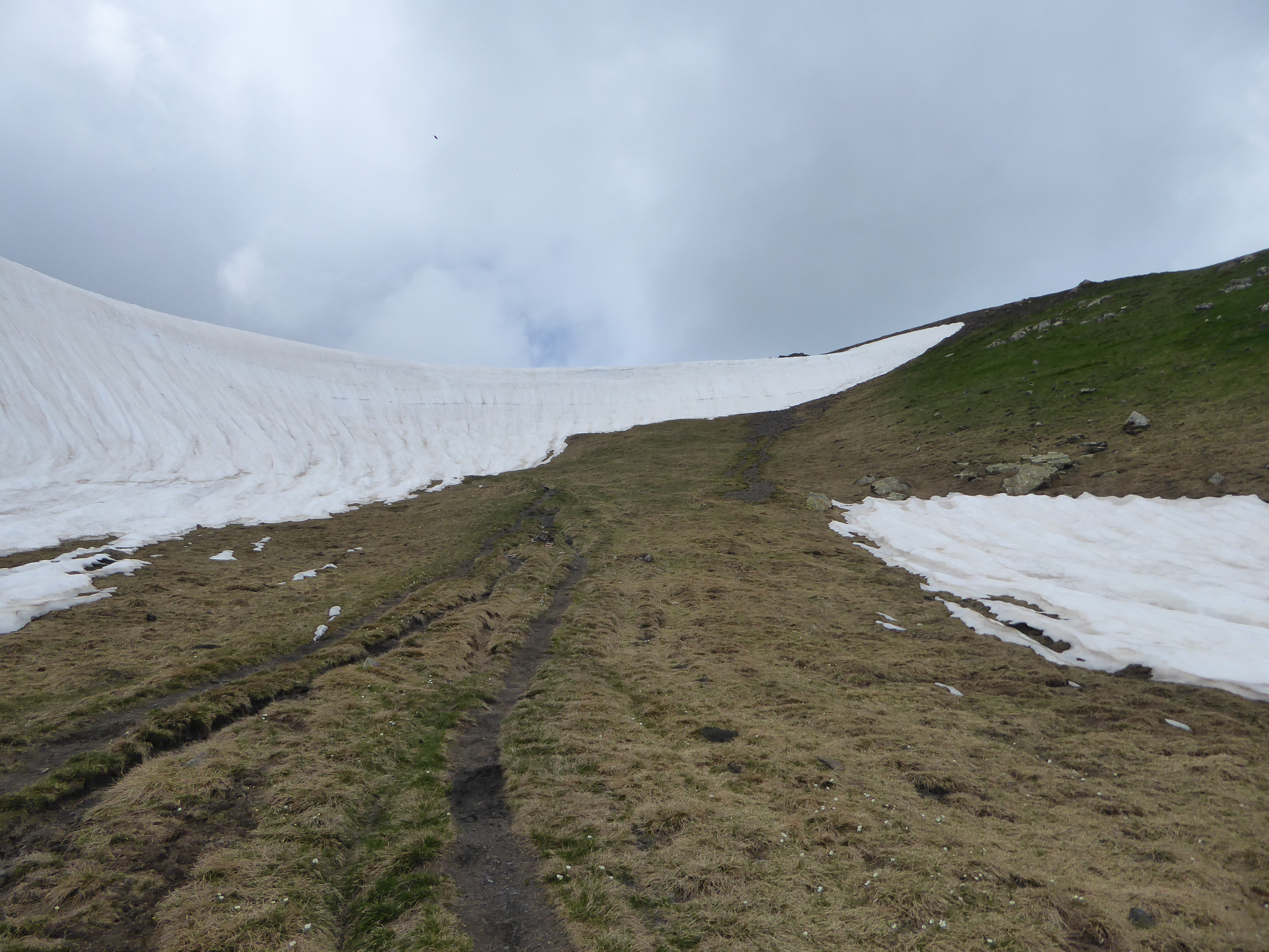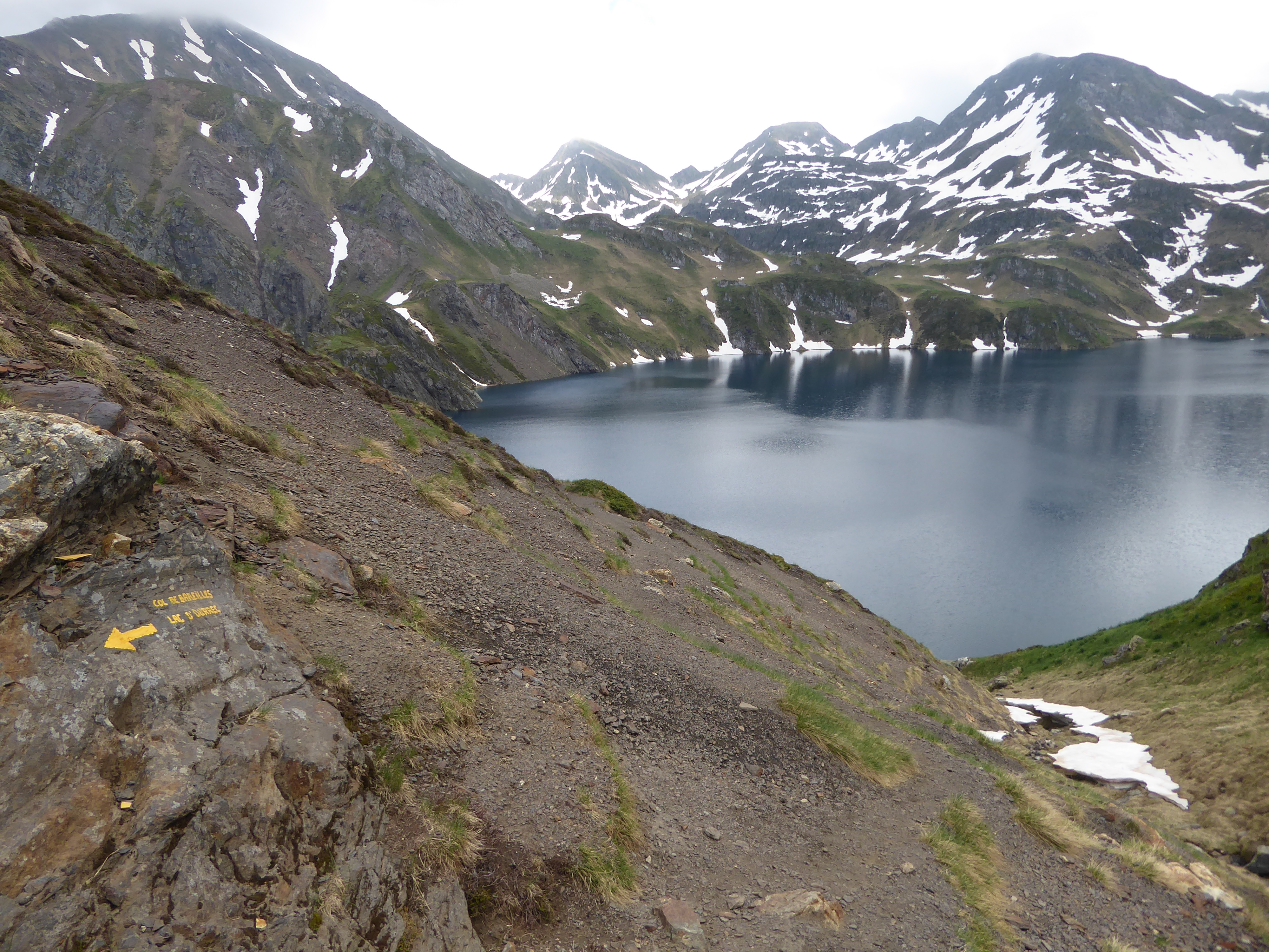 A ce croisement avec le chemin faisant le tour du lac, suivre le chemin partant sur la droite direction Col de Bareilles, balisé en jaune (encore des névés en ce début de saison)